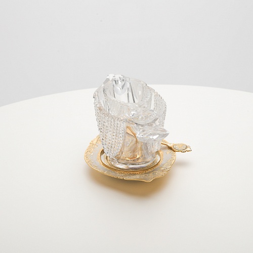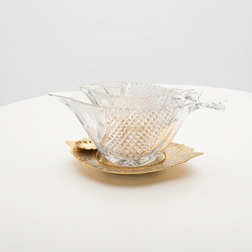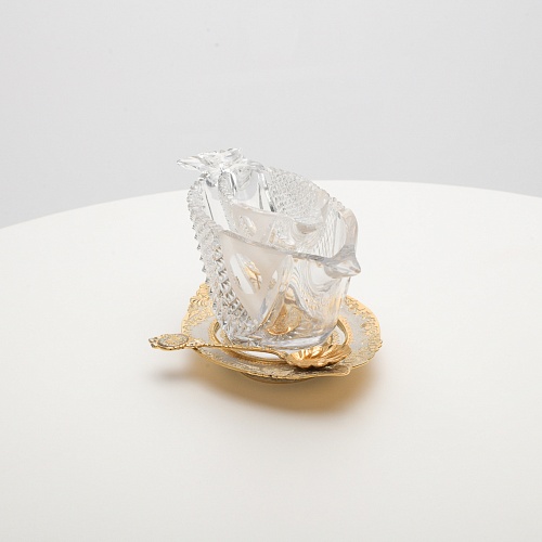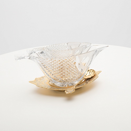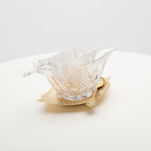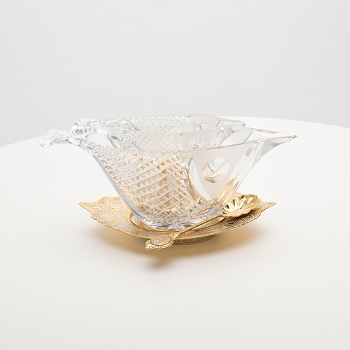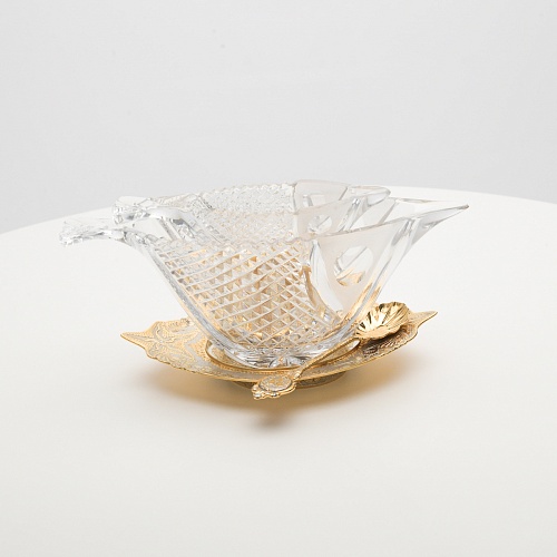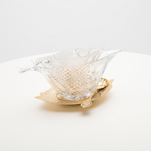 В набор икорницы для черной икры входят: хрустальная чаша с трапециевидным дном для икры, хрустальная чаша для льда, ложечка, подставка для икорницы из металла, подставка для чаши под лед. Подставки и ложечка выполнены в технике златоустовской гравюры на металле, декорированы сюжетами на морскую тематику.