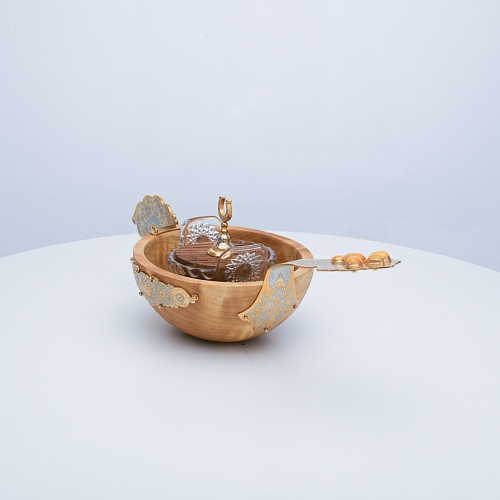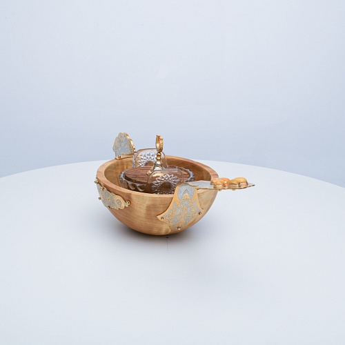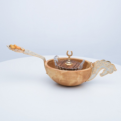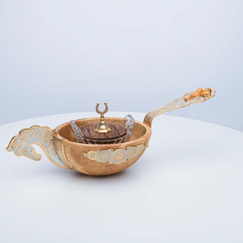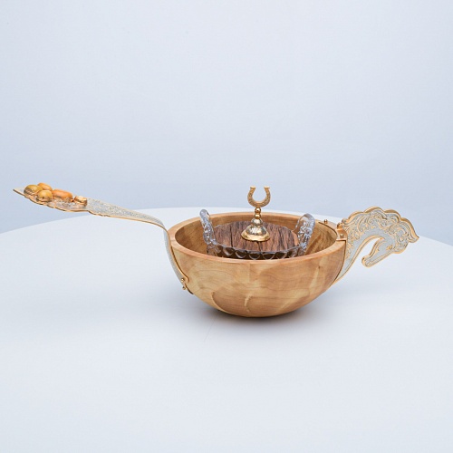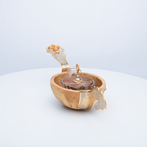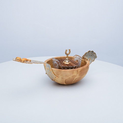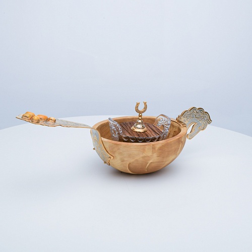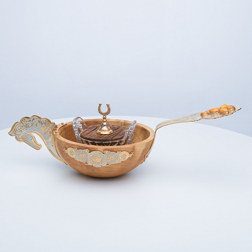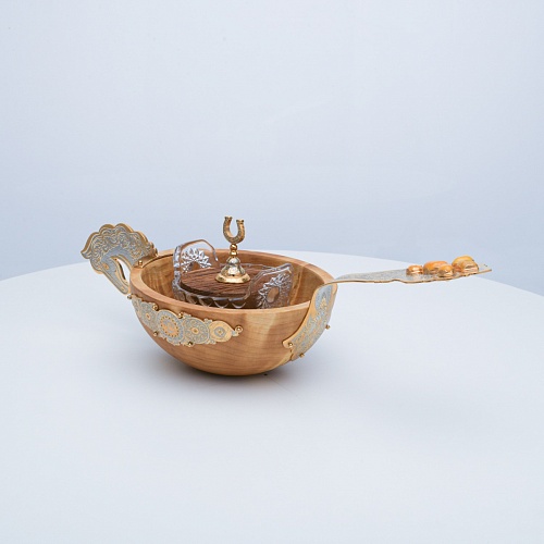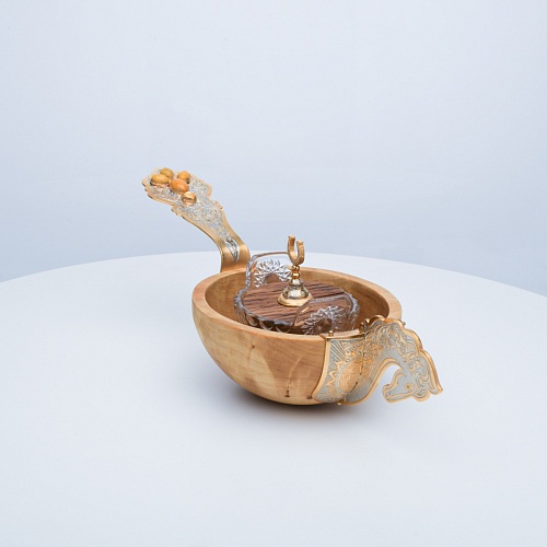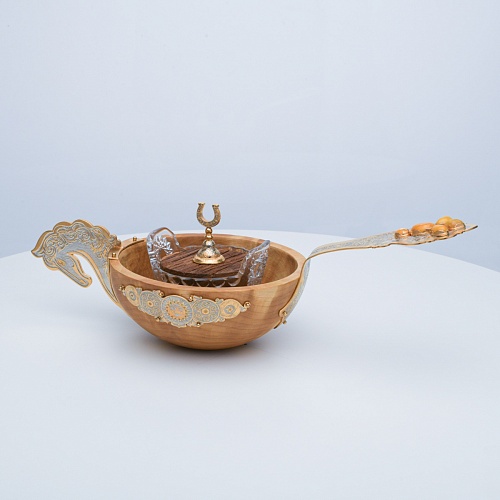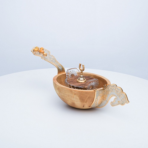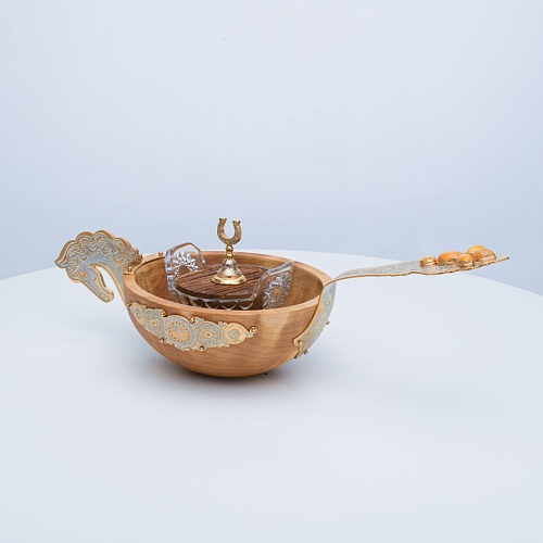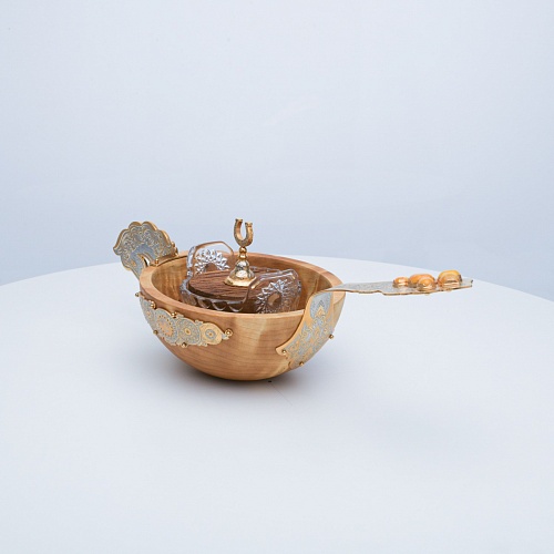 Икорница "Ладья" создана в стиле славянской мифологии и солярной символики. В набор икорницы для красной или черной икры входят: стеклянная чаша для икры с крышечкой и навершием в виде счастливой подковы, а также деревянная чаша для льда в виде братины.