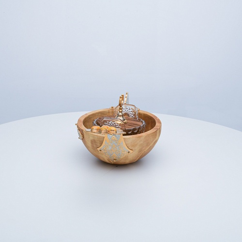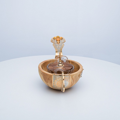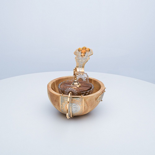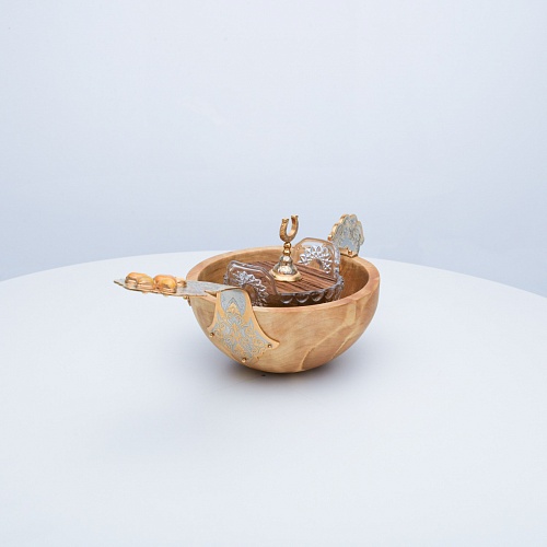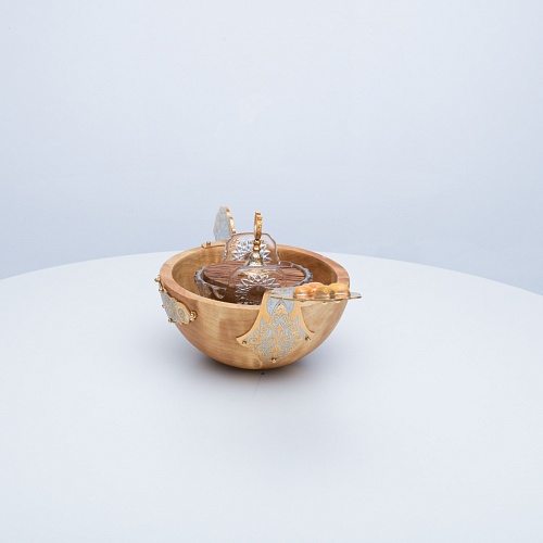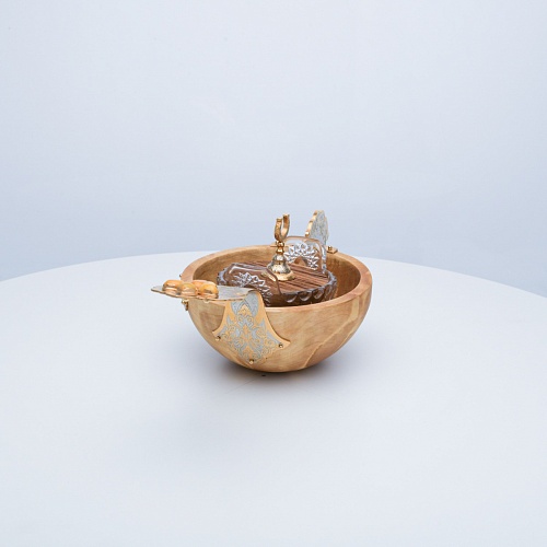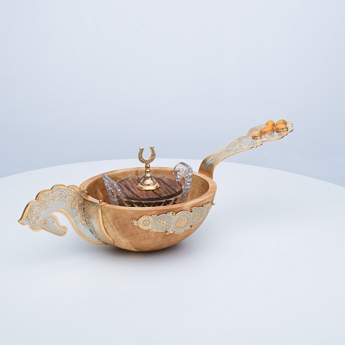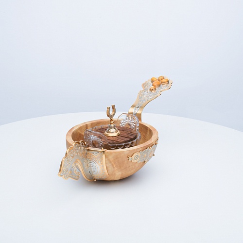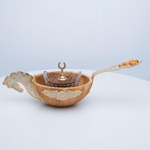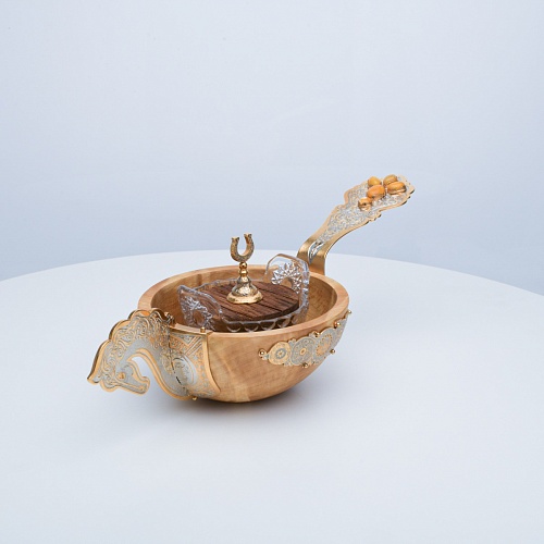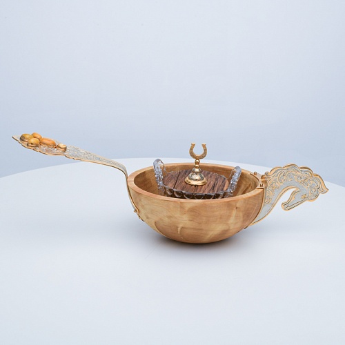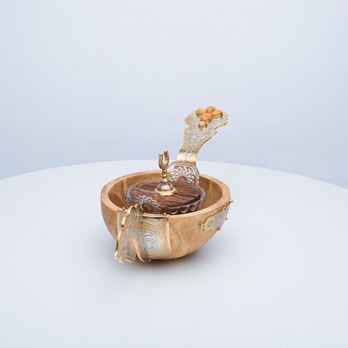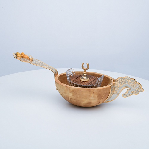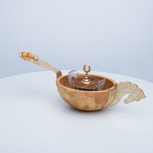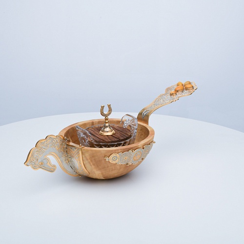 Икорница "Ладья" создана в стиле славянской мифологии и солярной символики. В набор икорницы для красной или черной икры входят: стеклянная чаша для икры с крышечкой и навершием в виде счастливой подковы, а также деревянная чаша для льда в виде братины.