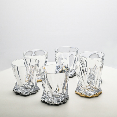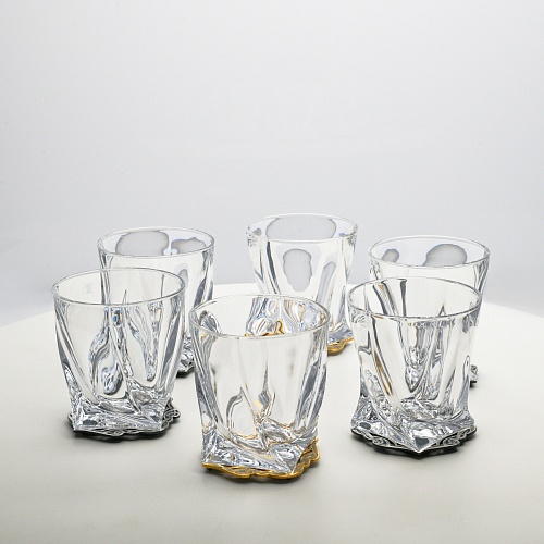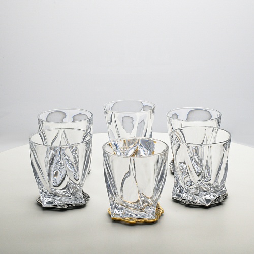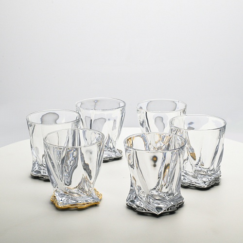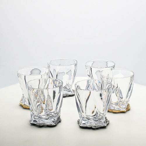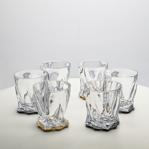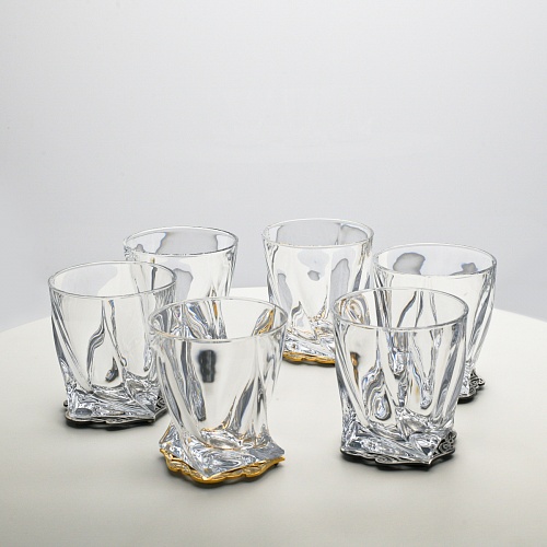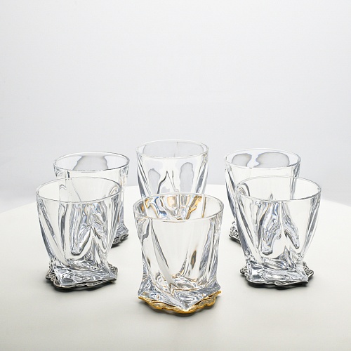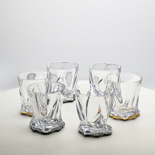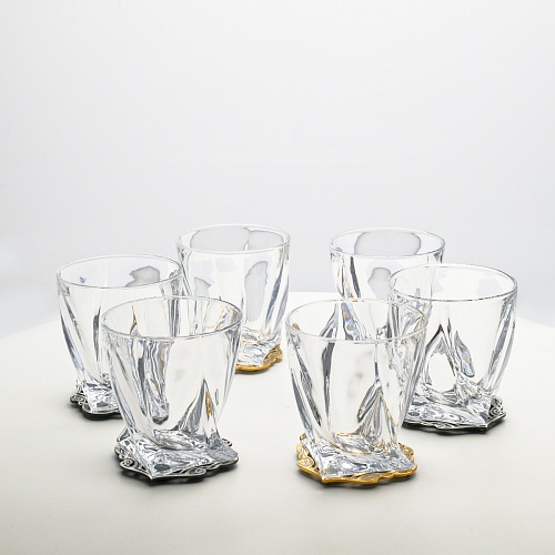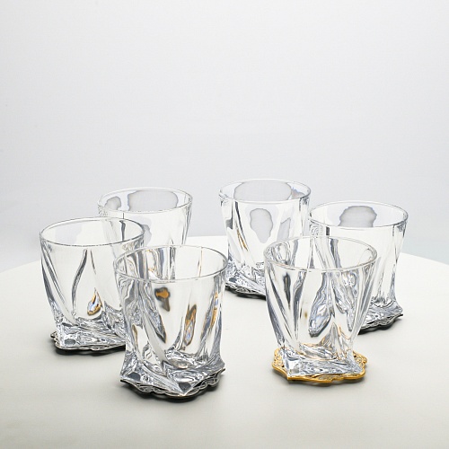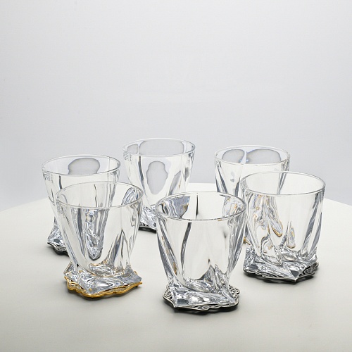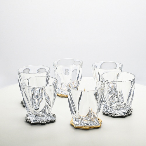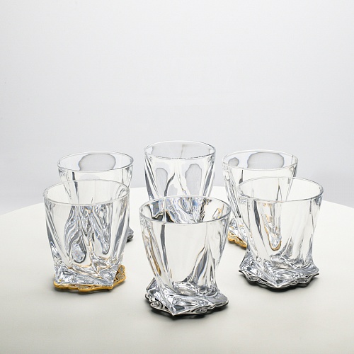 Несмотря на то, что весь набор выполнен из качественного стекла и желтого металла с долговечным золотым и серебряным покрытием, он требует соблюдения правил по уходу. Бокалы и блюдо нельзя мыть в посудомоечной машине. Не следует подвергать их длительному воздействию агрессивной среды (кислые жидкости, жесткая вода, абразивные материалы) и резким температурным перепадам. Мойте бокалы и блюдо по отдельности в теплой воде, не применяя бытовую химию и грубые губки. Мокрую посуду не стоит оставлять сохнуть, ее надо аккуратно вытереть мягкой тканью (лучше из натуральных материалов).