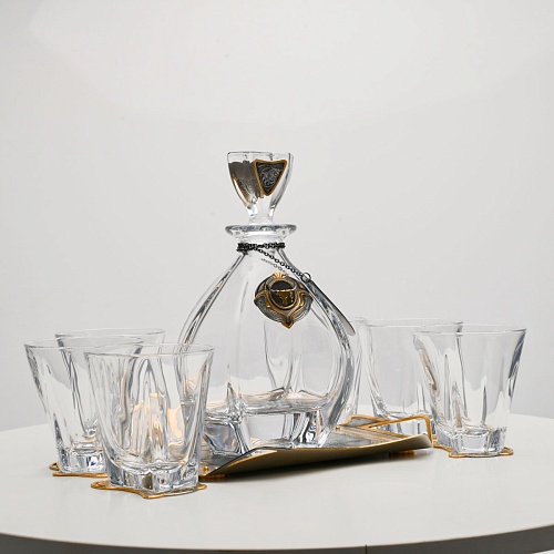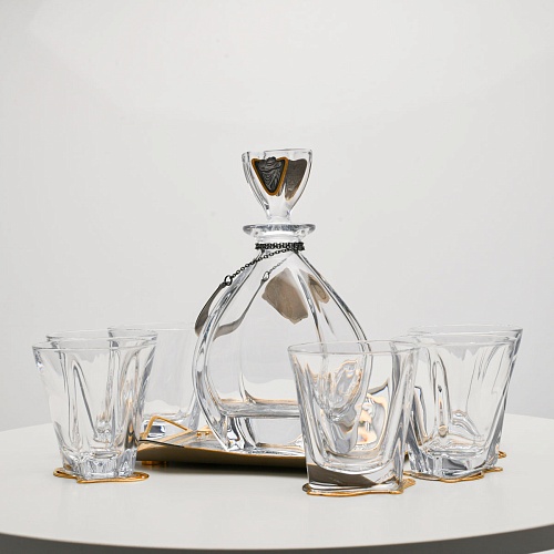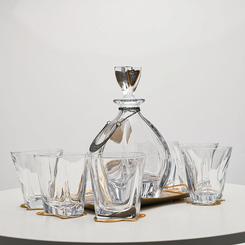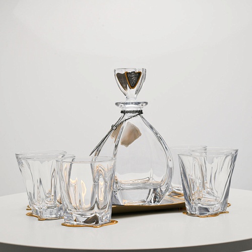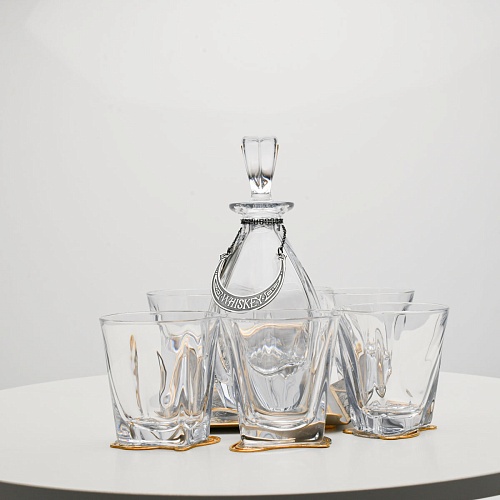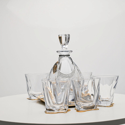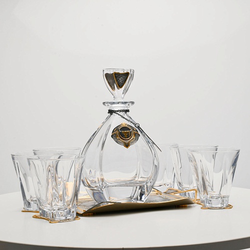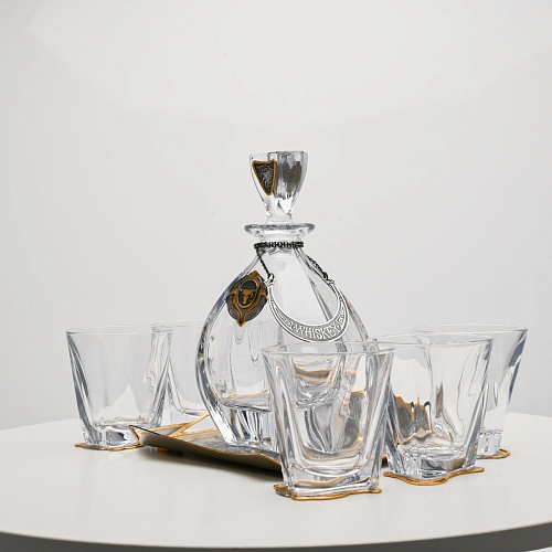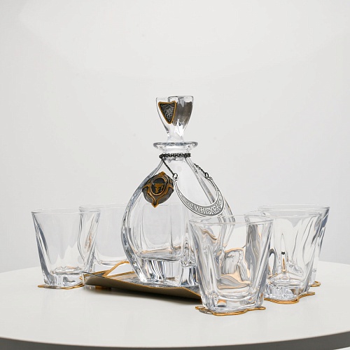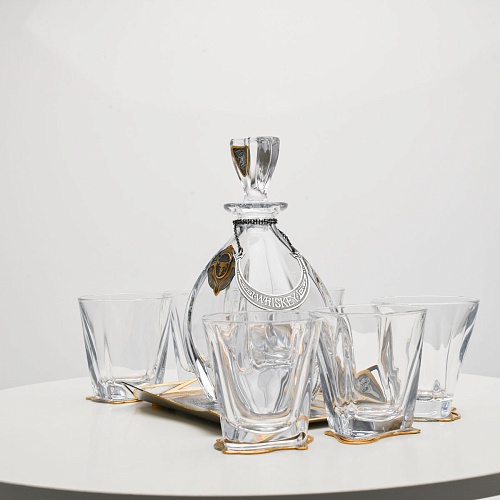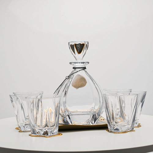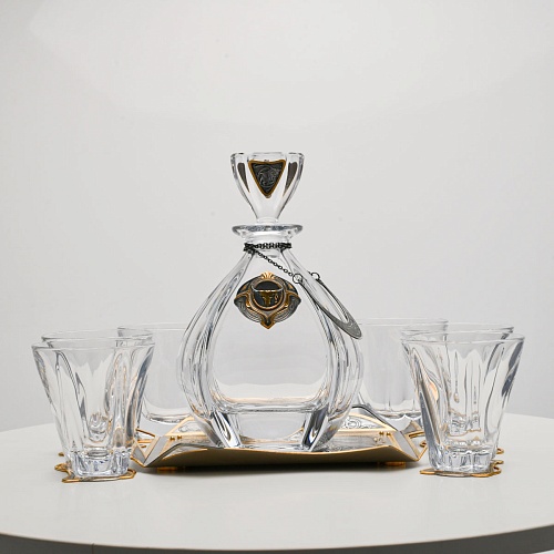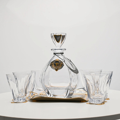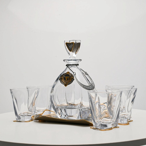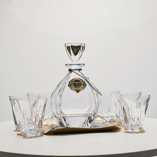 Поднос, шесть бокалов и штоф 750 мл из высококачественного богемского стекла, оформленные на металлических подставках. Основание каждого бокала и штофа, а также пробка декорированы в едином художественном стиле, посвященном природной теме. Прозрачное стекло граненых книзу бокалов и штофа позволит в полной мере насладиться цветом и вкусом дорогого виски. Когда бокал будет пуст, на дне бокала причудливым образом откроется задумка художника – можно будет увидеть ковбоя или сцену родео, которые запечатлены на металлической подставке.