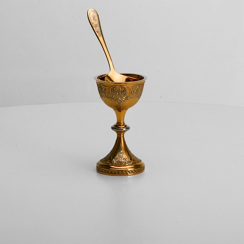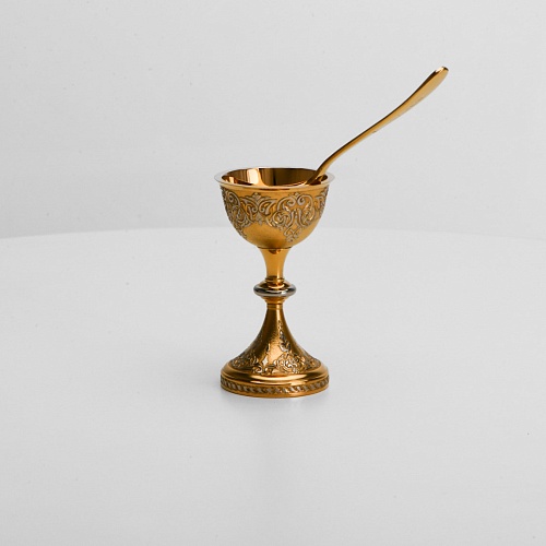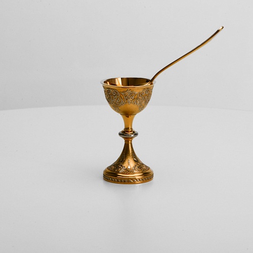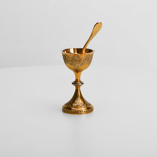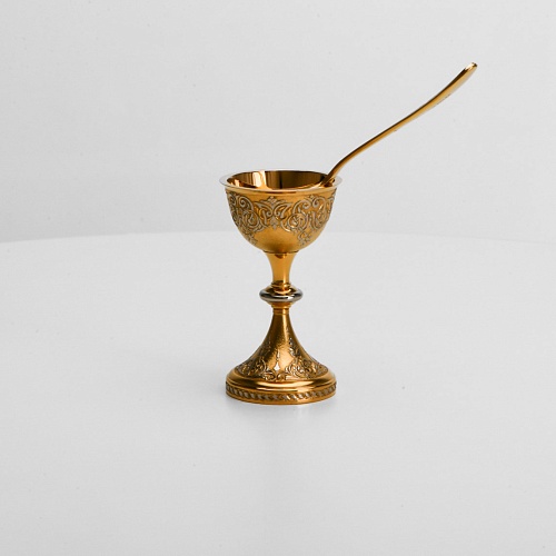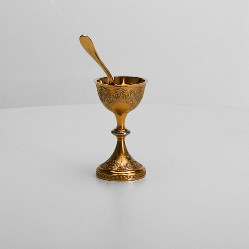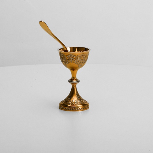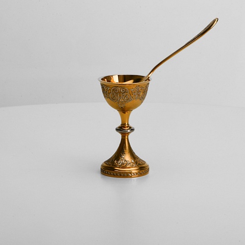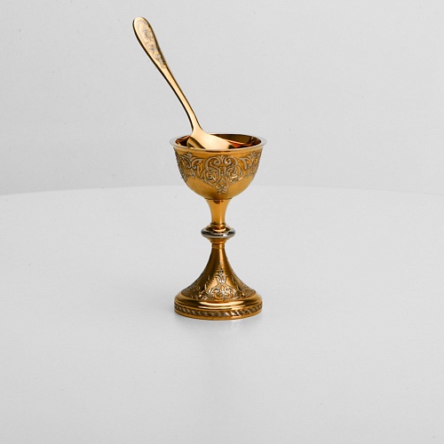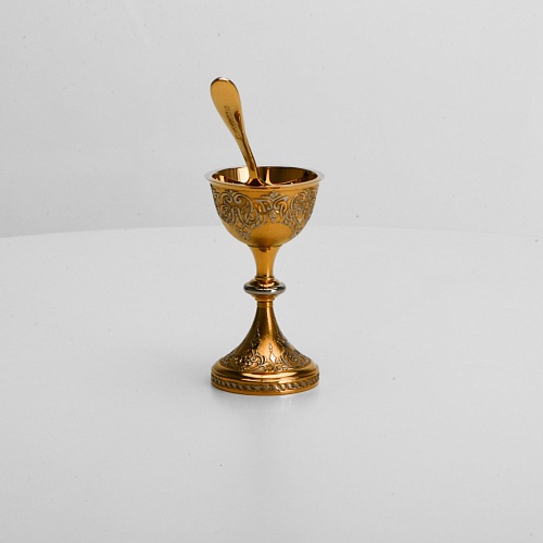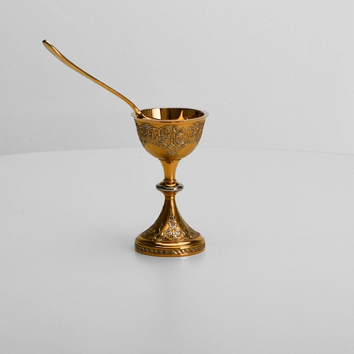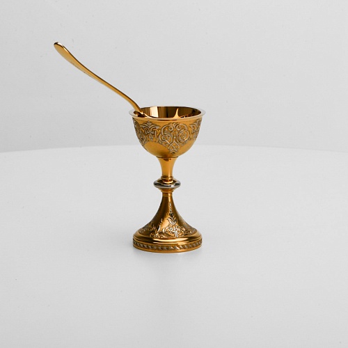 Пашотница имеет форму небольшой рюмочки на ножке. Основание и боковые стороны пашотницы и ложечки украшены растительным орнаментом.