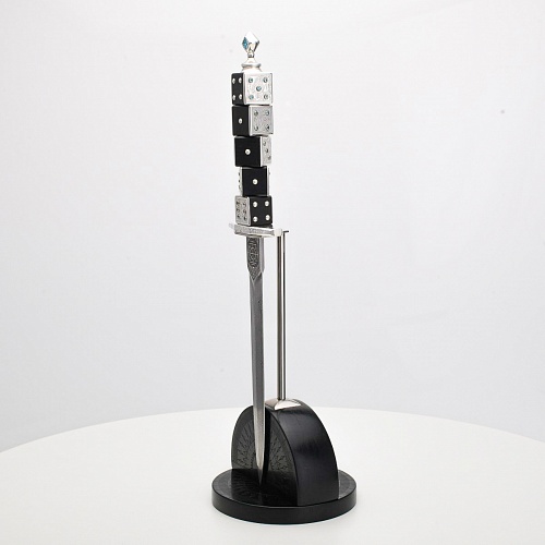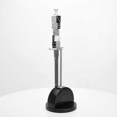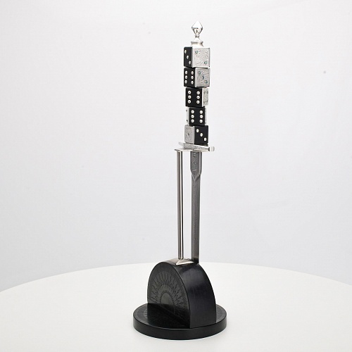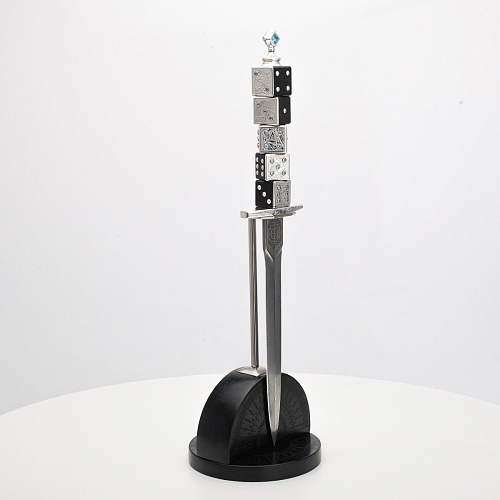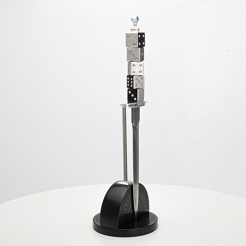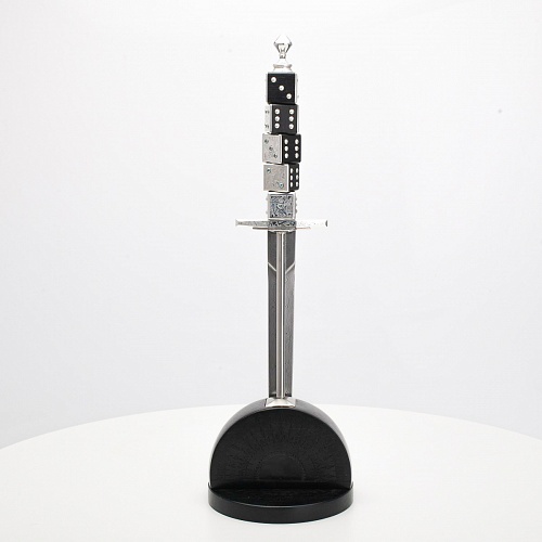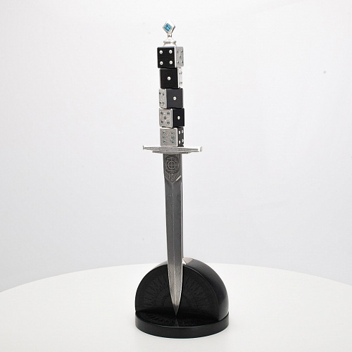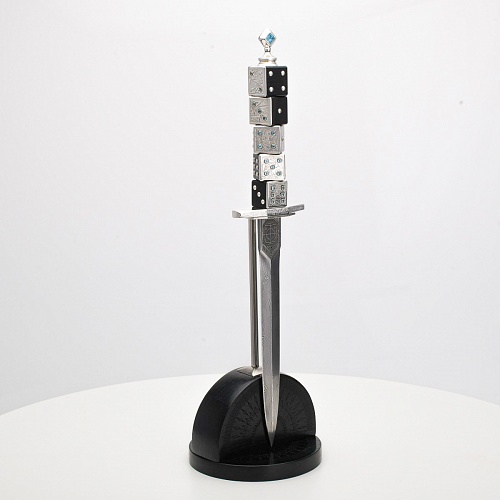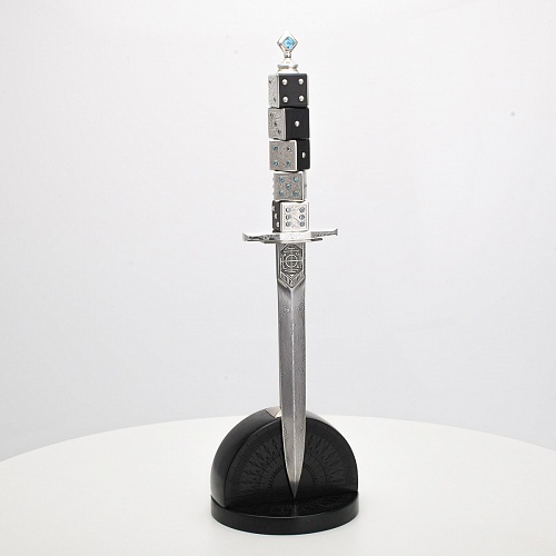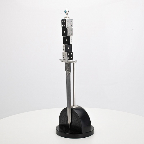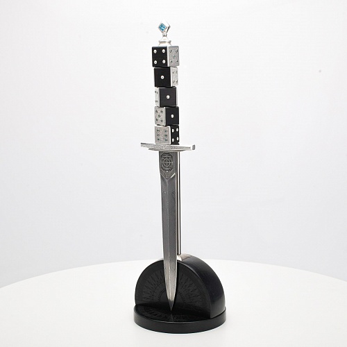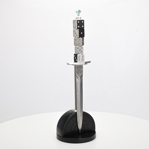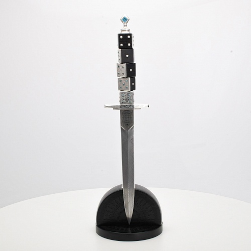 Постамент полукруглой формы выполнен из стабилизированного черного граба, украшен тонкой гравировкой по дереву. Игральные кости в виде кубиков на рукояти и гарда кинжала декорированы геометрическим орнаментом, олицетворяющим зигзаги судьбы, взлеты и падения.