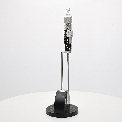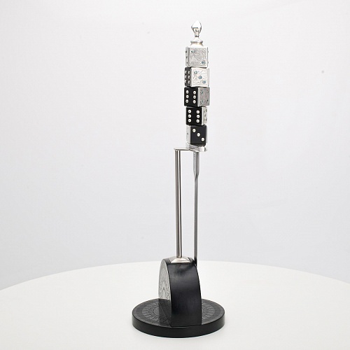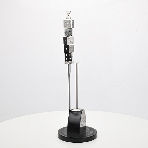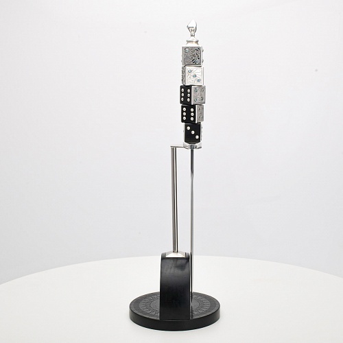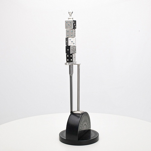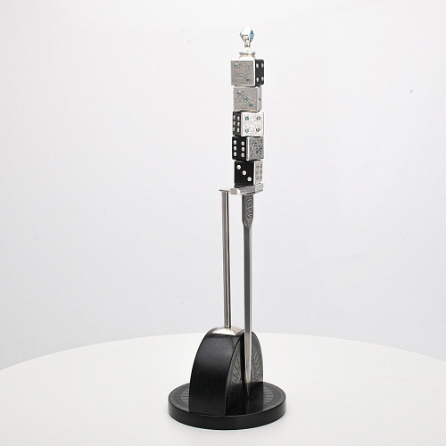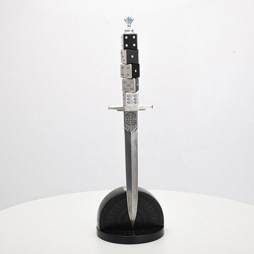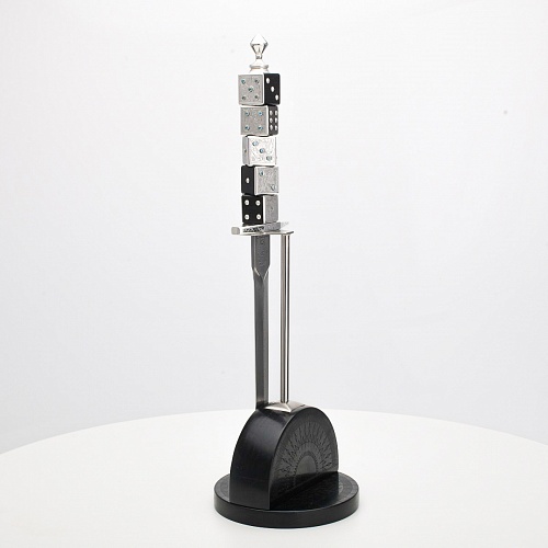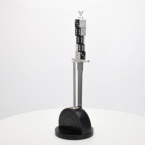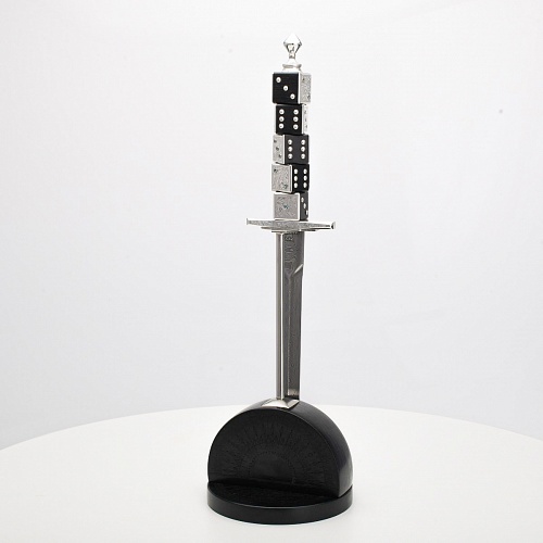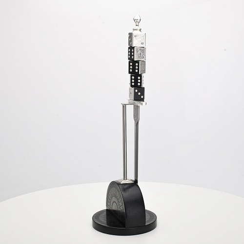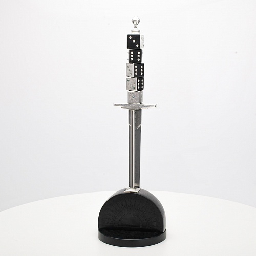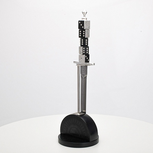 Постамент полукруглой формы выполнен из стабилизированного черного граба, украшен тонкой гравировкой по дереву. Игральные кости в виде кубиков на рукояти и гарда кинжала декорированы геометрическим орнаментом, олицетворяющим зигзаги судьбы, взлеты и падения.