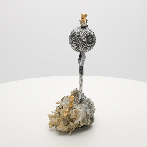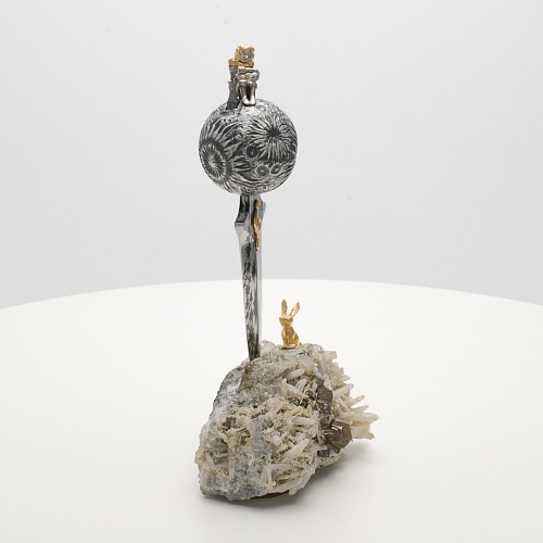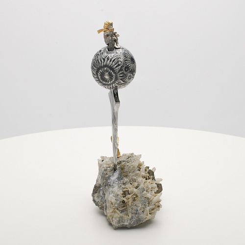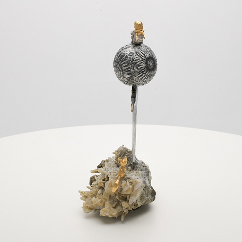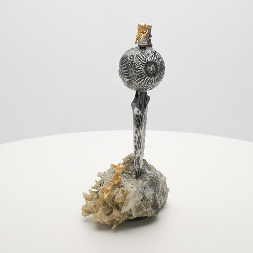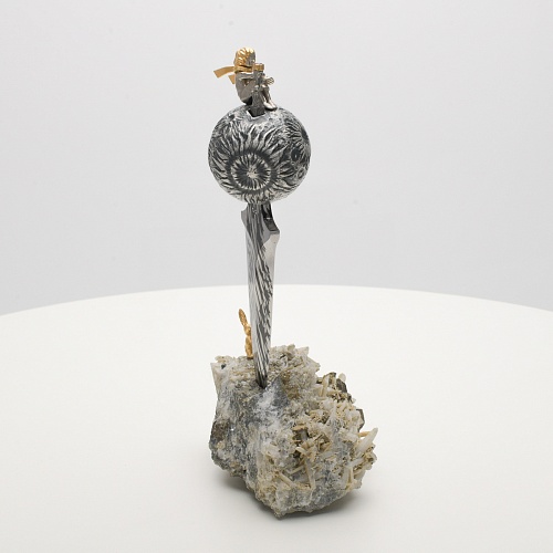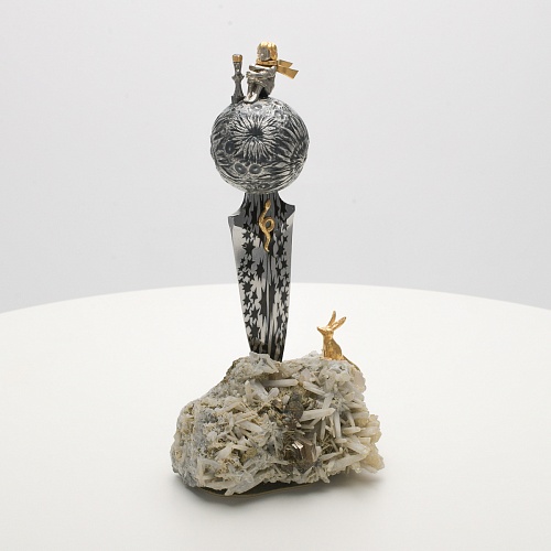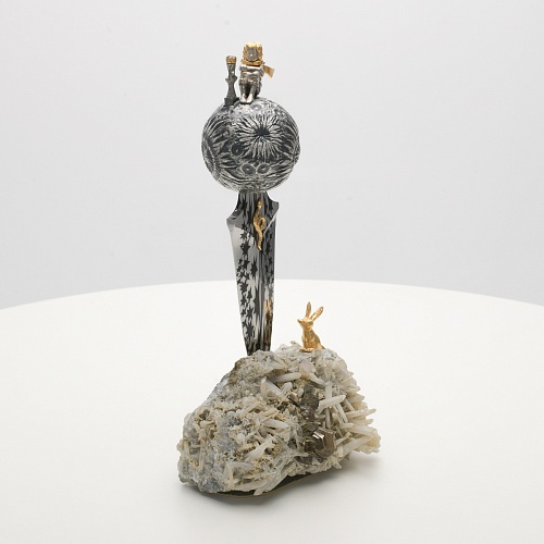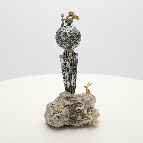 Расположен же клинок острием вниз к коллекционному минералу, в составе которого содержатся кварц и пирит. Камень напоминает сросшиеся кристаллы бежевого цвета, как будто припорошенные пылью. Минерал подобен пустыне, куда приземлился Маленький принц. При этом он символизирует то высокое чувство, которое соединяло мальчика и цветок. Лис, как символ настоящей мужской дружбы и крепких уз, изображен в трогательном моменте – легкий поворот мордочки и замерший хвост – в ожидании своего единственного друга.