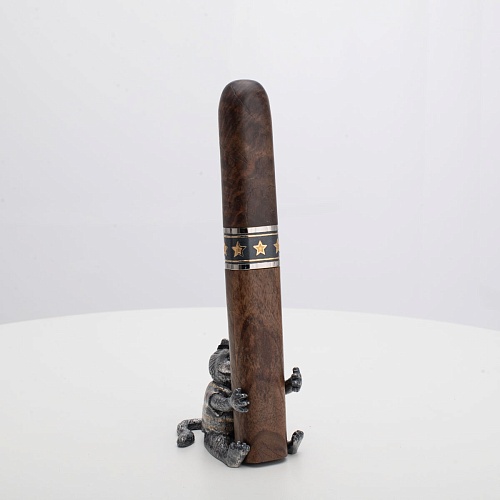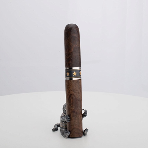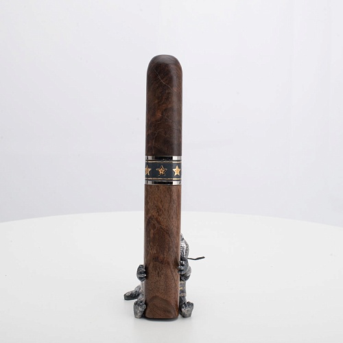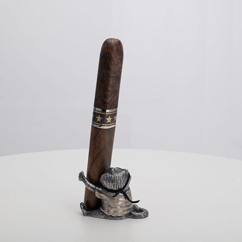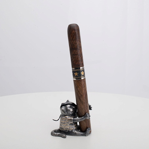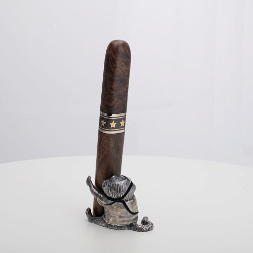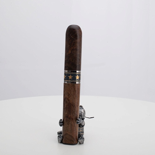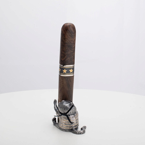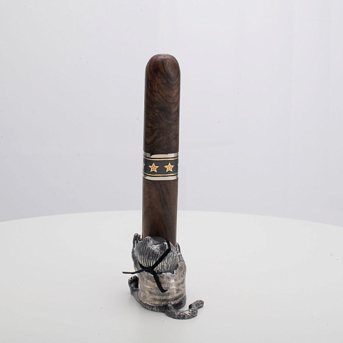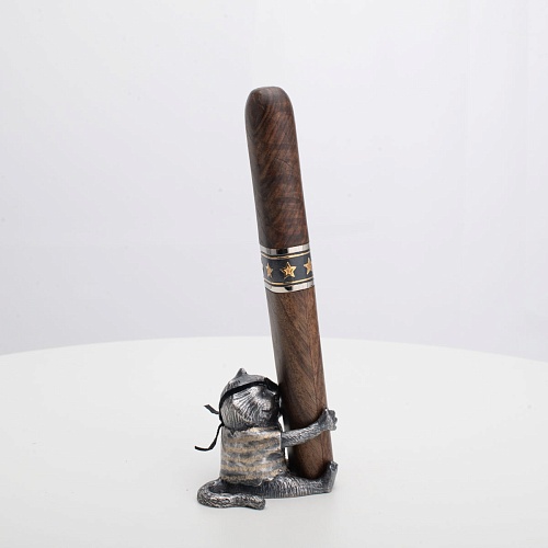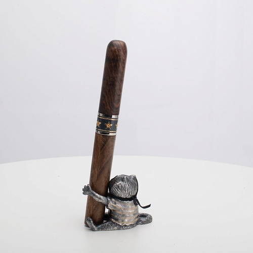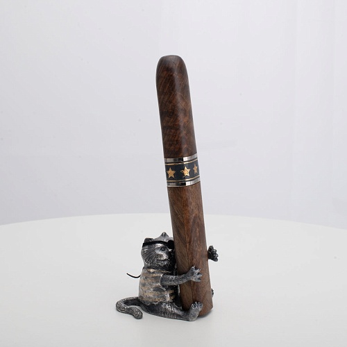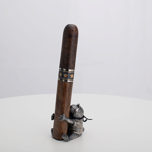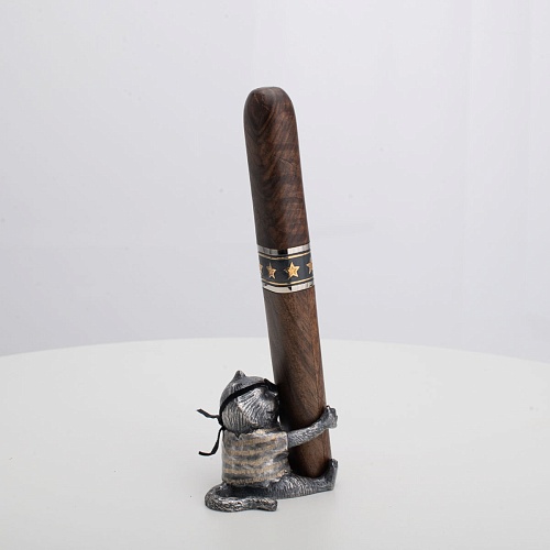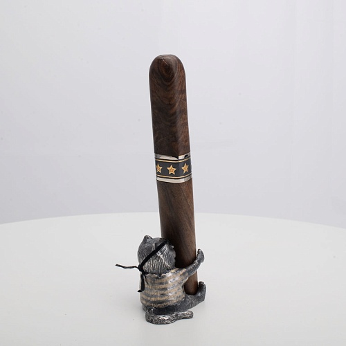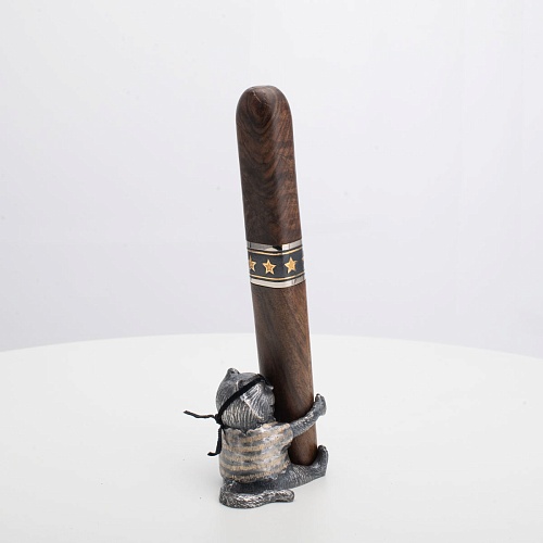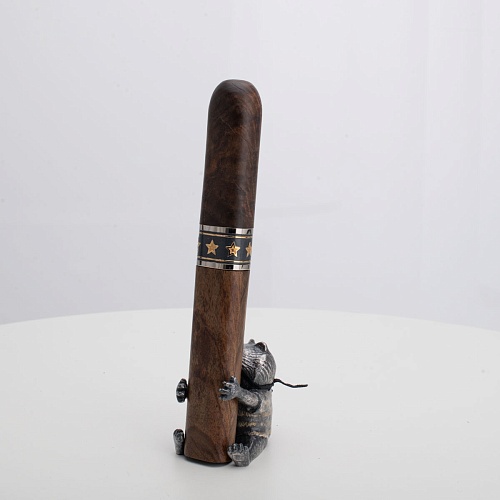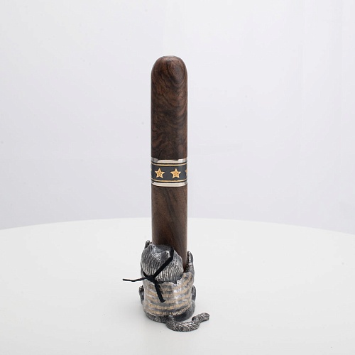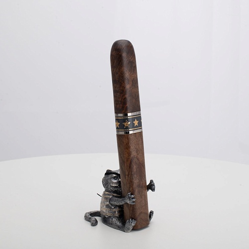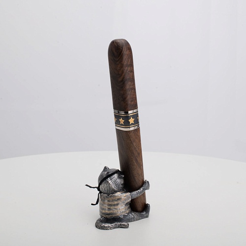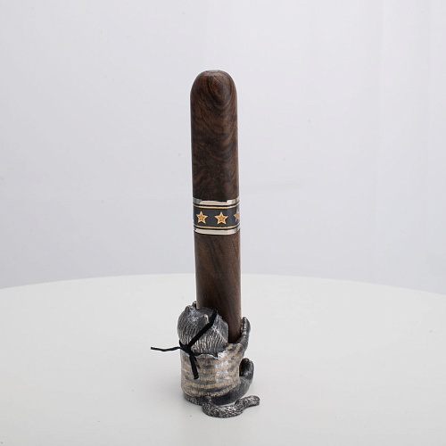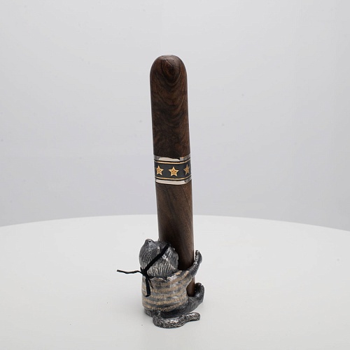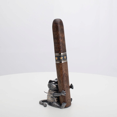 Эта шутливая композиция не оставит равнодушным даже самого серьезного человека. Кот-пират воспользовался моментом и стащил из трюма корабля элитную кубинскую сигару размером больше себя в три раза. Сигара-то не простая, а с секретом. В ножнах из ореха, специально обработанного для придания формы сигары, спрятан небольшой нож из дамасской стали.
