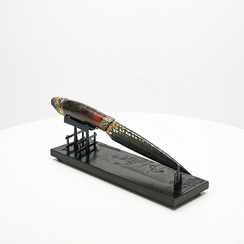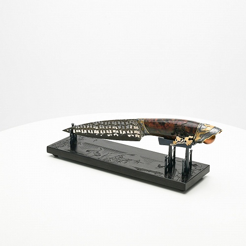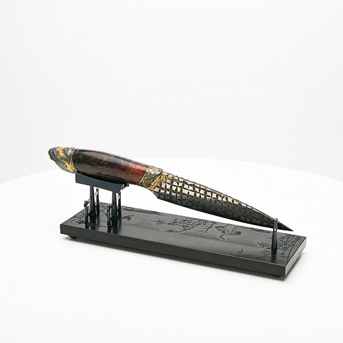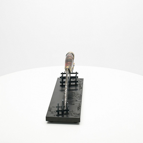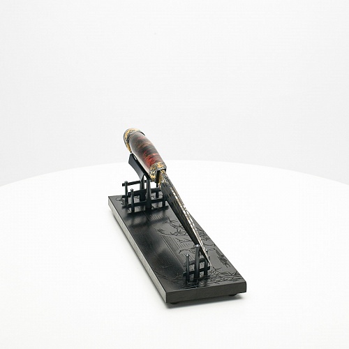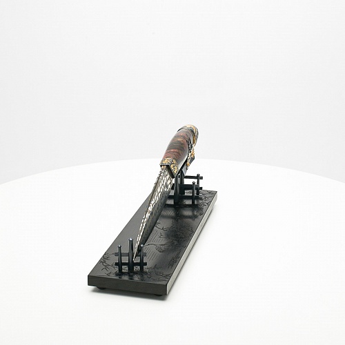 Навершие в виде медного шара олицетворяет рассвет, восходящее солнце, которое широко узнаваемо как символ на флаге Японии. На рукояти тонко выгравирована миниатюра, изображающая, как два самурая оттачивают технику в тренировочном бою, чтобы быть готовыми защитить своего императора. Платформа из черного граба, на которой установлена вся композиция, украшена тончайшей гравировкой с изображением бамбука и японских журавлей.