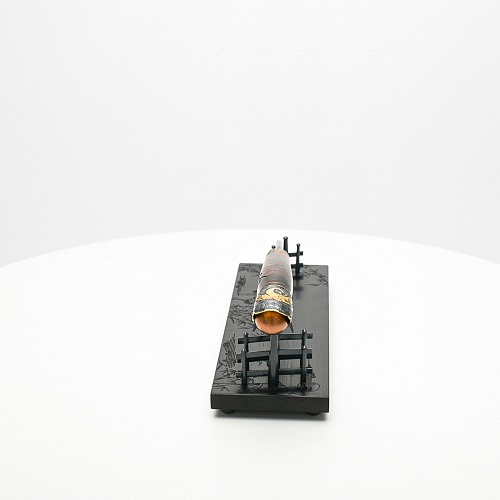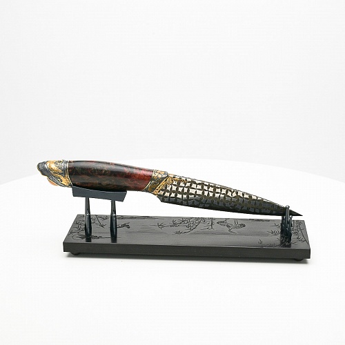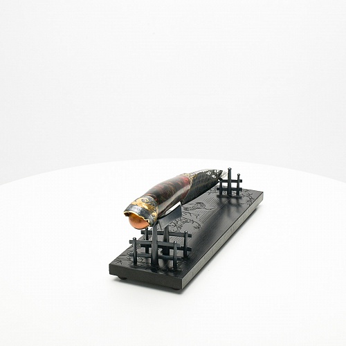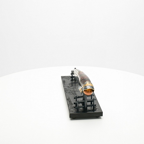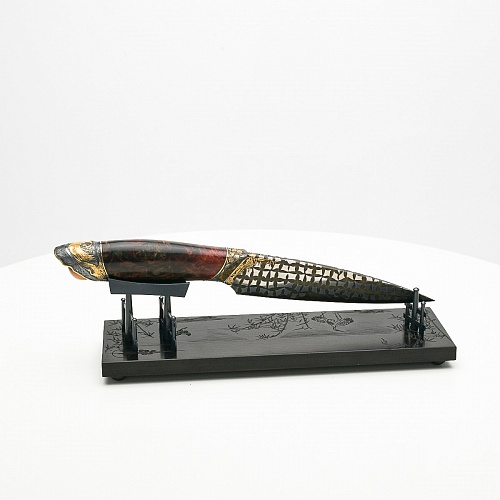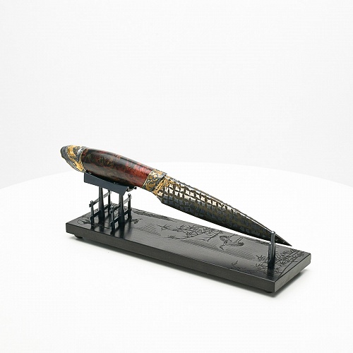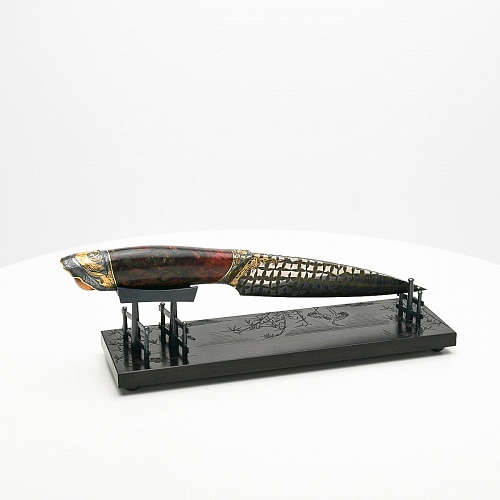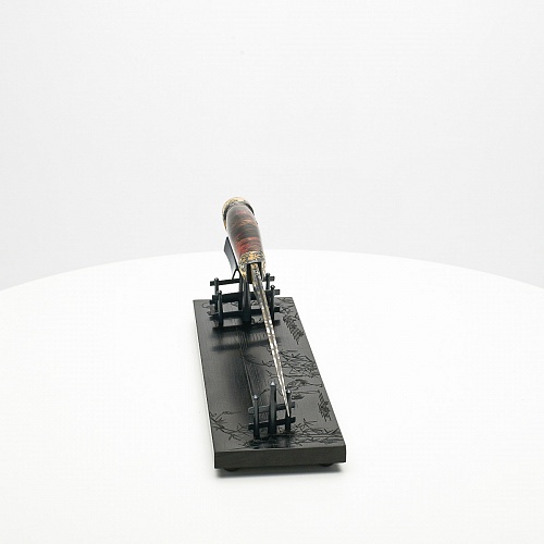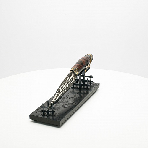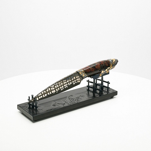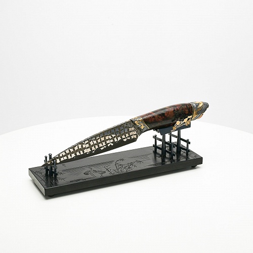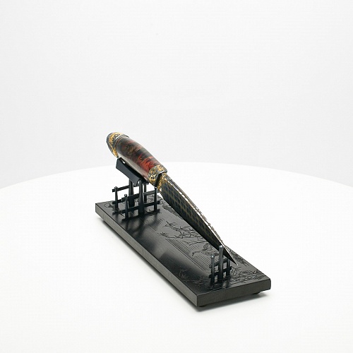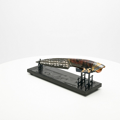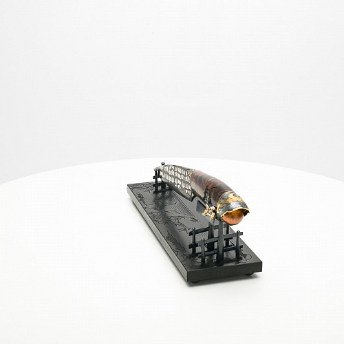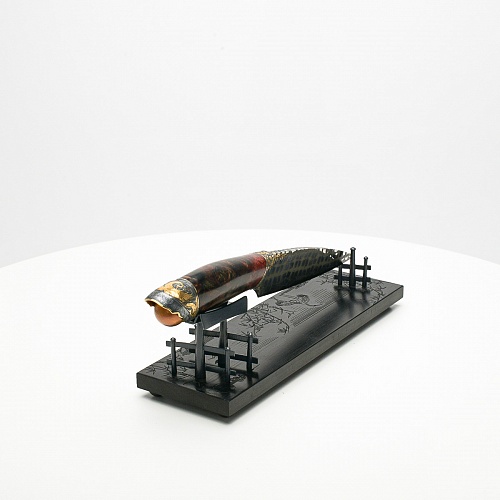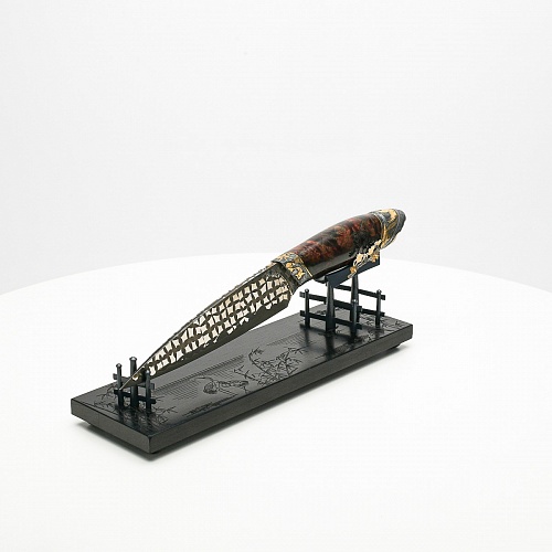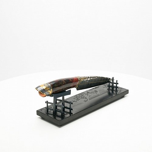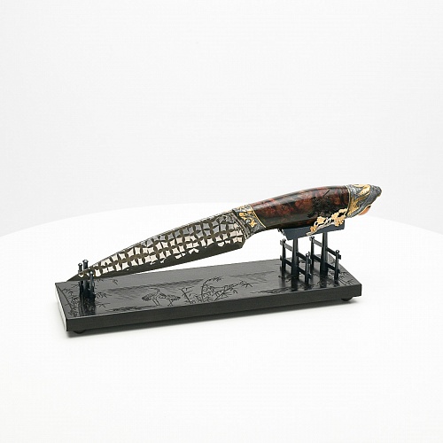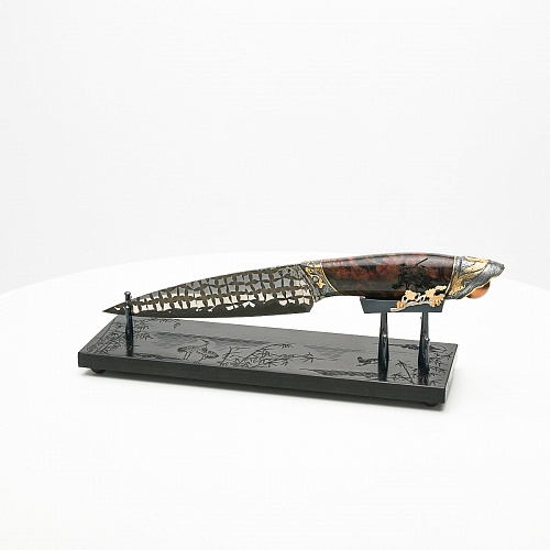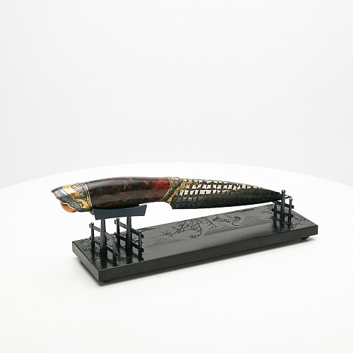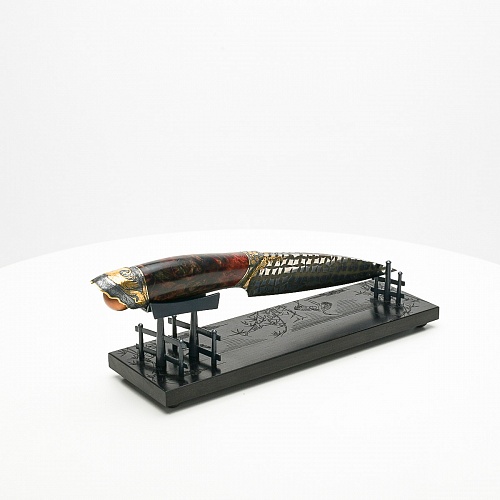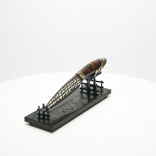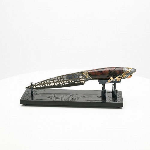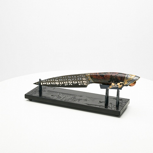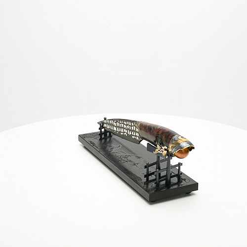 В центре композиции – авторский нож, установленный на подставку, стилизованную под японскую пагоду и украшенную веточкой цветущей сакуры. Клинок изготовлен из авторского мозаичного дамаска, его узор напоминает бамбуковые листья. На клинке в технике золочения нанесено изображение бамбука, который в Японии считается символом чистоты. Это удивительное растение, высокое, похожее на дерево, на самом деле является травой. Ствол пустой, но крепкий, податливо гнущийся под дуновением ветра, но рождающий ощущение надежности и спокойствия. Бамбук ассоциируются с долговечностью, выносливостью и устойчивостью. Бамбук – это символ благородного просветленного человека, это растение олицетворяет стойкость духа и крепость, наличие внутреннего стержня.
