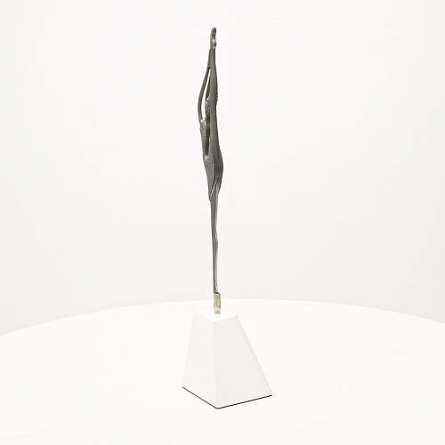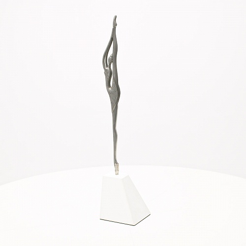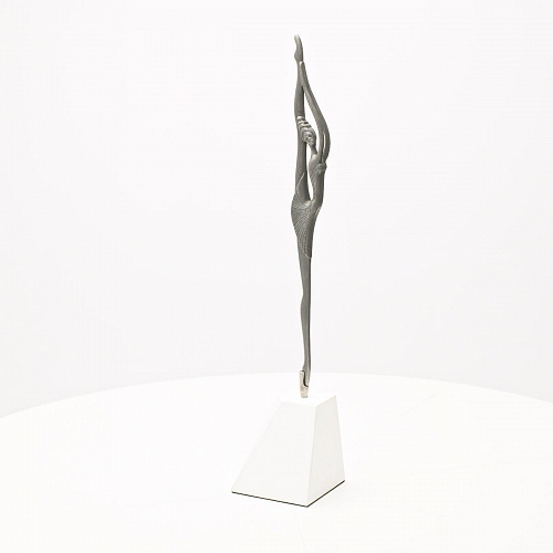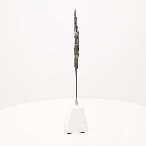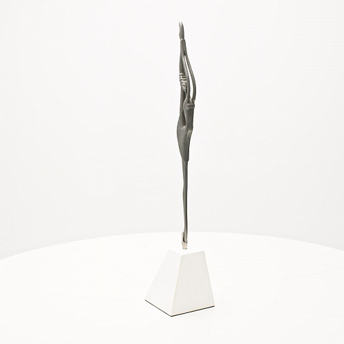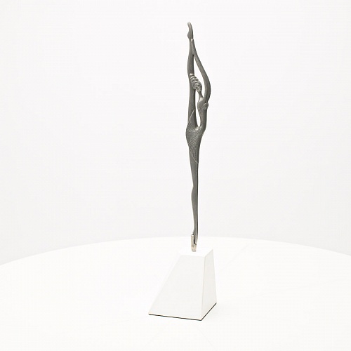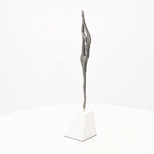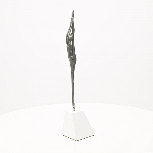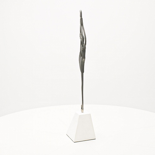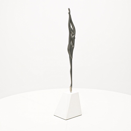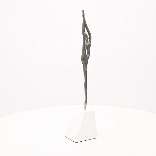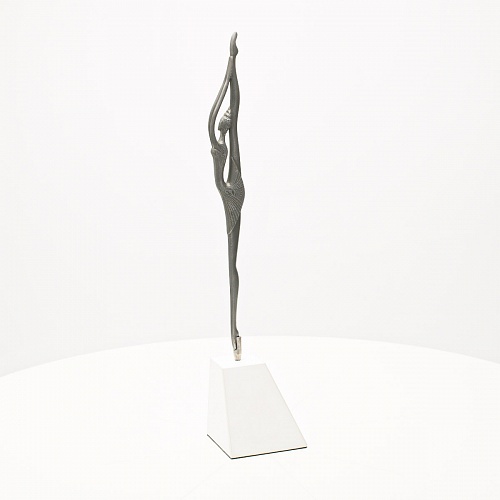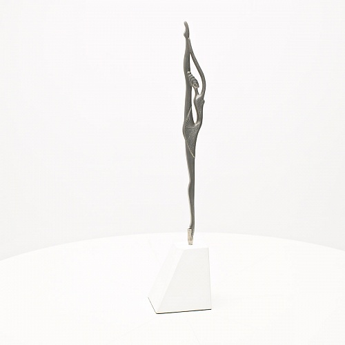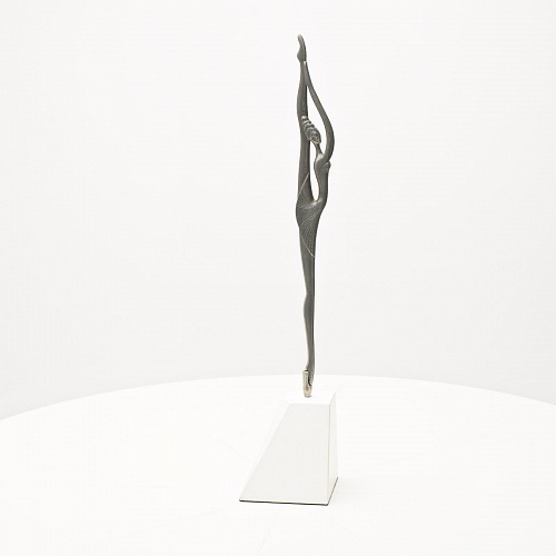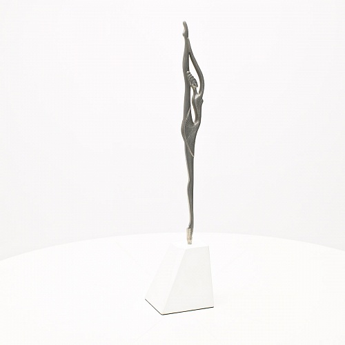 Фигурка танцовщицы уникальна и изготовлена вручную из дамасской стали Zladinox. Изделие целостно, в нем нет ни креплений, ни узлов соединения. Танцовщица выполнена в минималистической манере с нотками классического сочетания светлого и темного. Наслаждаться одним только видом фигурки можно снова и снова. Облик девушки настолько прекрасен и возвышен сам по себе, что не стоит нарушать это чувство целостности никакими украшениями. Тонкий силуэт буквально порхает, при этом подставкой для женской ножки служит кахолонг – удивительный камень молочно-белого цвета с черными прожилками.