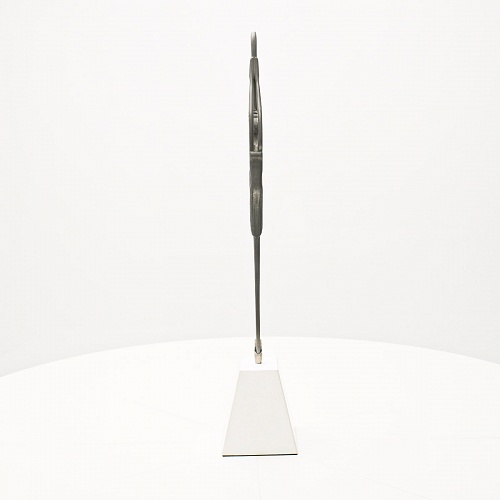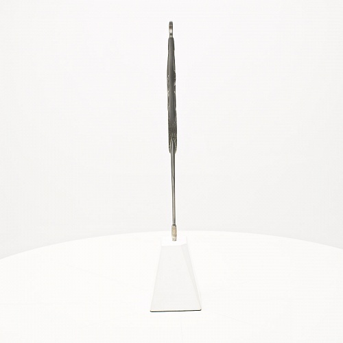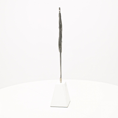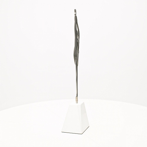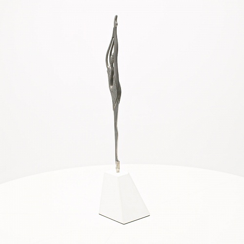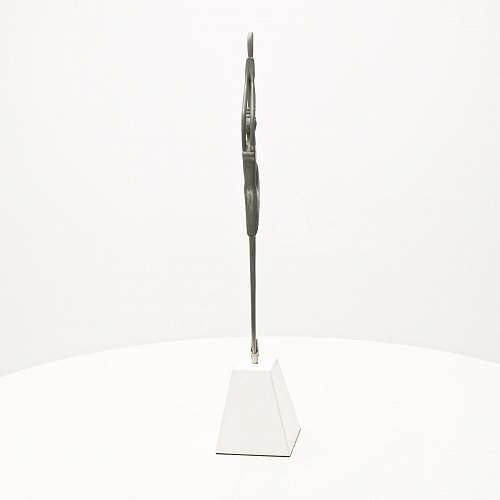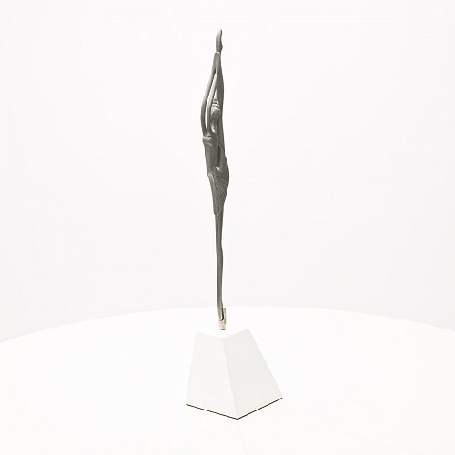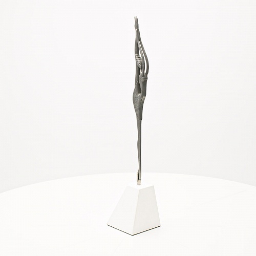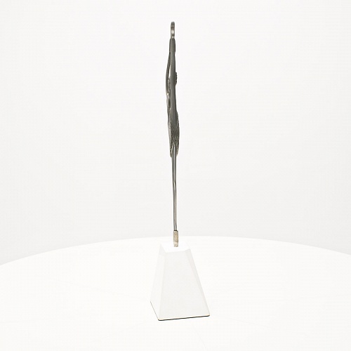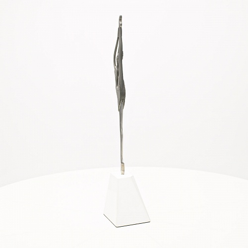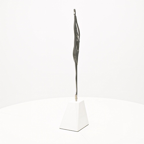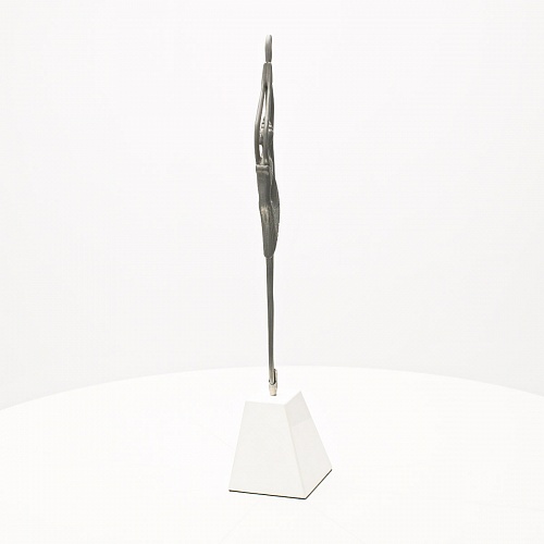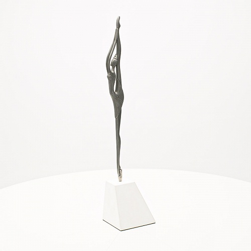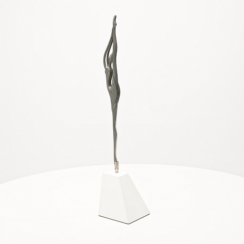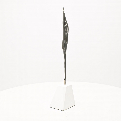 Фигурка танцовщицы уникальна и изготовлена вручную из дамасской стали Zladinox. Изделие целостно, в нем нет ни креплений, ни узлов соединения. Танцовщица выполнена в минималистической манере с нотками классического сочетания светлого и темного. Наслаждаться одним только видом фигурки можно снова и снова. Облик девушки настолько прекрасен и возвышен сам по себе, что не стоит нарушать это чувство целостности никакими украшениями. Тонкий силуэт буквально порхает, при этом подставкой для женской ножки служит кахолонг – удивительный камень молочно-белого цвета с черными прожилками.