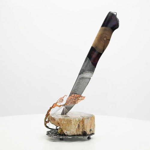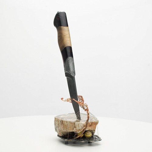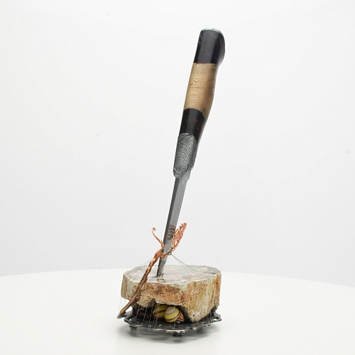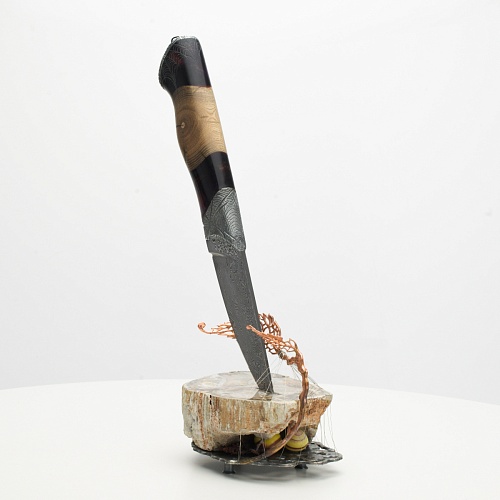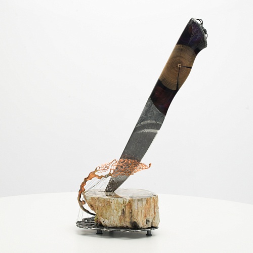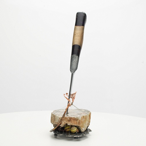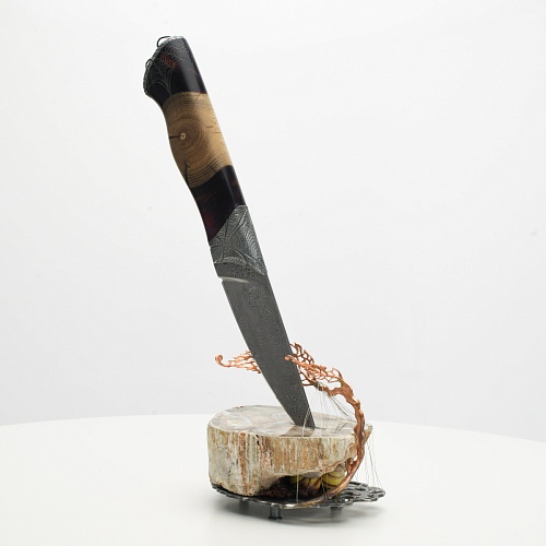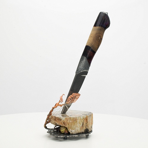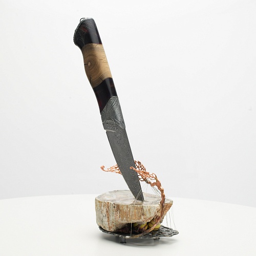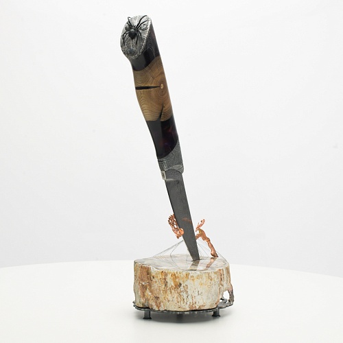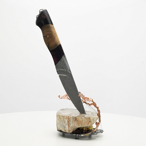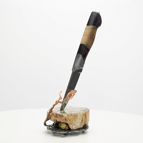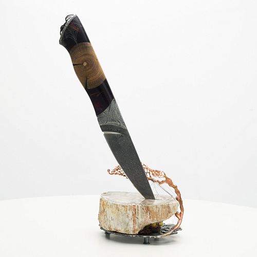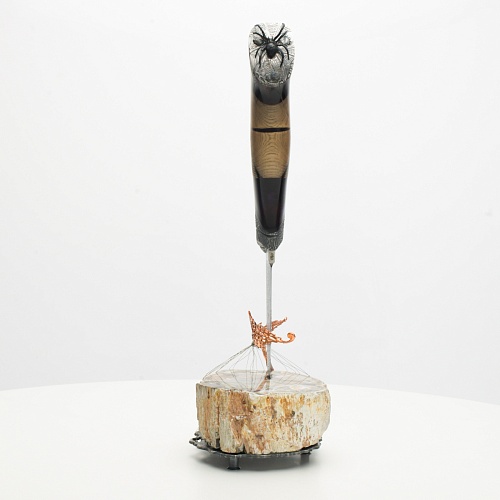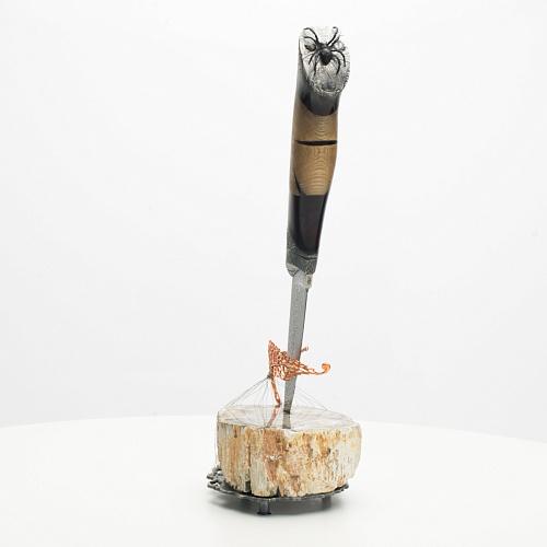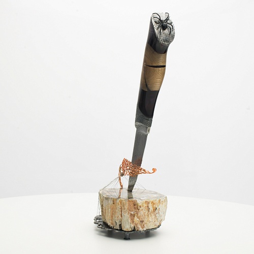 Рукоять ножа с интересной фактурой напоминает паутину, для усиления изобразительного эффекта она дополнительно украшена гравировками в виде сетки паутины. На навершии, словно царица, сидит паучиха. Клинок выполнен из дамасской стали ZLADINOX ZDI-1016 (узор "дикий"), гарда декорирована под серебристую паутину. Подставкой для композиции служит красивый коллекционный образец окаменелого дерева, над которым развернулся осенний лист, выполненный в технике просечки.