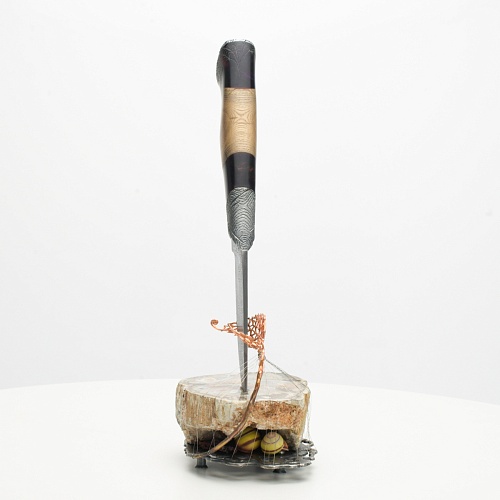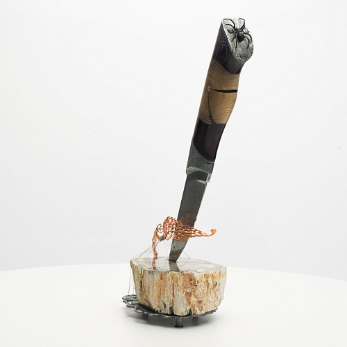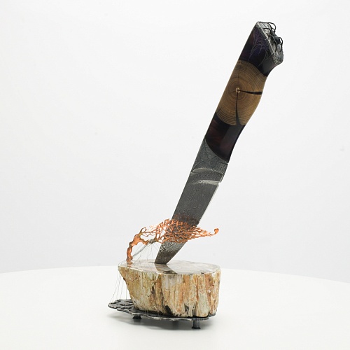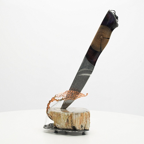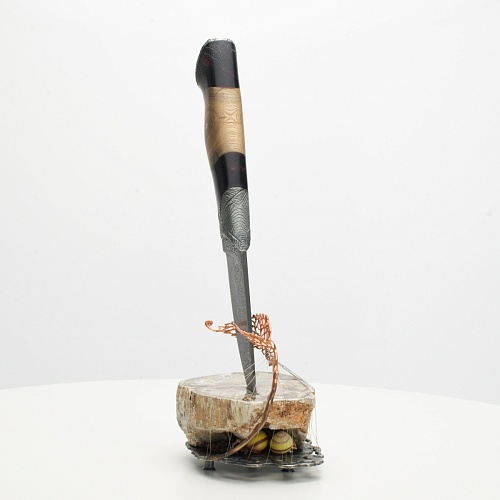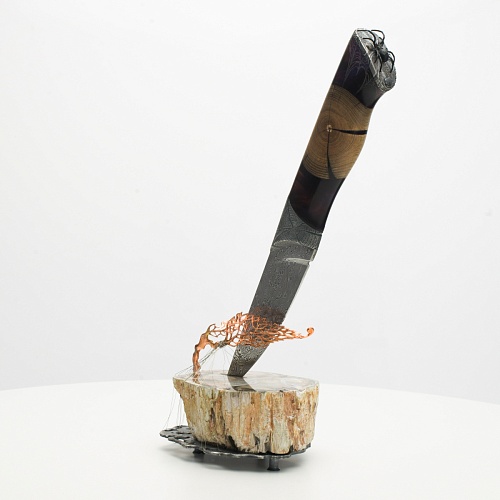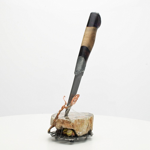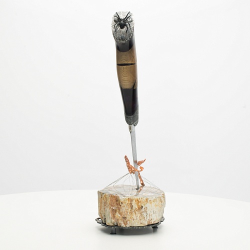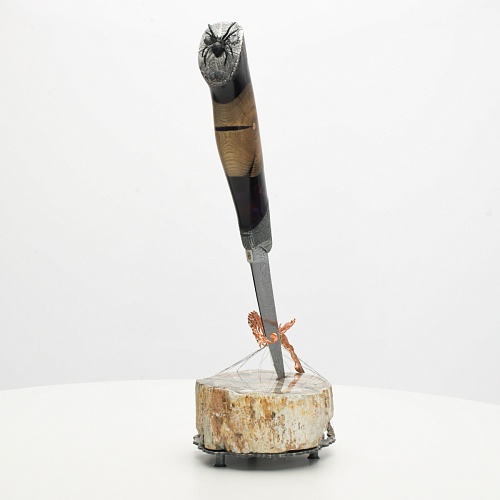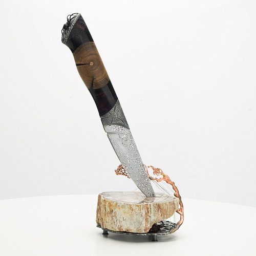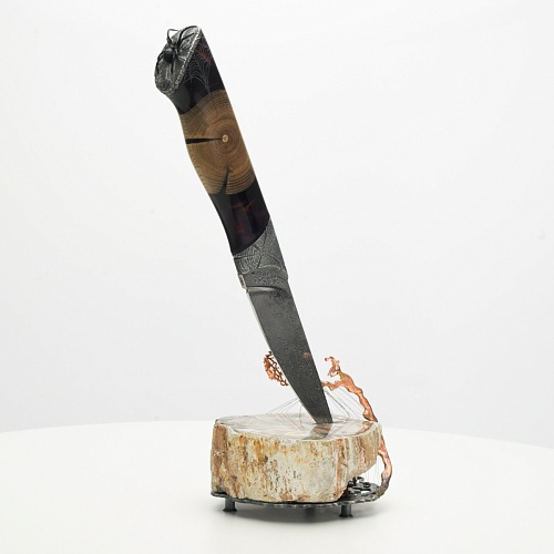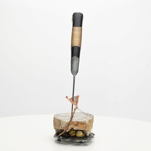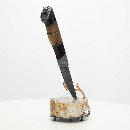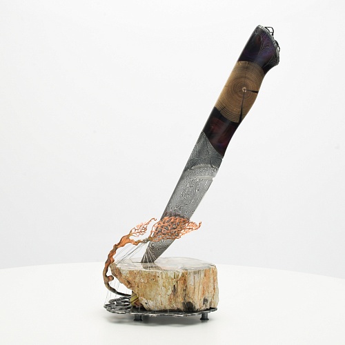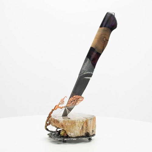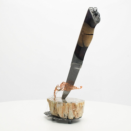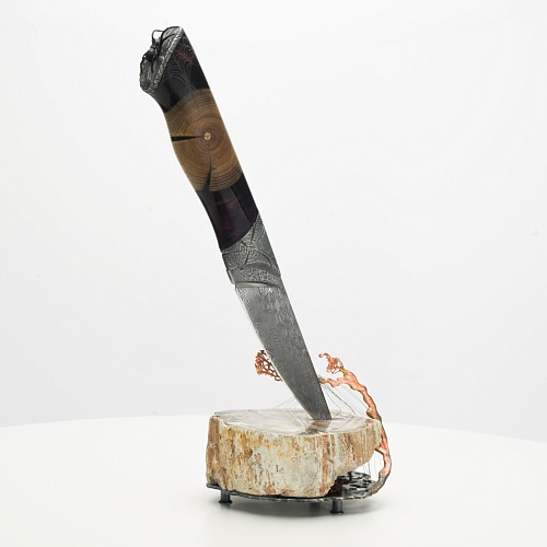 Рукоять ножа с интересной фактурой напоминает паутину, для усиления изобразительного эффекта она дополнительно украшена гравировками в виде сетки паутины. На навершии, словно царица, сидит паучиха. Клинок выполнен из дамасской стали ZLADINOX ZDI-1016 (узор "дикий"), гарда декорирована под серебристую паутину. Подставкой для композиции служит красивый коллекционный образец окаменелого дерева, над которым развернулся осенний лист, выполненный в технике просечки.