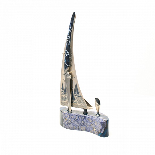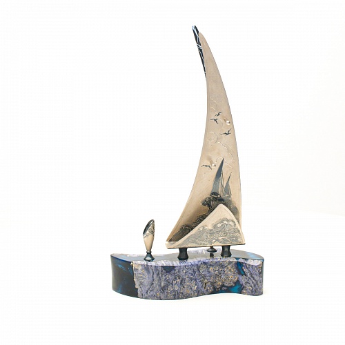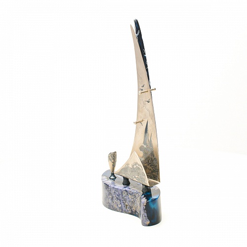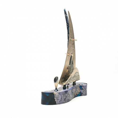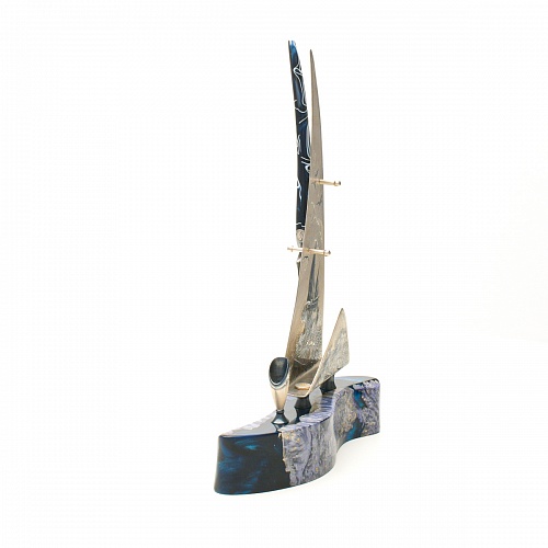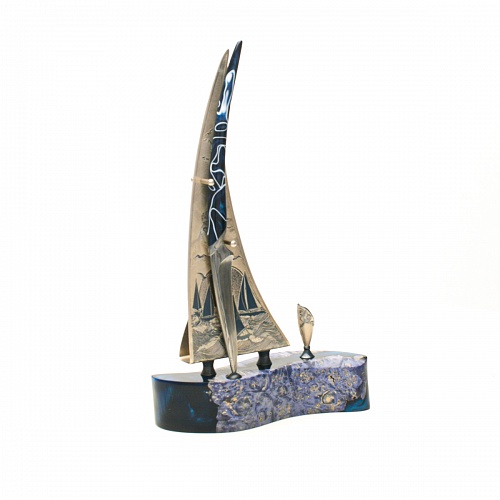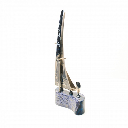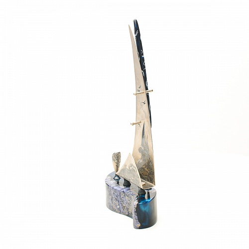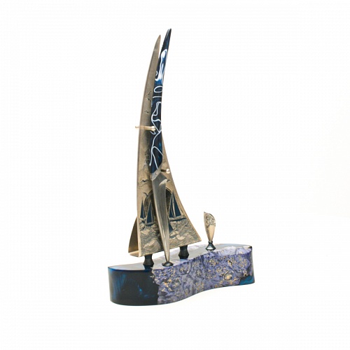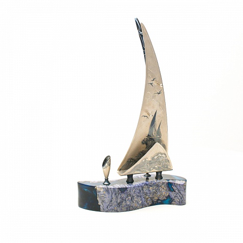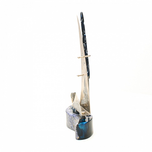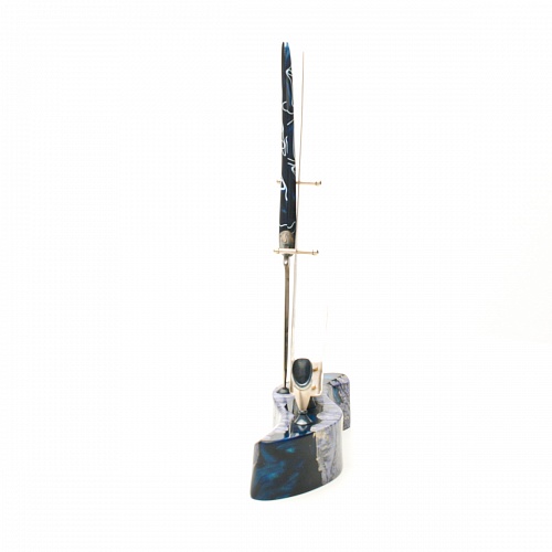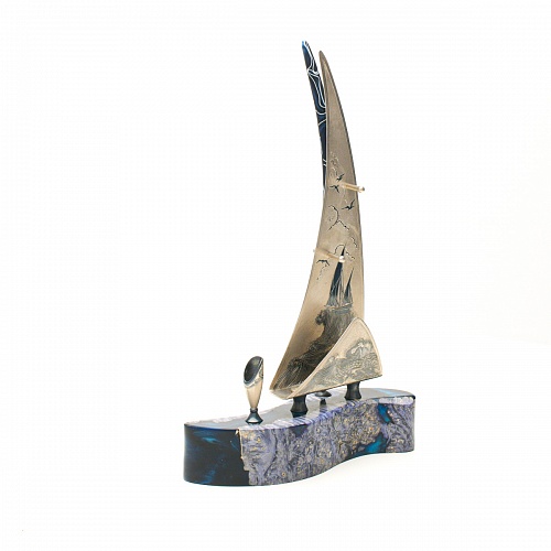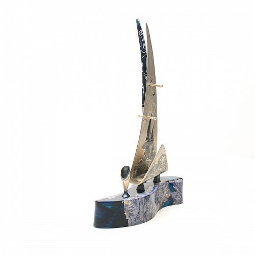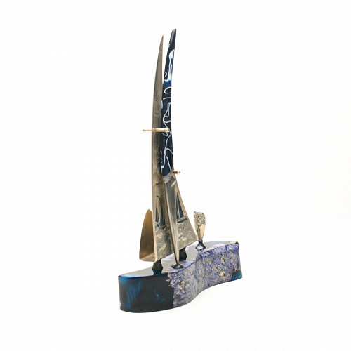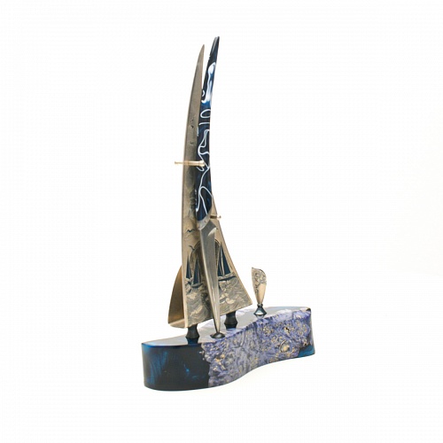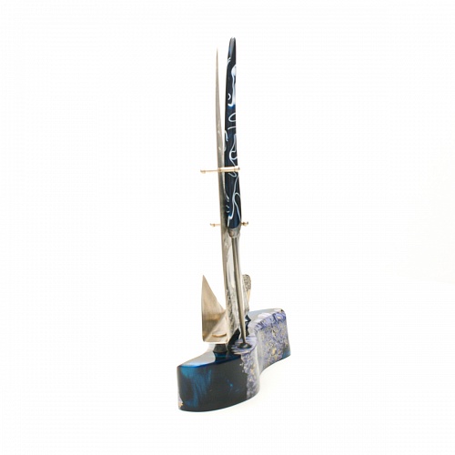 Центральная часть композиции - парус, который плывет по волнам бескрайнего синего моря. Основание для композиции изготовлено из стабилизированного гибрида, имеет плавные линии и очертания, словно волны. На лицевой стороне паруса изображена миниатюра на морскую тематику. Изящный и острый офисный нож с клинком из дамасской стали Zladinox, подобно мачте, держит парус на плаву, помогая сопротивляться ветрам, штормам и невзгодам. Рукоять офисного ножа выполнена из киринита "старая джинса", его цветовая гамма и фактура как нельзя лучше подчеркивают морскую стихию.