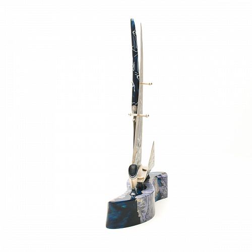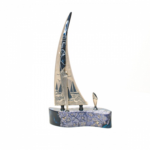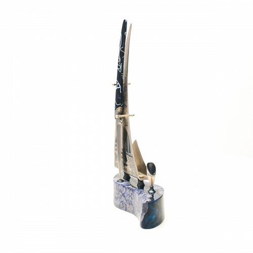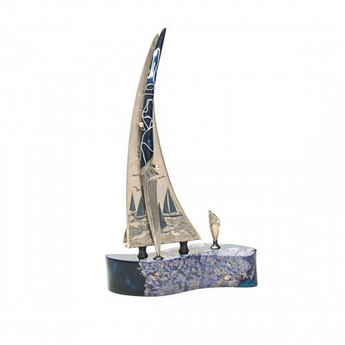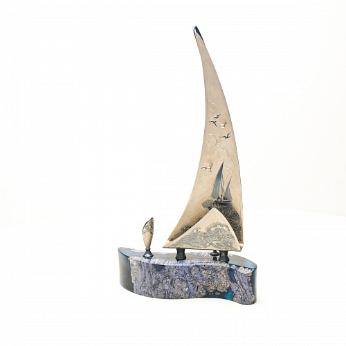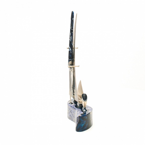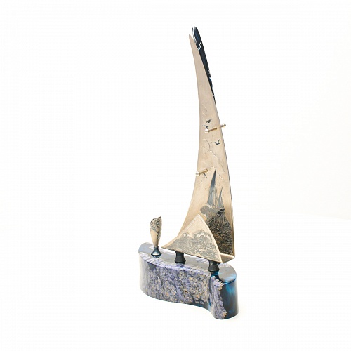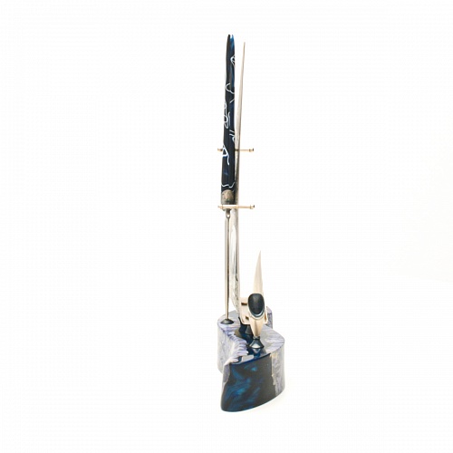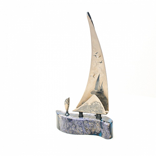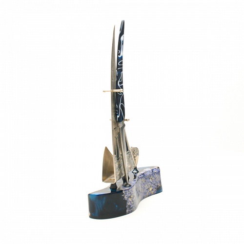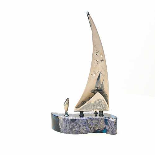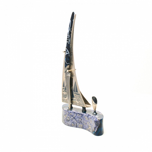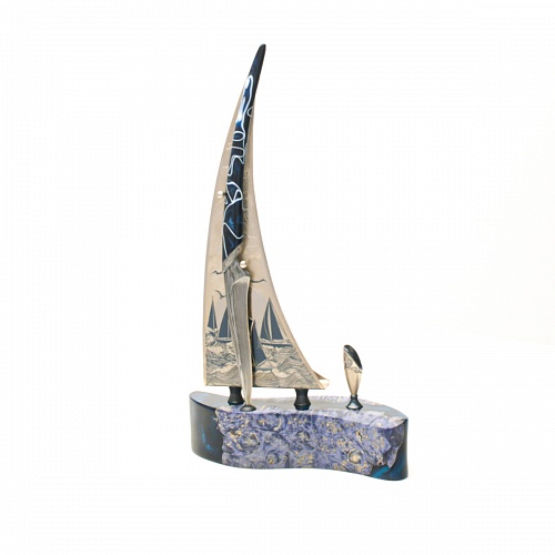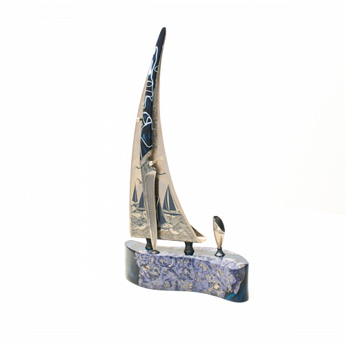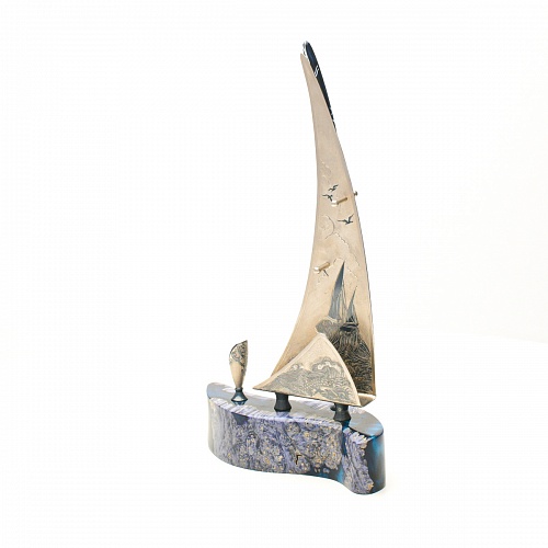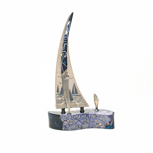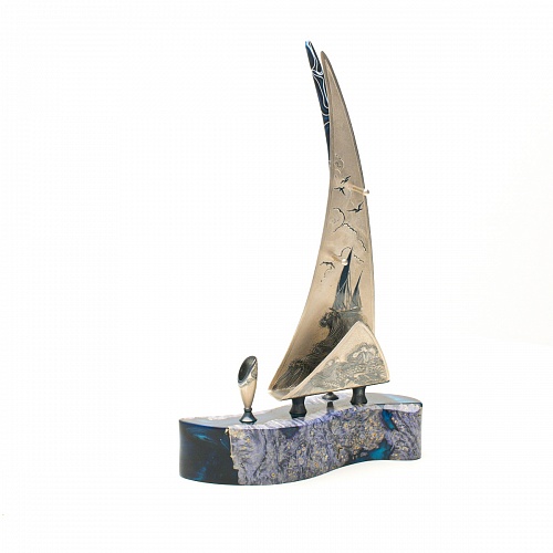 Центральная часть композиции - парус, который плывет по волнам бескрайнего синего моря. Основание для композиции изготовлено из стабилизированного гибрида, имеет плавные линии и очертания, словно волны. На лицевой стороне паруса изображена миниатюра на морскую тематику. Изящный и острый офисный нож с клинком из дамасской стали Zladinox, подобно мачте, держит парус на плаву, помогая сопротивляться ветрам, штормам и невзгодам. Рукоять офисного ножа выполнена из киринита "старая джинса", его цветовая гамма и фактура как нельзя лучше подчеркивают морскую стихию.