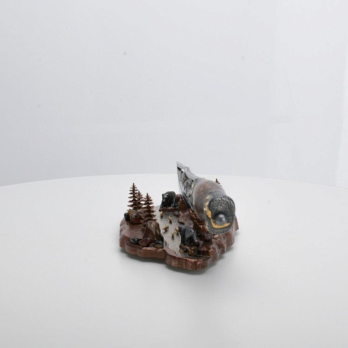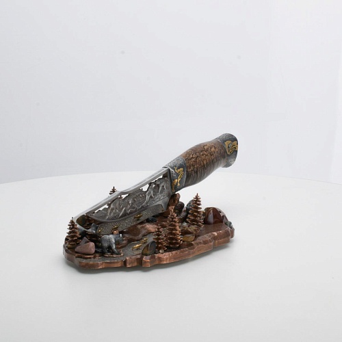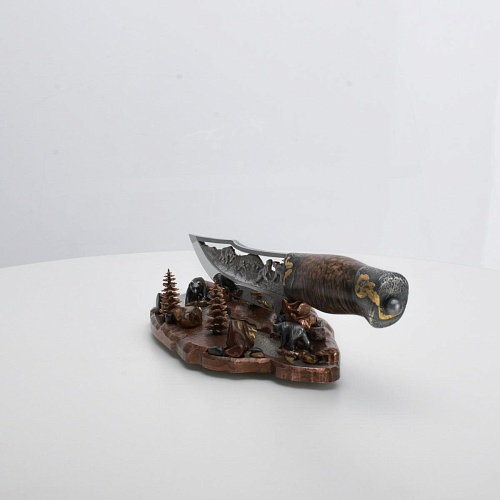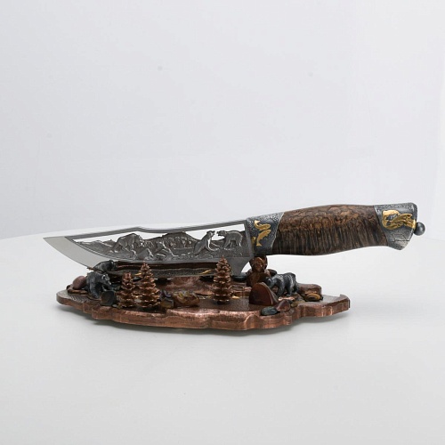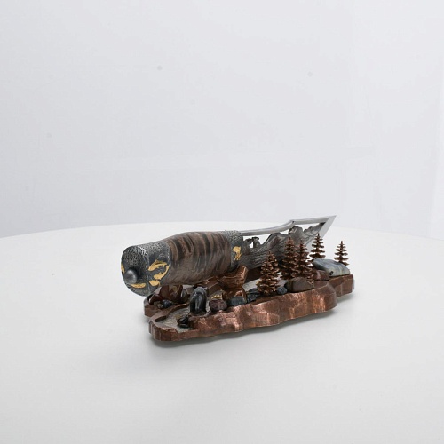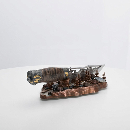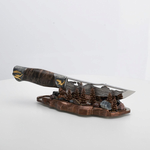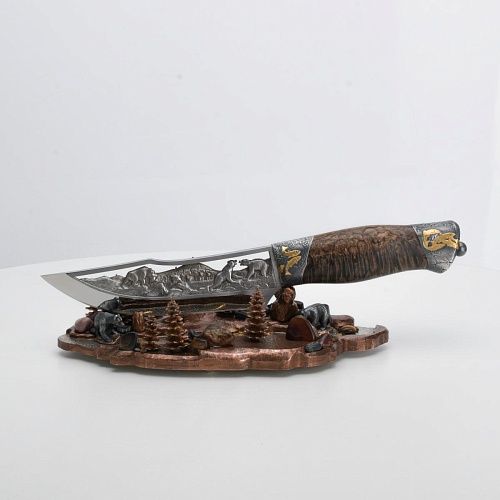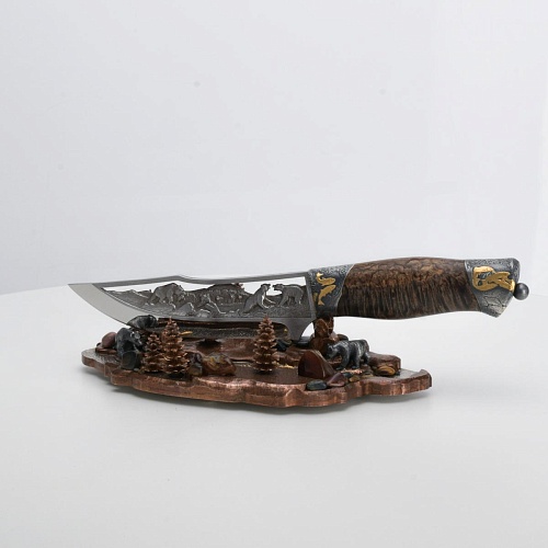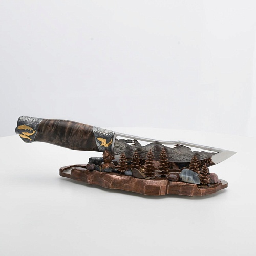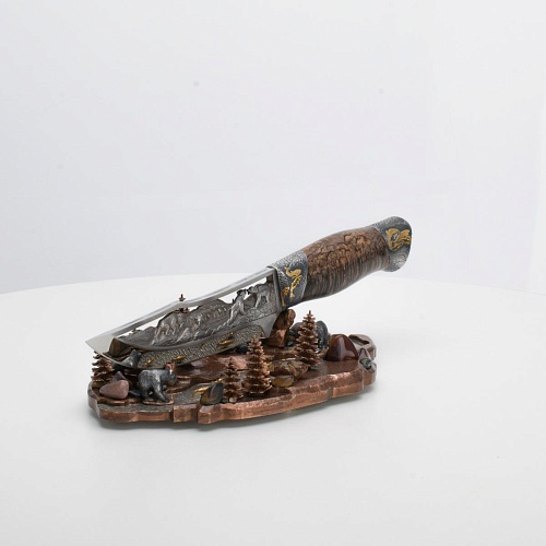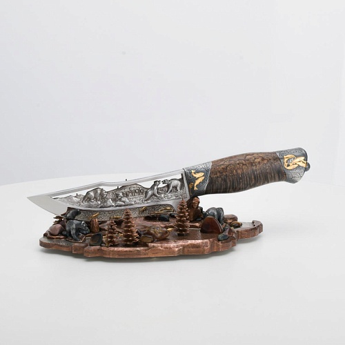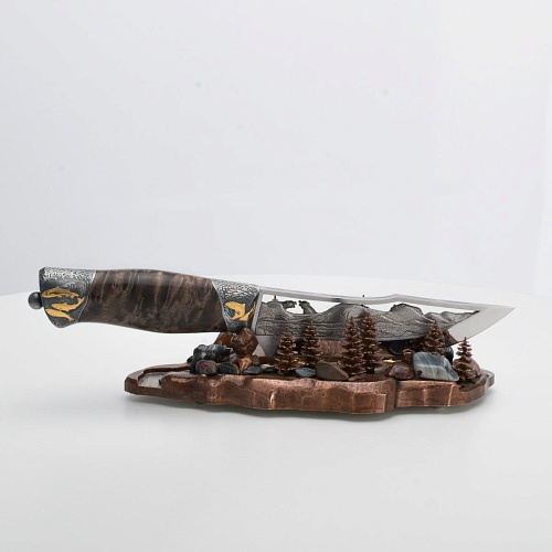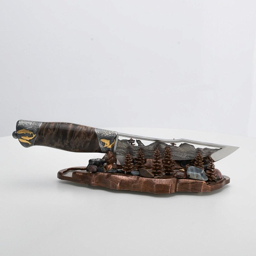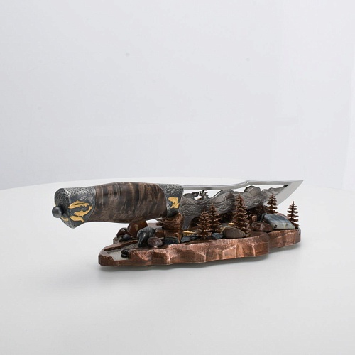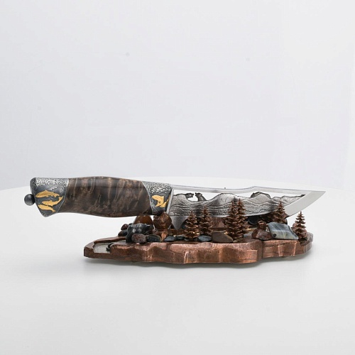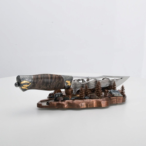 В центре композиции ‒ авторский нож с просечным клинком из зеркально отполированной стали 40Х10С2М. Справа изображены два крупных медведя, дерущихся за самого сытного лосося. Слева медведица с пойманной рыбиной направляется к берегу, где в укрытии ее ждут три медвежонка. Еще один удачливый медведь с добычей выбирается из реки, чтобы вдоволь полакомиться вкусным лососем. Рукоять ножа выполнена из стабилизированной карельской березы, линии по древесине напоминают крутые пороги и стремительное течение северной реки, в которой так много лосося, что отдельные рыбы, покрытые золотом, даже украшают навершие и гарду ножа.
