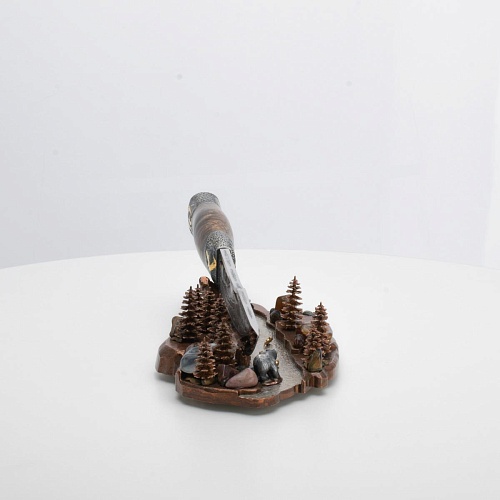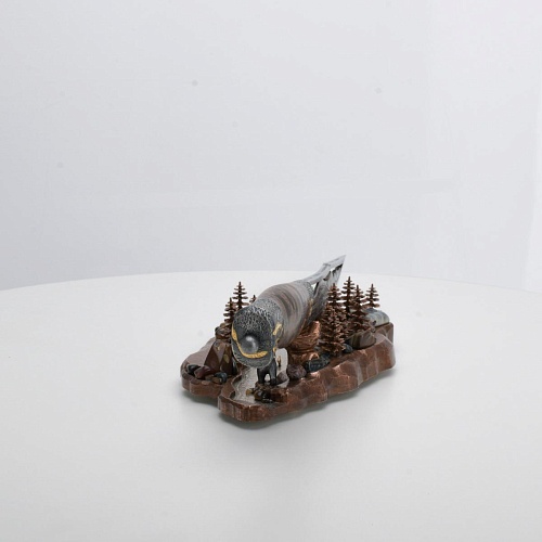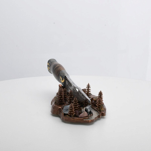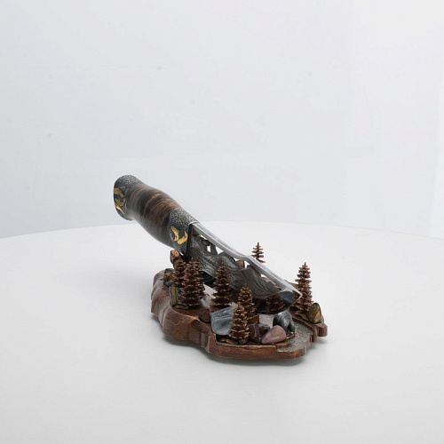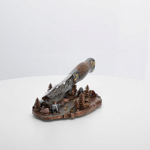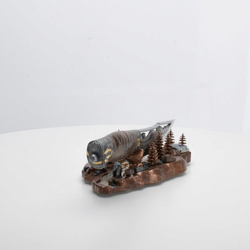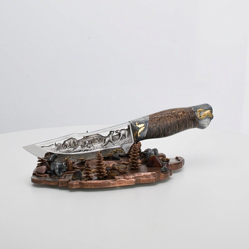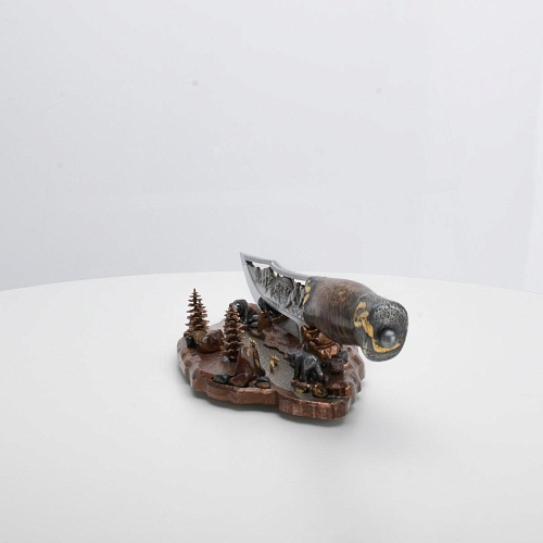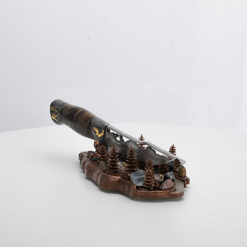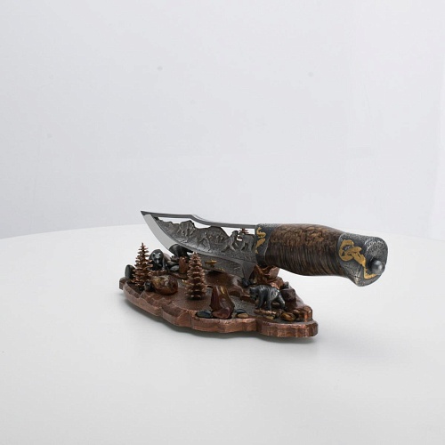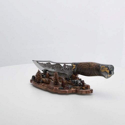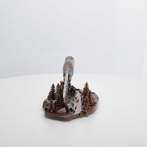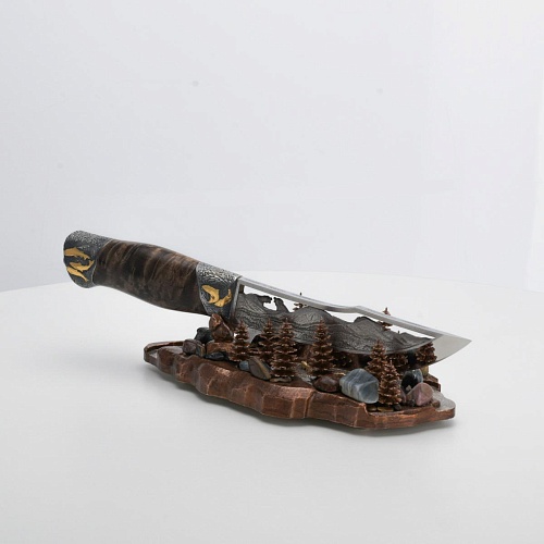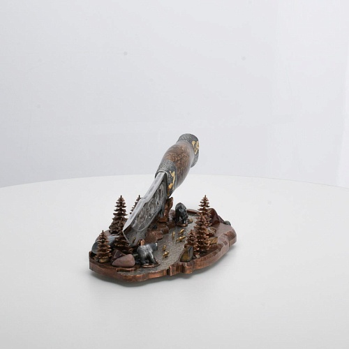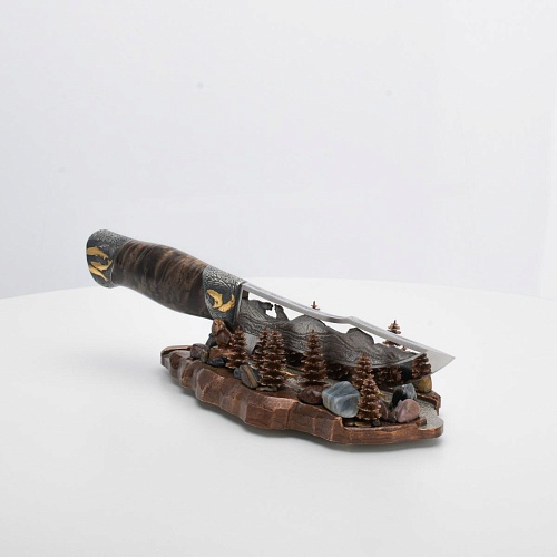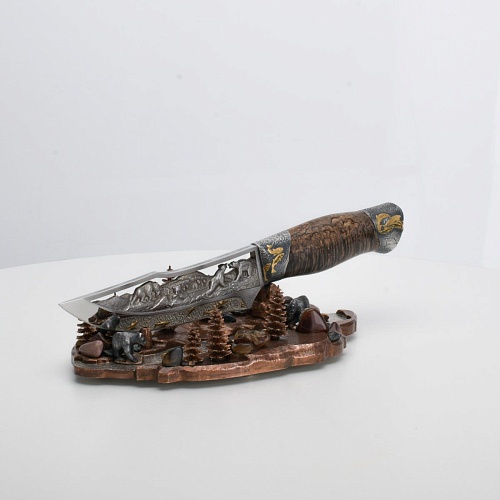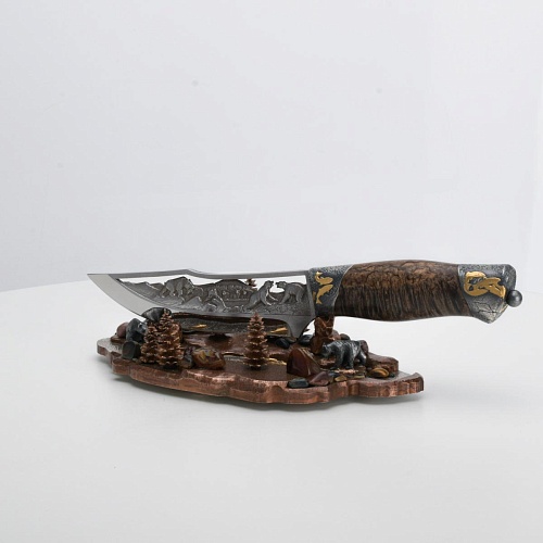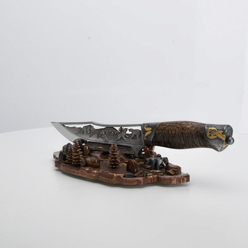 В центре композиции ‒ авторский нож с просечным клинком из зеркально отполированной стали 40Х10С2М. Справа изображены два крупных медведя, дерущихся за самого сытного лосося. Слева медведица с пойманной рыбиной направляется к берегу, где в укрытии ее ждут три медвежонка. Еще один удачливый медведь с добычей выбирается из реки, чтобы вдоволь полакомиться вкусным лососем. Рукоять ножа выполнена из стабилизированной карельской березы, линии по древесине напоминают крутые пороги и стремительное течение северной реки, в которой так много лосося, что отдельные рыбы, покрытые золотом, даже украшают навершие и гарду ножа.