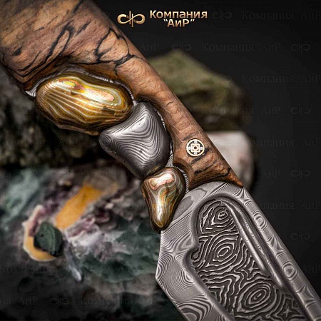 В композиции клинки расположены на небольшой площадке из дерева и опираются на каменные скалы. Ножи выполнены в индивидуальном стиле из трех материалов – камня, стали и дерева. Каждая рукоять изготовлена из дорогого дерева – туи, черного дерева и бука, а горы выточены из ряда камней, среди которых натуральный хрусталь, гранат, кварц и яшма.