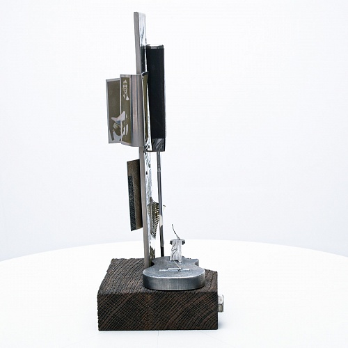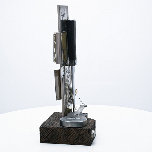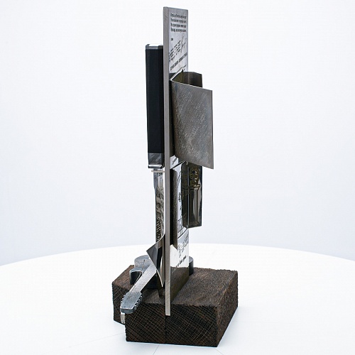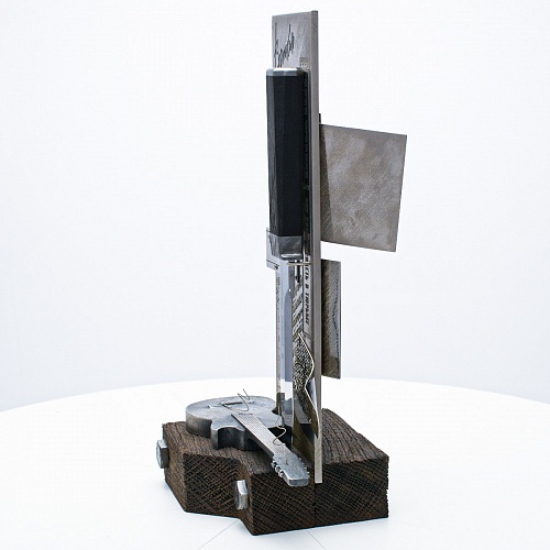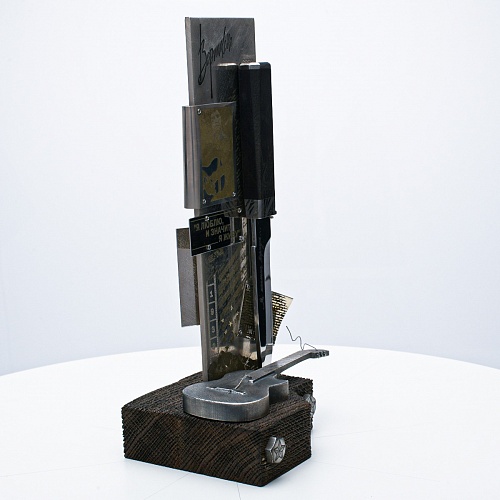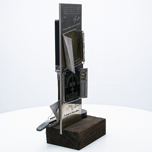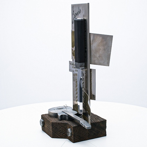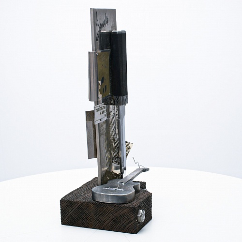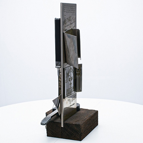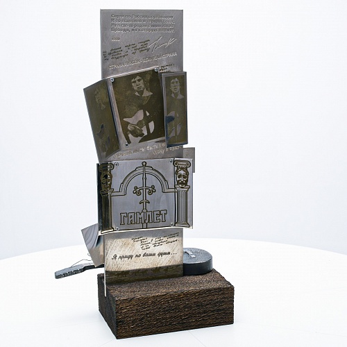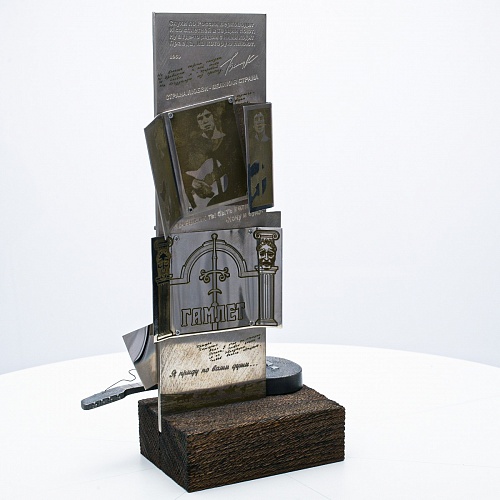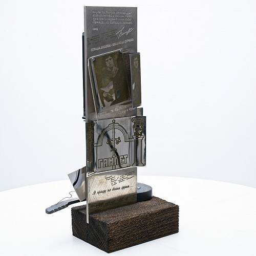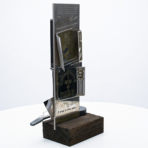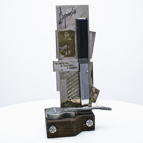 Образ его жизненной позиции «по вертикали», которой актер придерживался на протяжении всей своей жизни, как и его герой из одноименного фильма, показан в композиции высокой стелой и вертикально установленным ножом. Наши художники решили выполнить нож простым, без излишеств, с клинком из коррозионностойкой стали. Гарда декорирована художественной гравировкой, а рукоять из граба отделана изображением рельефных острых скал и камнепада. В качестве манящей вершины выступает серебристое навершие. Клинок украшен надписью: «Я, конечно, вернусь...».