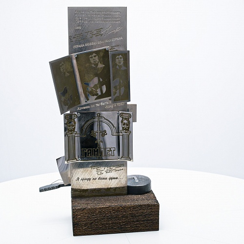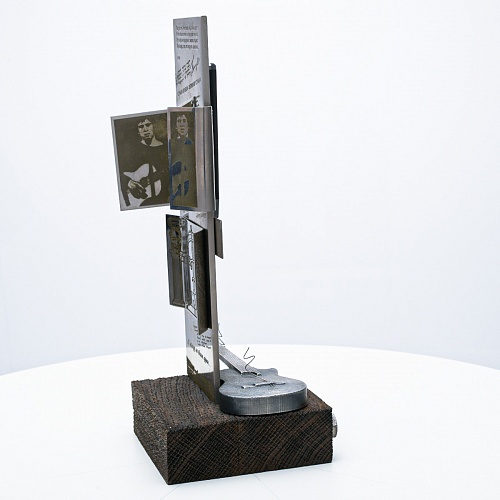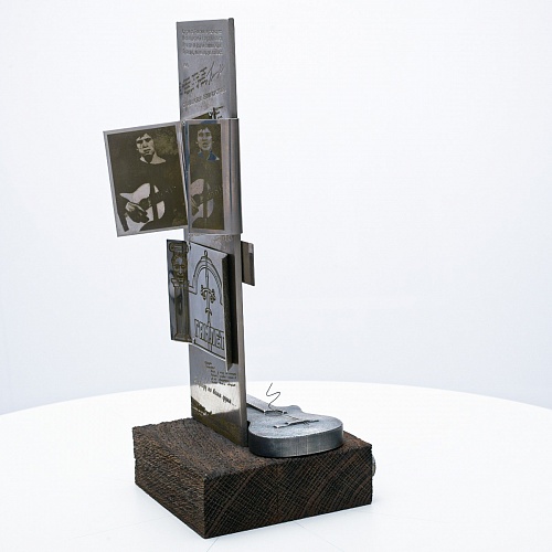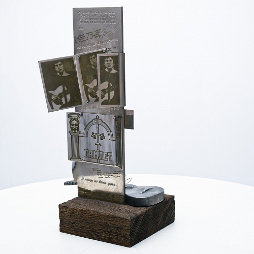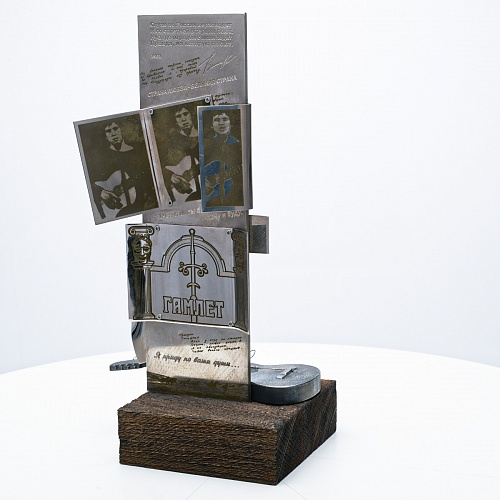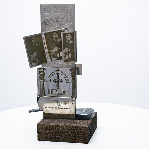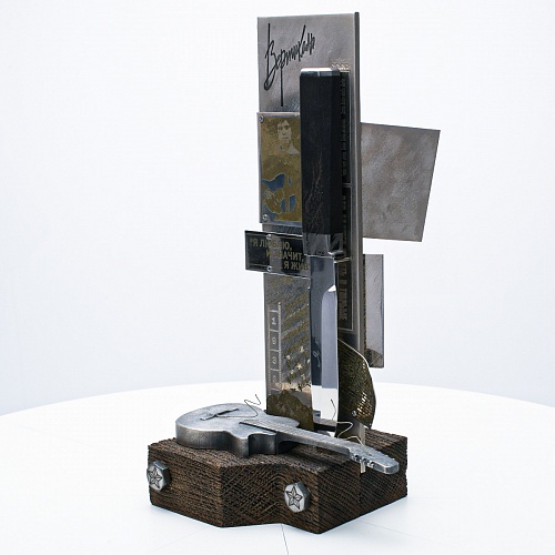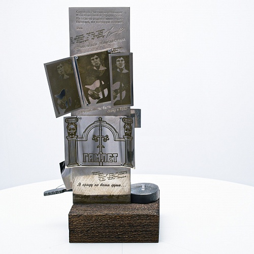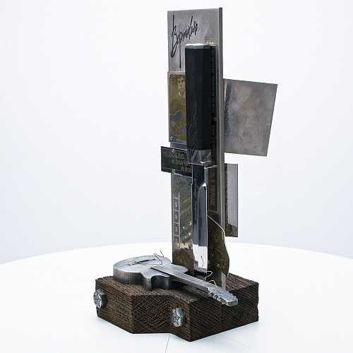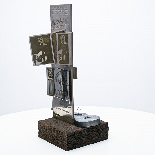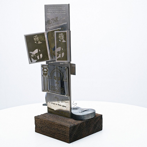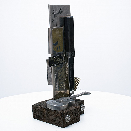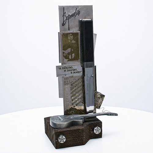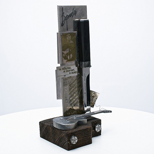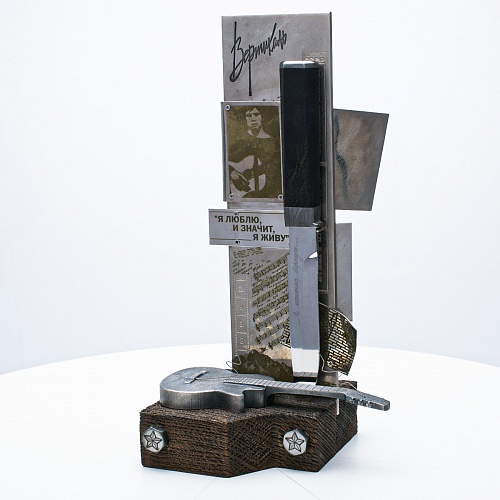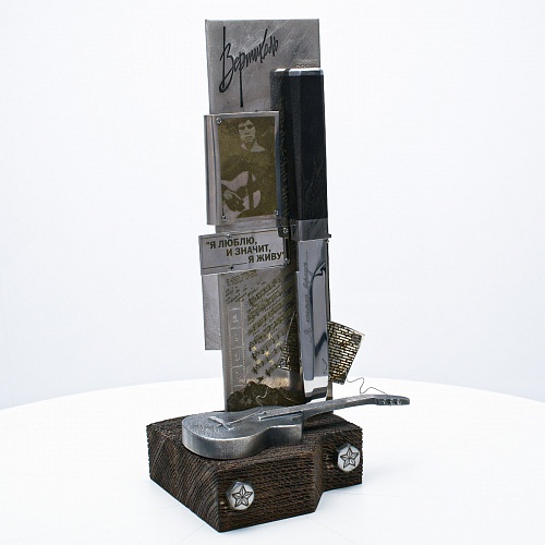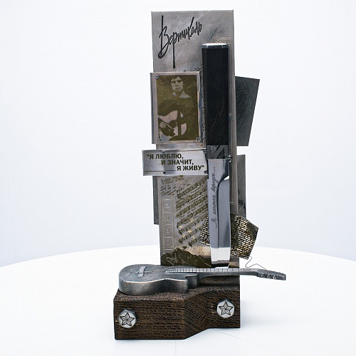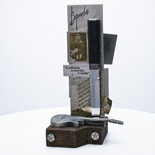 Семиструнная гитара занимает ключевое место во всей композиции. Видимо, с таким ее расположением и не поспоришь. Основание стелы выполнено из мореного дуба, как бы намекая на исконные корни автора. Одно из первостепенных мест в композиции занимает строчка «Я люблю и, значит, я живу» из его «Баллады о любви». Ведь любовь для всех нас, как и для Владимира Семеновича Высоцкого, является побуждающей движущей силой. Благодаря любви и глубоким внутренним переживаниям он творил для нас, а мы с большой любовью и по сей день слушаем его творения...