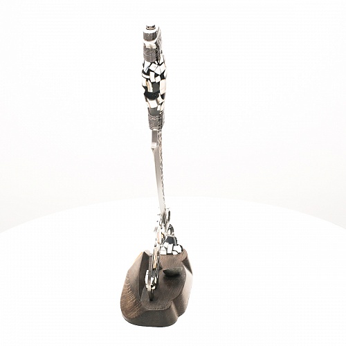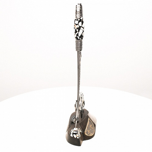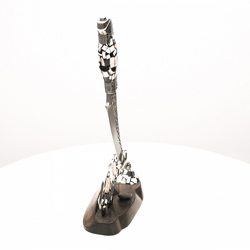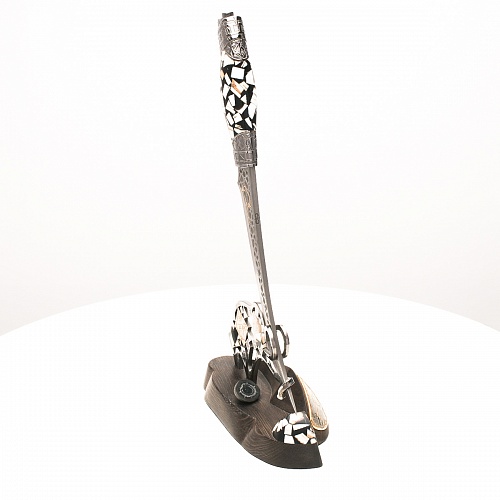 Рукоятка выполнена из акрила с инкрустацией кусочками слоновой кости. Они имитируют наскальные рисунки.
