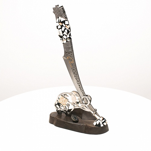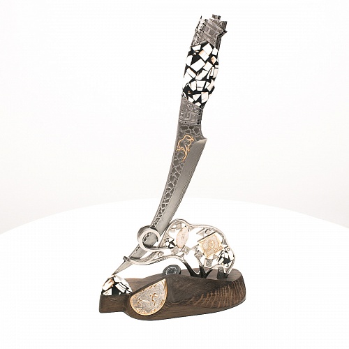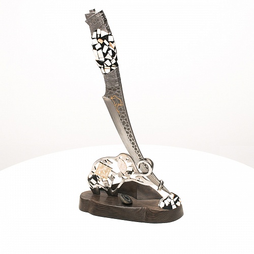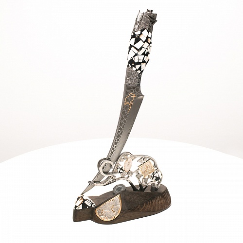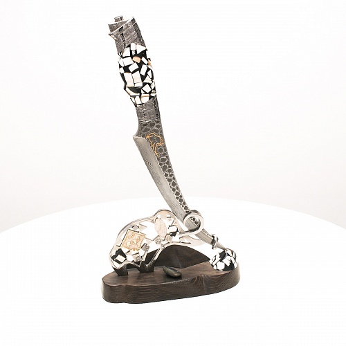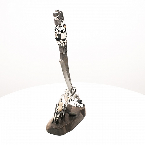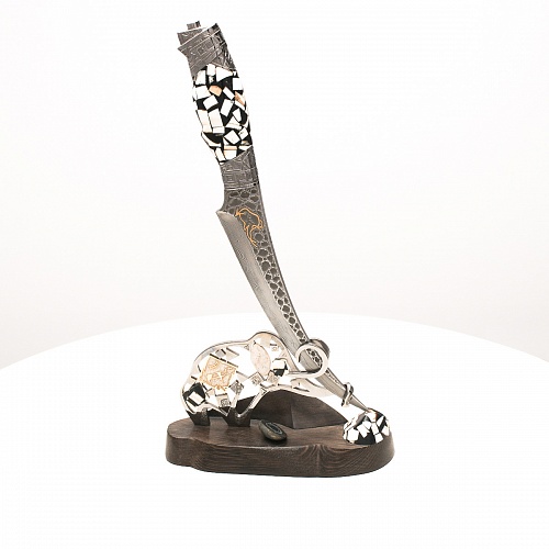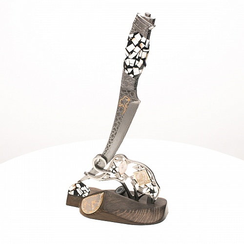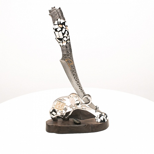 Основание выполнено из граба и слоновой кости с накладкой, на которой изображена сцена древней охоты на мамонта. Фигура металлического мамонта как будто держит выгнутый клинок между бивней. Основание композиции напоминает об эпохе вечной мерзлоты.