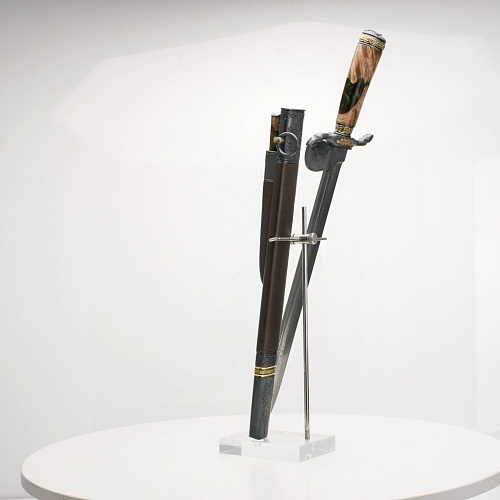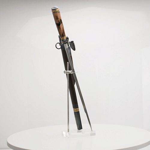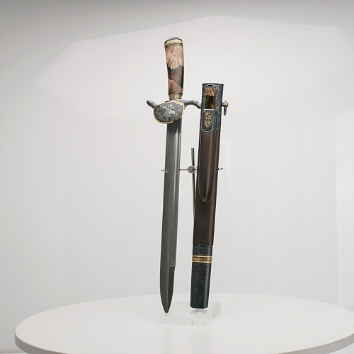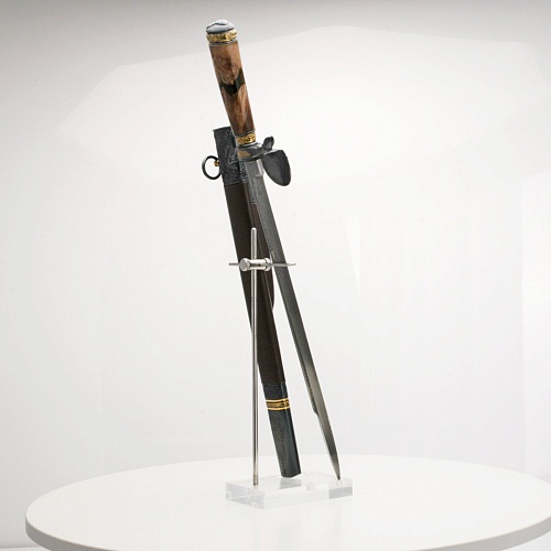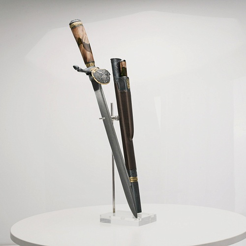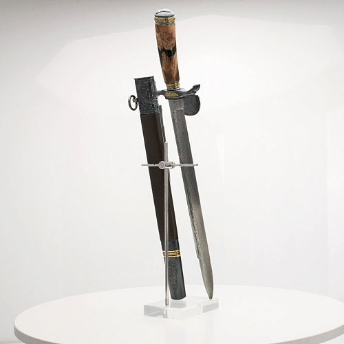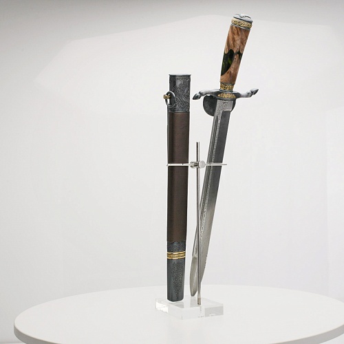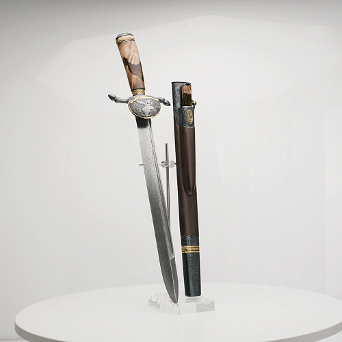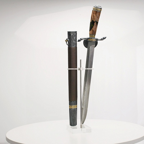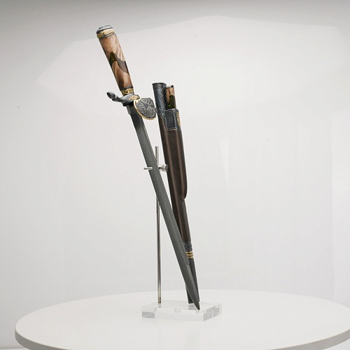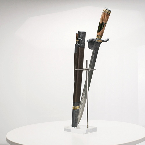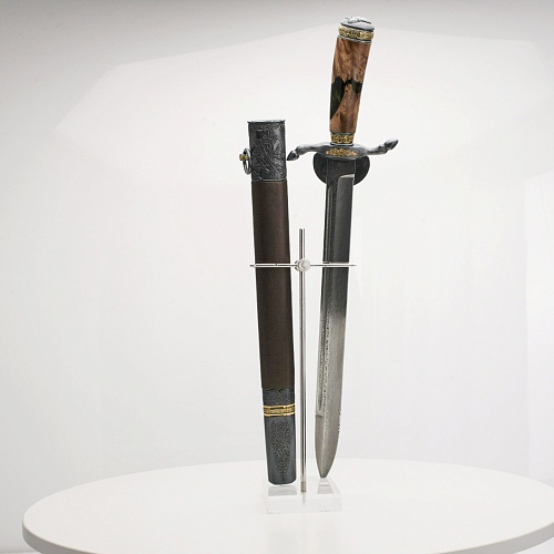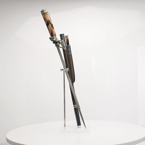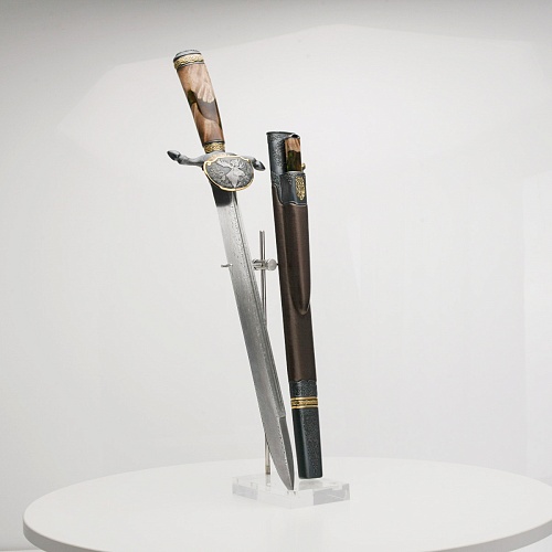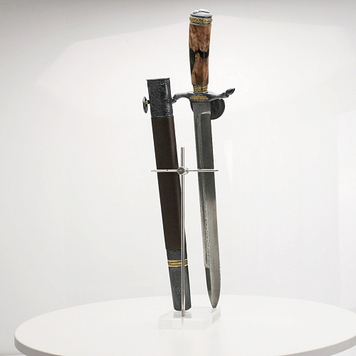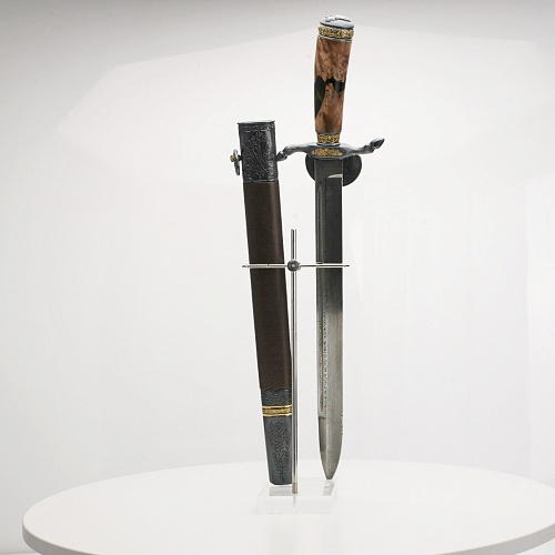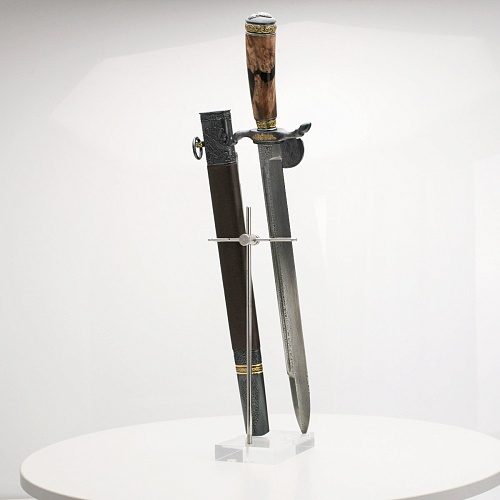 Авторский кинжал «Хиршфангер» был создан златоустовскими мастерами-оружейниками согласно европейским обычаям. Оружие внушительных размеров располагает клинком из авторского дамаска. Рукоять произведена из стабилизированного капа (Buckeye Burl). Концы крестовины выполнены в виде ножек оленя с изящными копытцами. У подножия крестовины расположен щит, имитирующий раковину, с тонкой гравировкой по металлу. Характерной чертой считаются ножны. В них закреплен вспомогательный кармашек, созданный с целью удерживания вкладываемого ножа небольших размеров – для прозаичных потребностей герцогов и монархов. Клинок вместе с ножнами декорирован в выдержанном «стиле королей». Образы желудей, дубовых листьев и геральдических знаков изящно украшают собой изделие.
