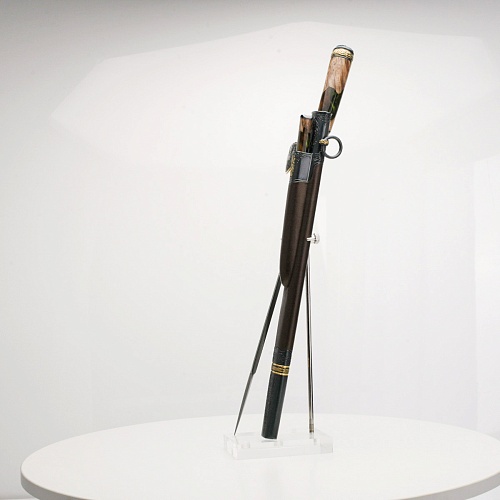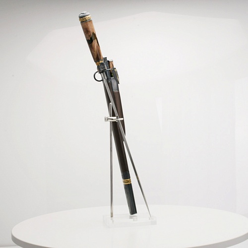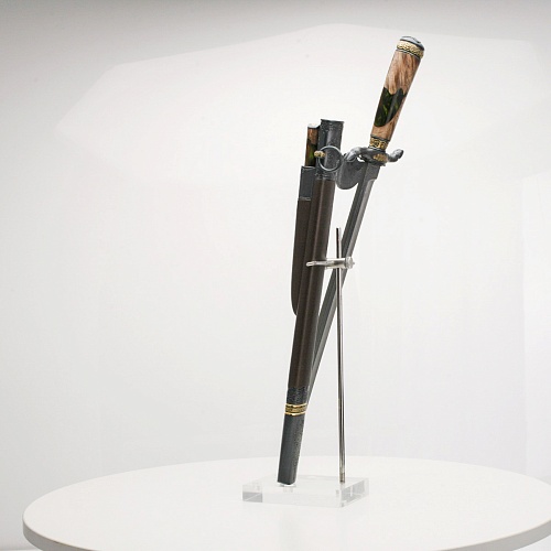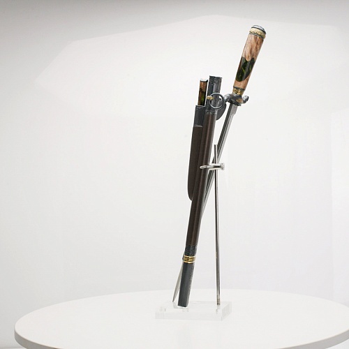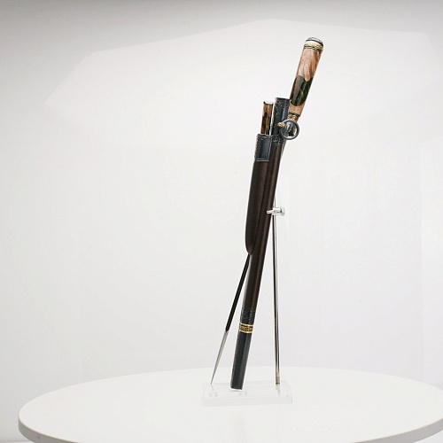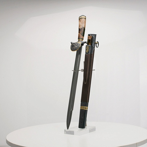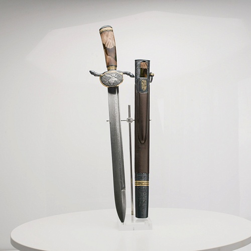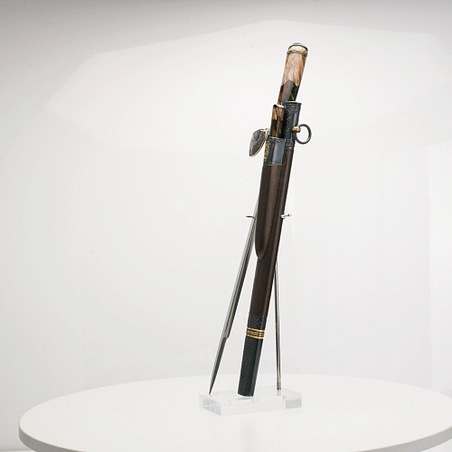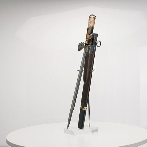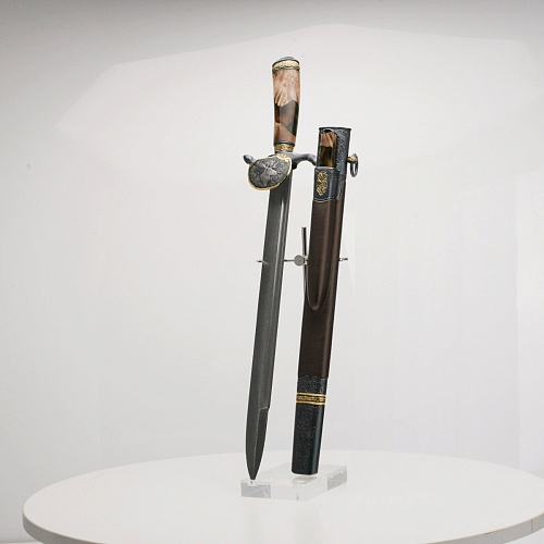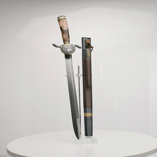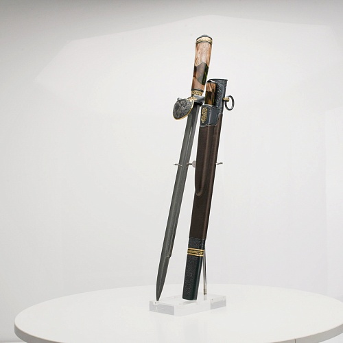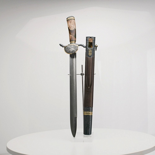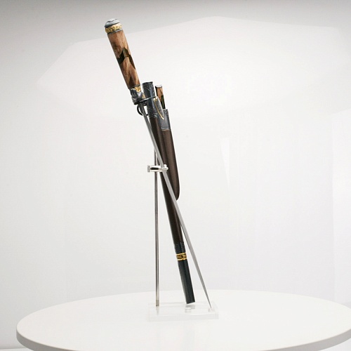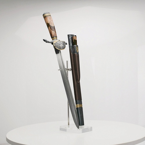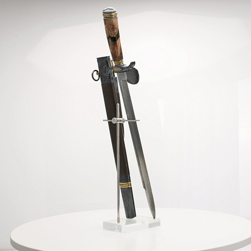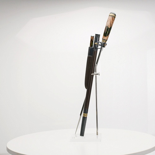 Авторский кинжал «Хиршфангер» был создан златоустовскими мастерами-оружейниками согласно европейским обычаям. Оружие внушительных размеров располагает клинком из авторского дамаска. Рукоять произведена из стабилизированного капа (Buckeye Burl). Концы крестовины выполнены в виде ножек оленя с изящными копытцами. У подножия крестовины расположен щит, имитирующий раковину, с тонкой гравировкой по металлу. Характерной чертой считаются ножны. В них закреплен вспомогательный кармашек, созданный с целью удерживания вкладываемого ножа небольших размеров – для прозаичных потребностей герцогов и монархов. Клинок вместе с ножнами декорирован в выдержанном «стиле королей». Образы желудей, дубовых листьев и геральдических знаков изящно украшают собой изделие.