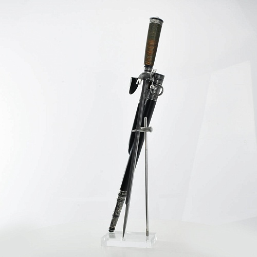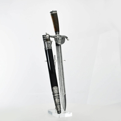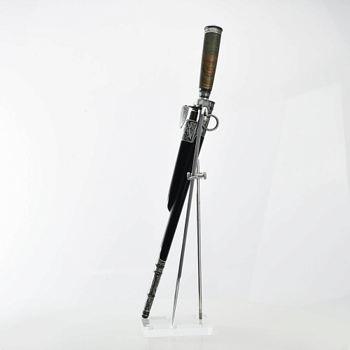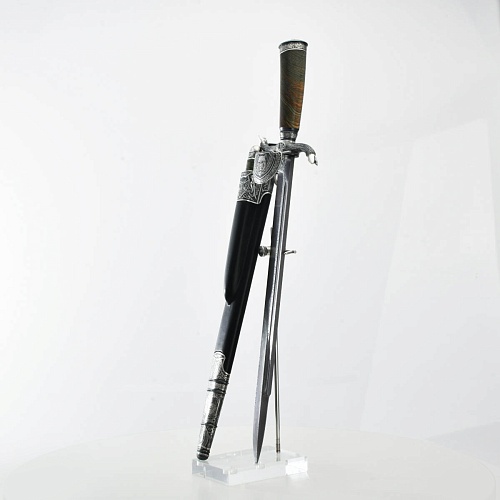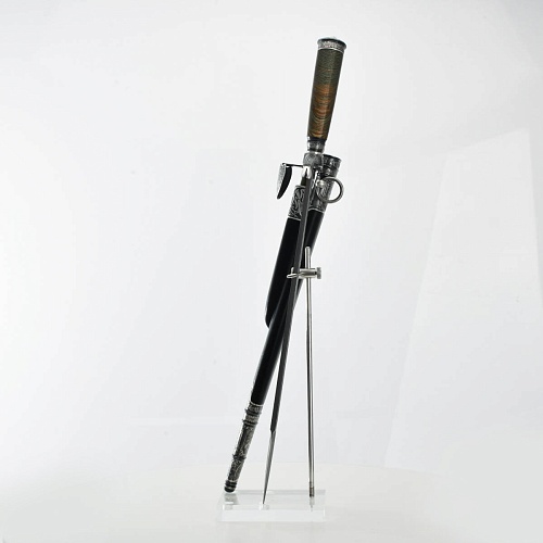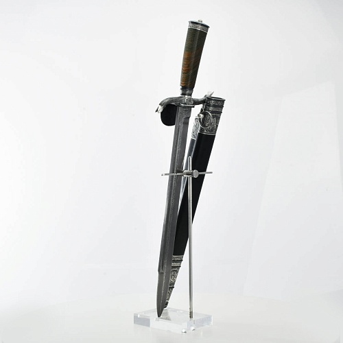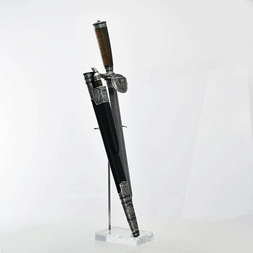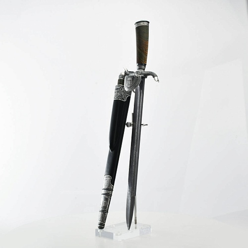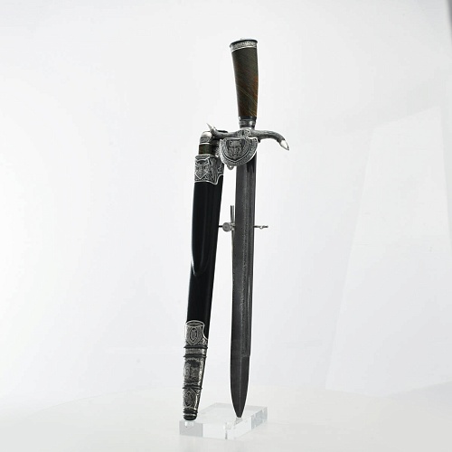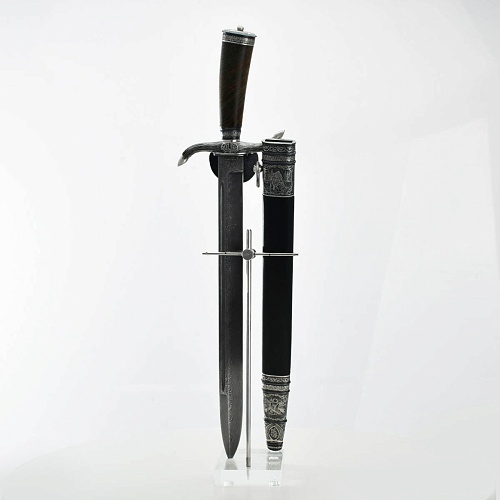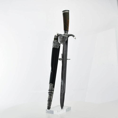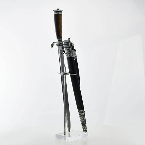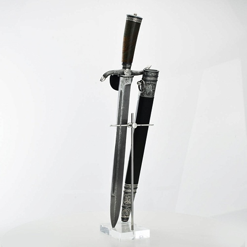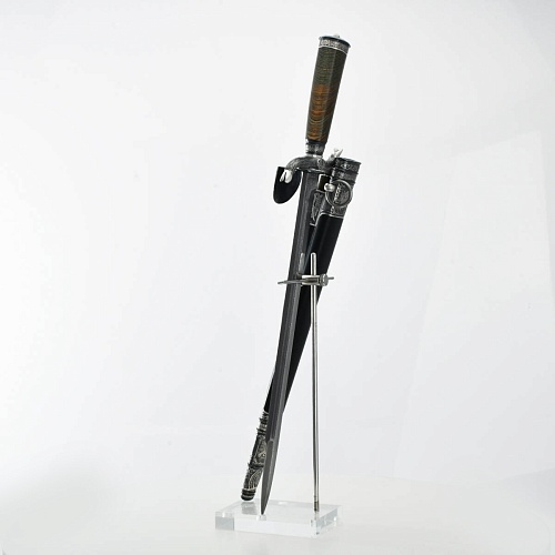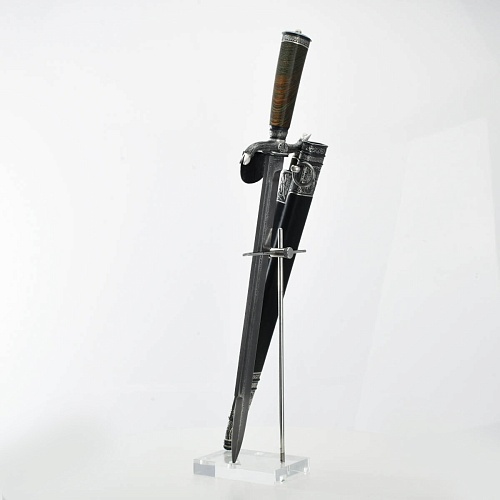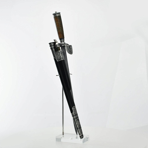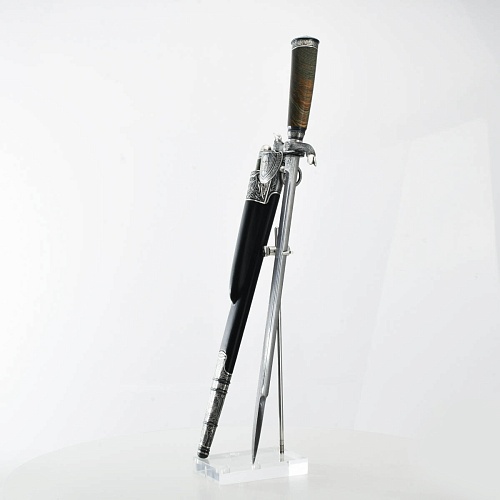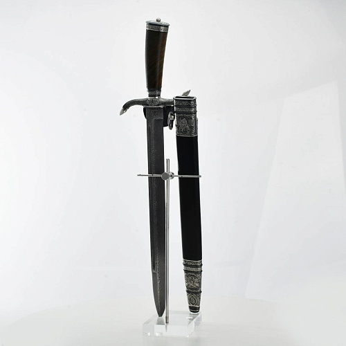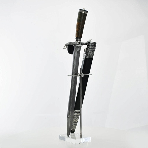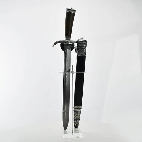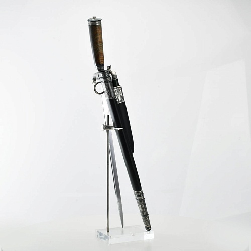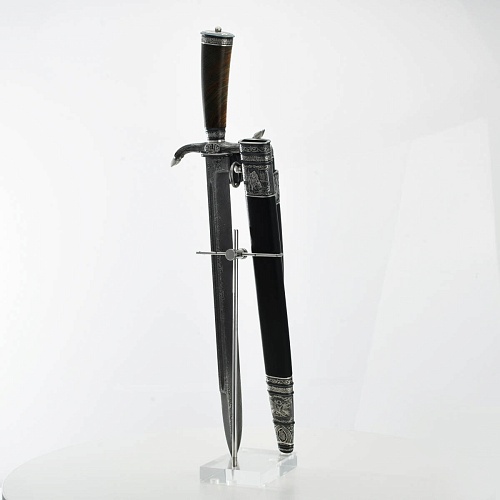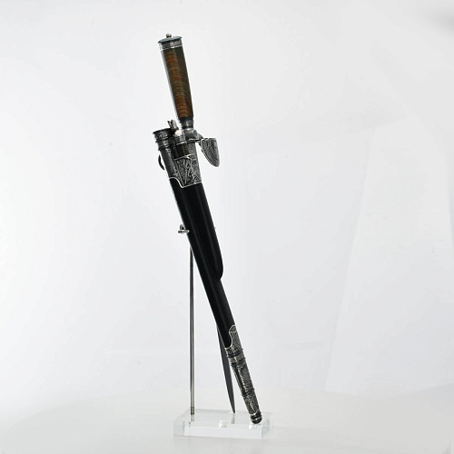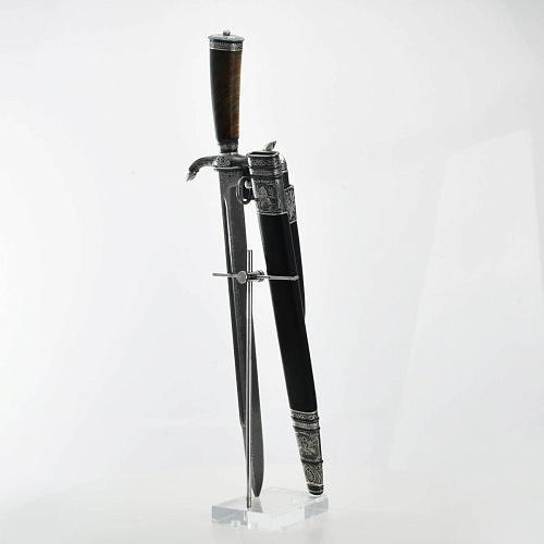Авторский кинжал «Хиршфангер» был создан златоустовскими мастерами-оружейниками согласно европейским обычаям. Оружие внушительных размеров располагает клинком из авторского дамаска. Рукоять произведена из стабилизированного капа (Buckeye Burl). Концы крестовины выполнены в виде головы оленя и гончей собаки. У подножия крестовины расположен щит, имитирующий раковину, с тонкой гравировкой по металлу. Характерной чертой считаются ножны. В них закреплен вспомогательный кармашек, созданный с целью удерживания вкладываемого ножа небольших размеров – для прозаичных потребностей герцогов и монархов. Клинок вместе с ножнами декорирован в выдержанном «стиле королей». Образы лесных зверей, символы царской охоты и геральдические знаки изящно украшают собой изделие.