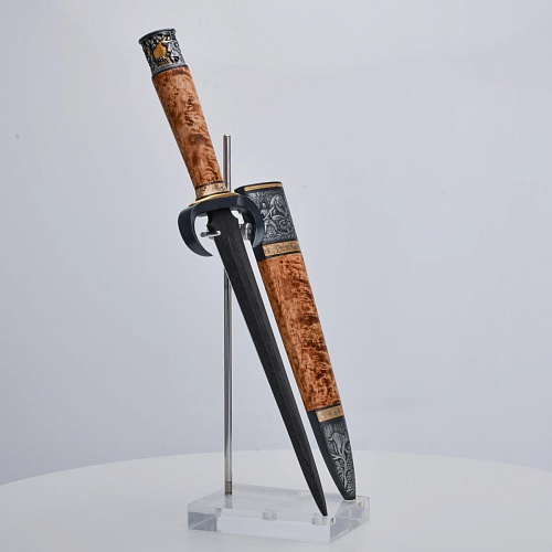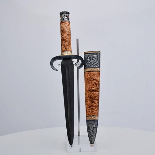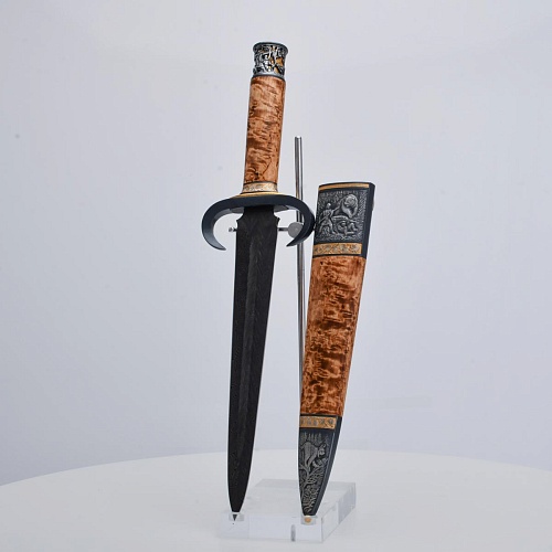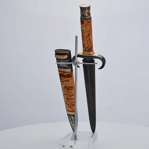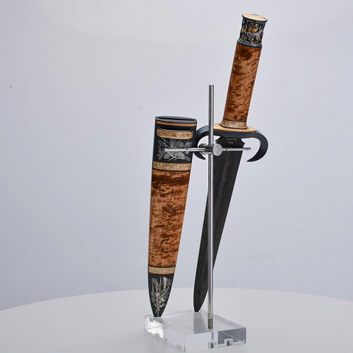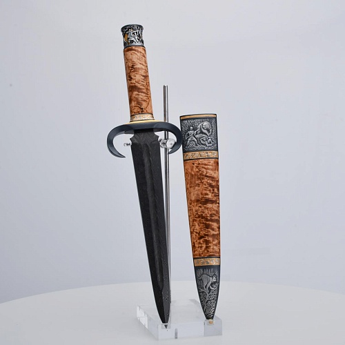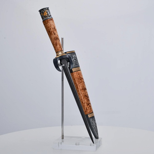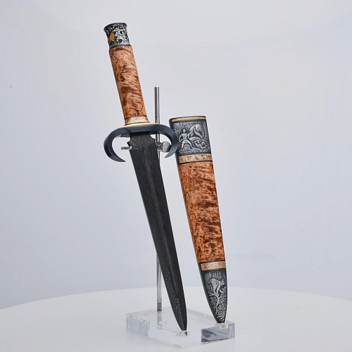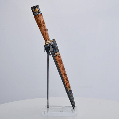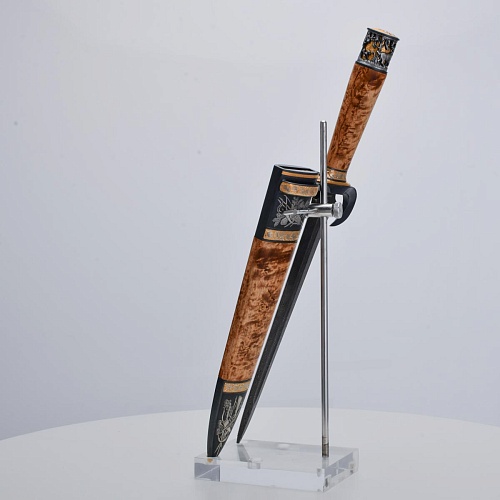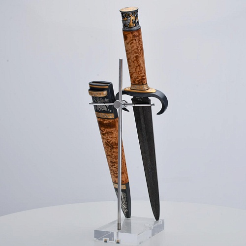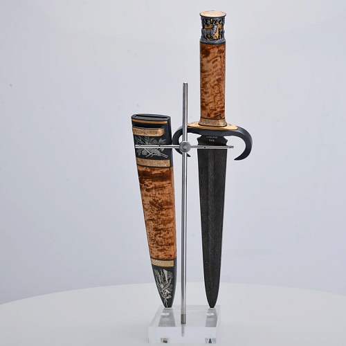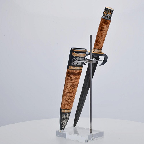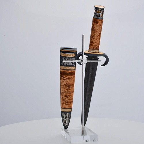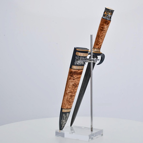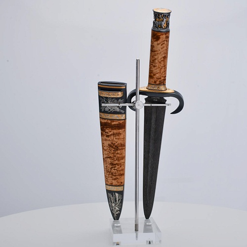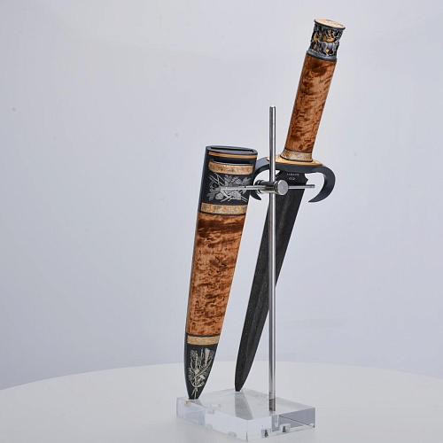 Березовый кап был выбран для изготовления рукояти и деревянной части ножен. Металлические детали кинжала покрыты драгоценными металлами: золотом (1 мкм) и родием (1 мкм). Навершие уникально. Внутренняя его деталь декорирована очень тонко выгравированными на ней вековыми соснами. Наружная просечная деталь описывает сцену охоты в миниатюре. Изображение уникально тем, что при вращении кинжала в руках охотничья сцена полностью рассматривается. Два охотника выслеживают прекрасного благородного оленя.
