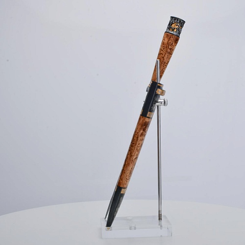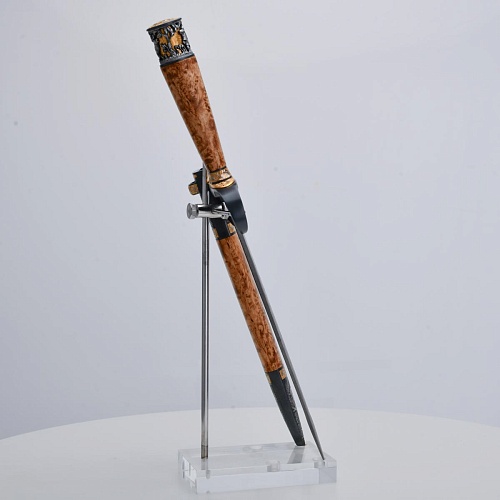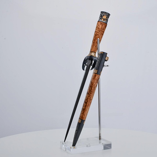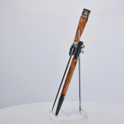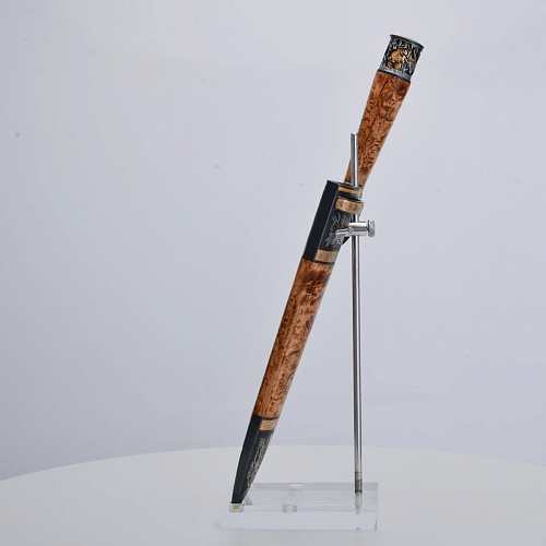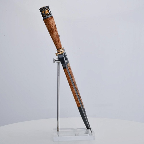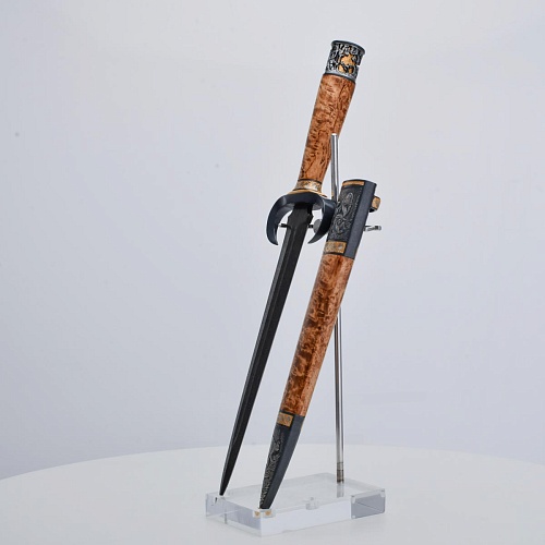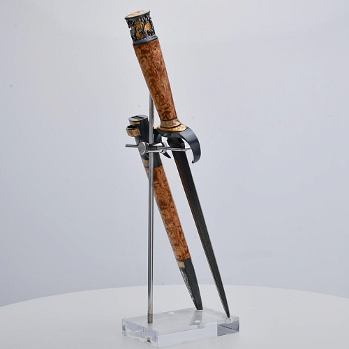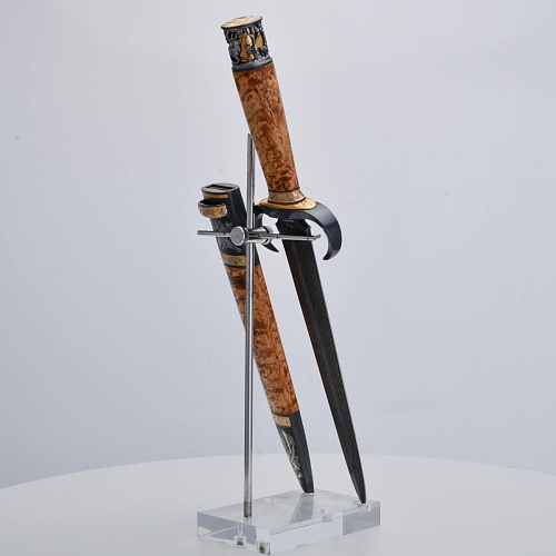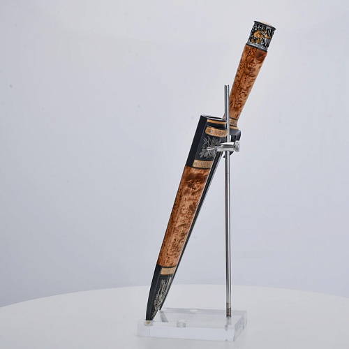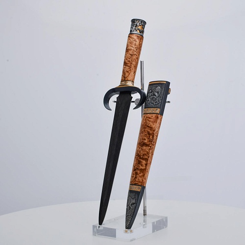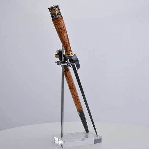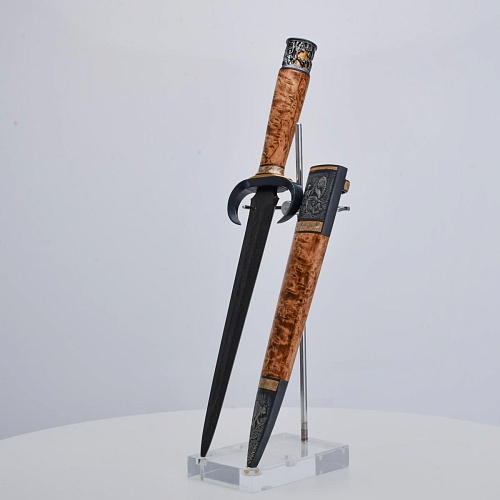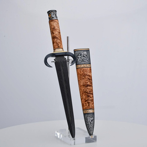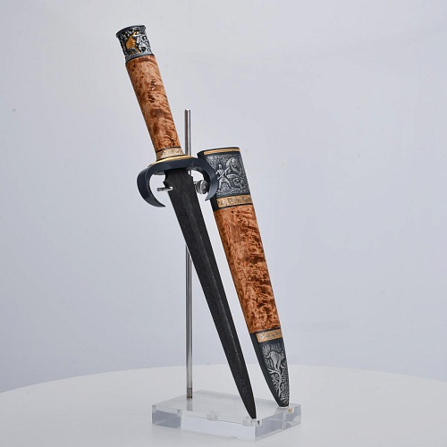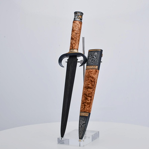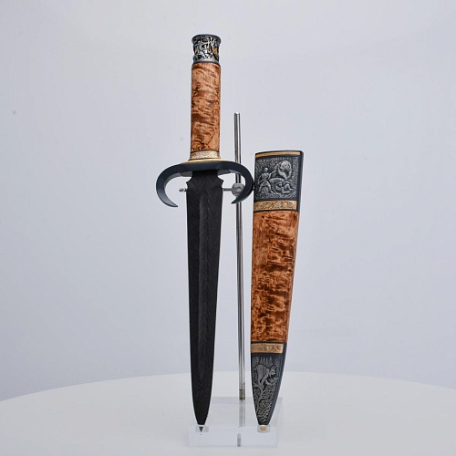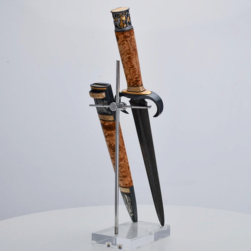 Березовый кап был выбран для изготовления рукояти и деревянной части ножен. Металлические детали кинжала покрыты драгоценными металлами: золотом (1 мкм) и родием (1 мкм). Навершие уникально. Внутренняя его деталь декорирована очень тонко выгравированными на ней вековыми соснами. Наружная просечная деталь описывает сцену охоты в миниатюре. Изображение уникально тем, что при вращении кинжала в руках охотничья сцена полностью рассматривается. Два охотника выслеживают прекрасного благородного оленя.