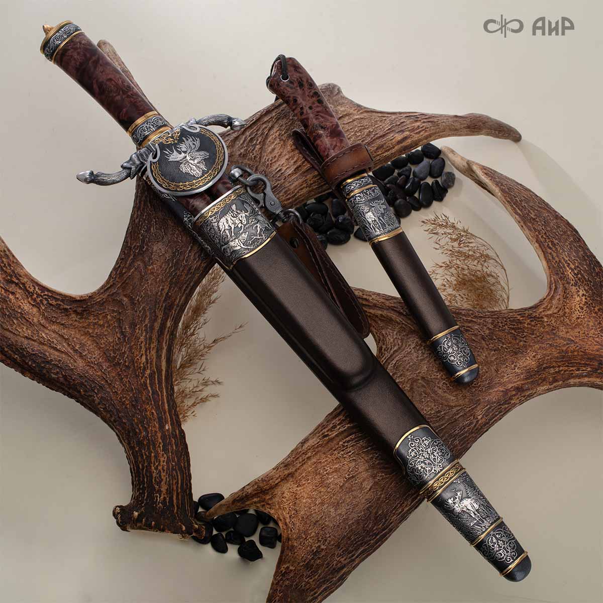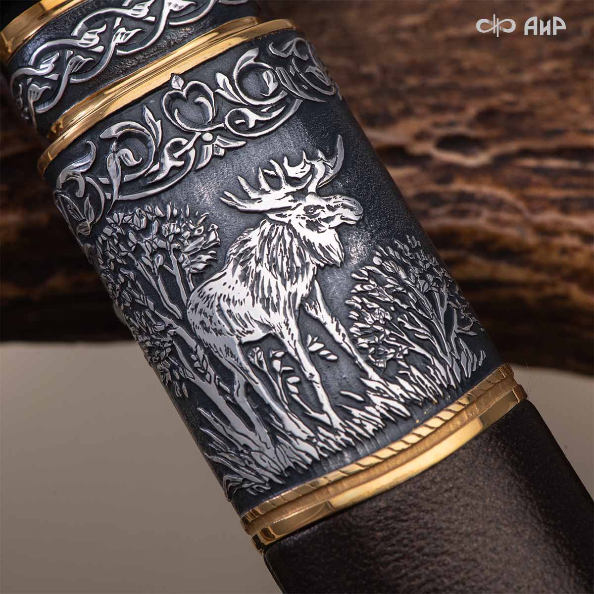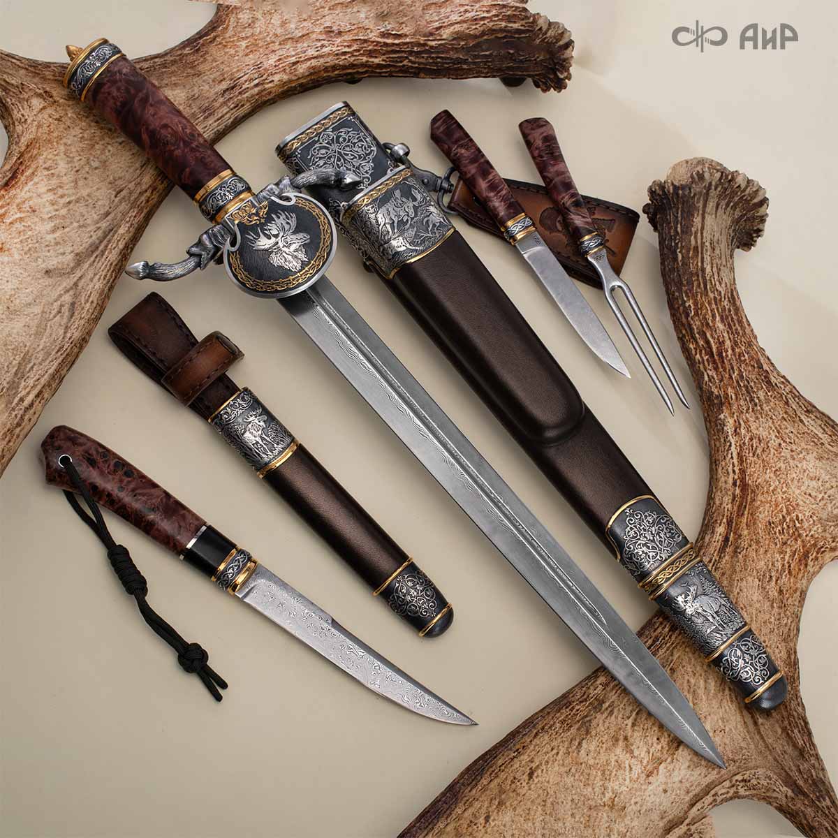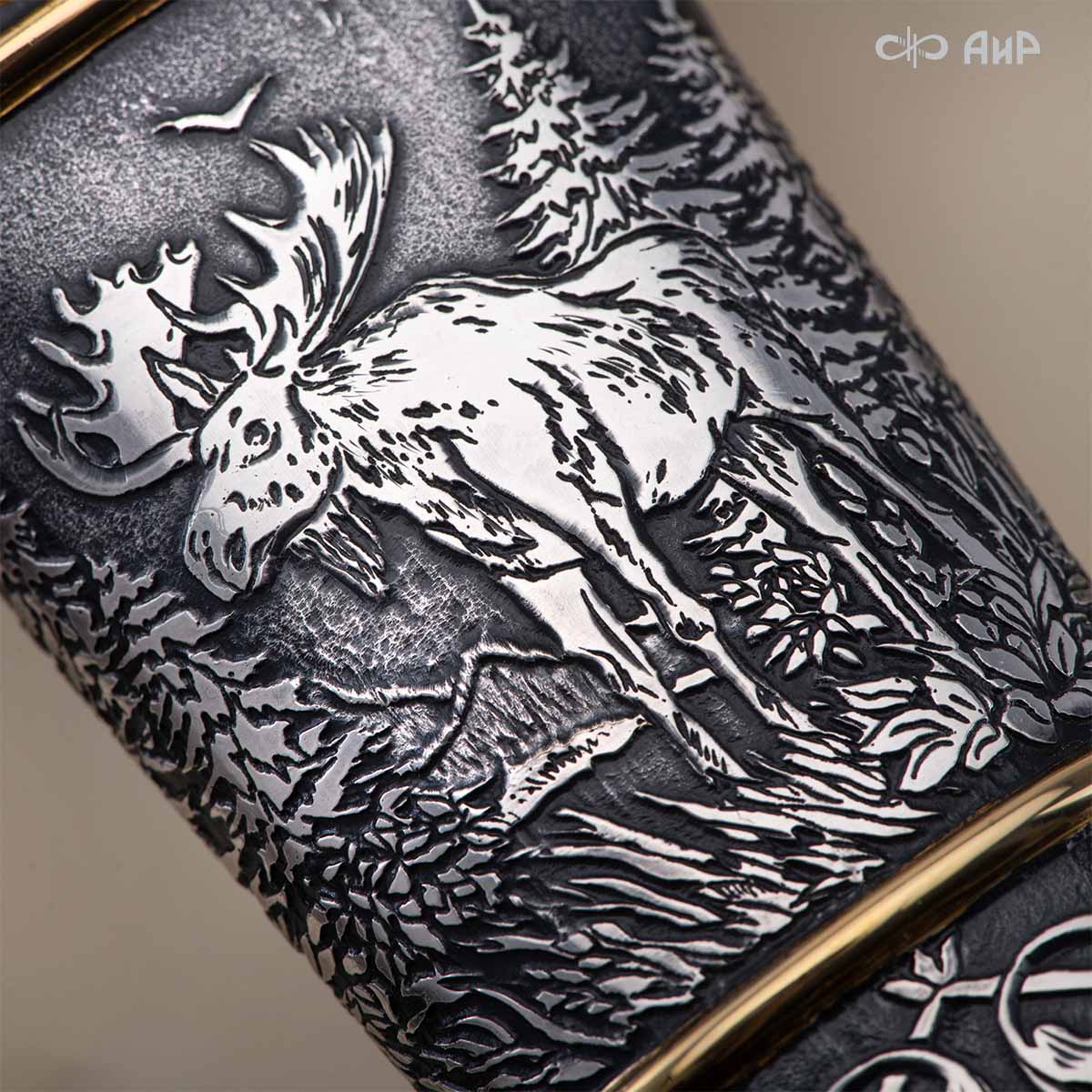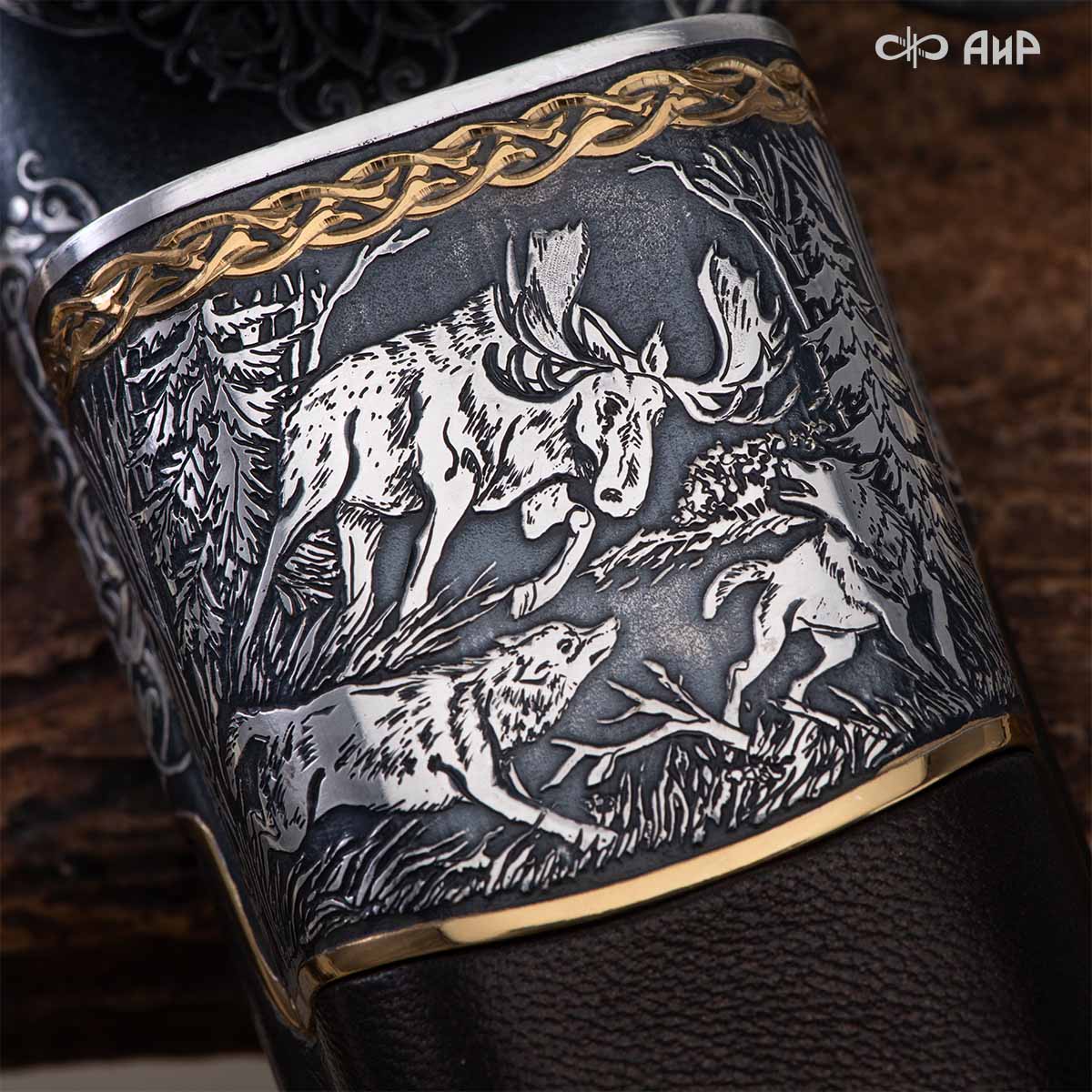 Оружейники и художники Компании «АиР», авторы современной версии хиршфангера, создали изделие в духе европейских традиций, с применением техники златоустовской гравюры на металле. Свое название – «Великаны леса» охотничий гарнитур получил по двум причинам: 1) на щитке хиршфангера изображен гордый лось в ореоле из орнамента – как главный трофей лесной охоты, 2) металлические детали ножен хиршфангера и Финского ножа украшены природными пейзажами с лосями.