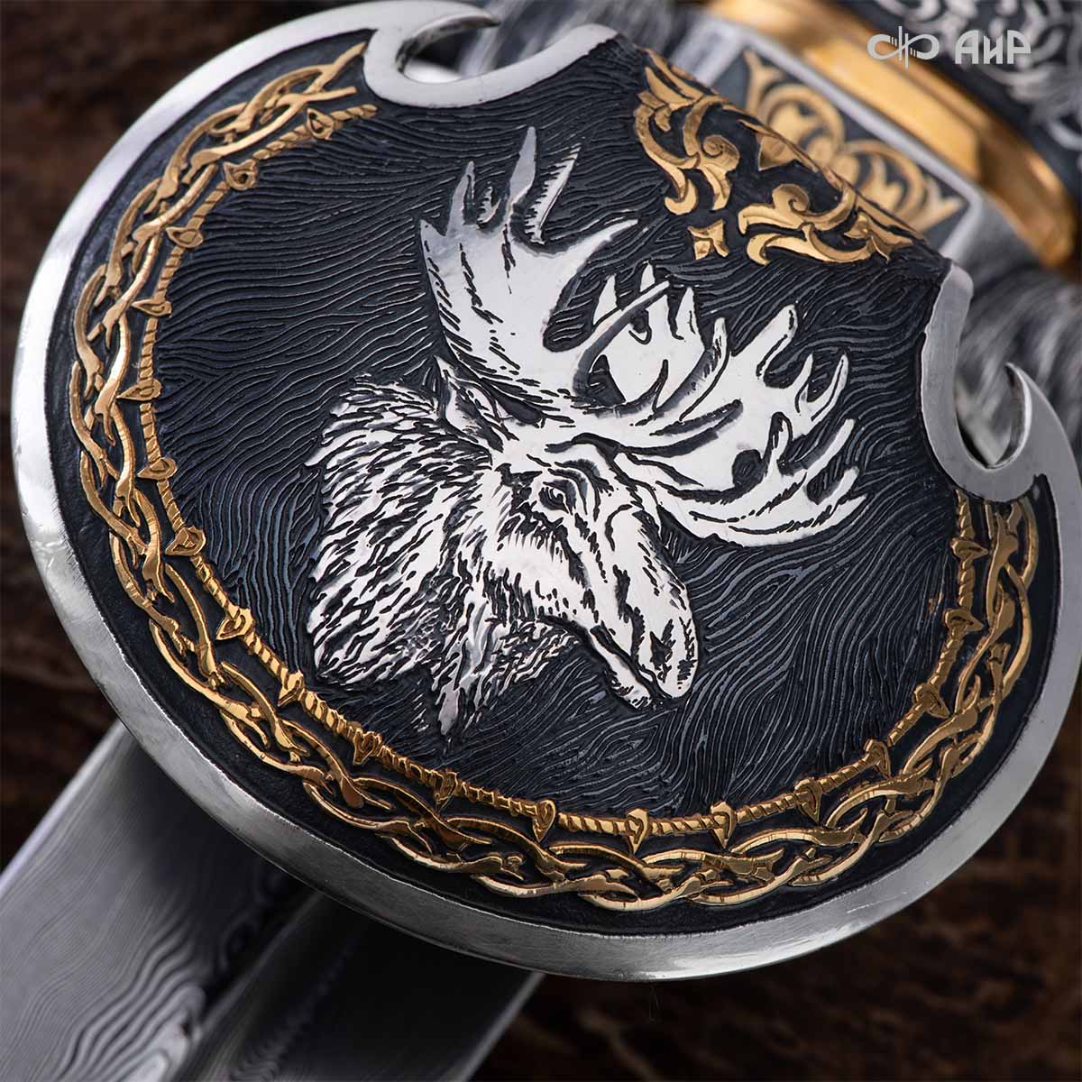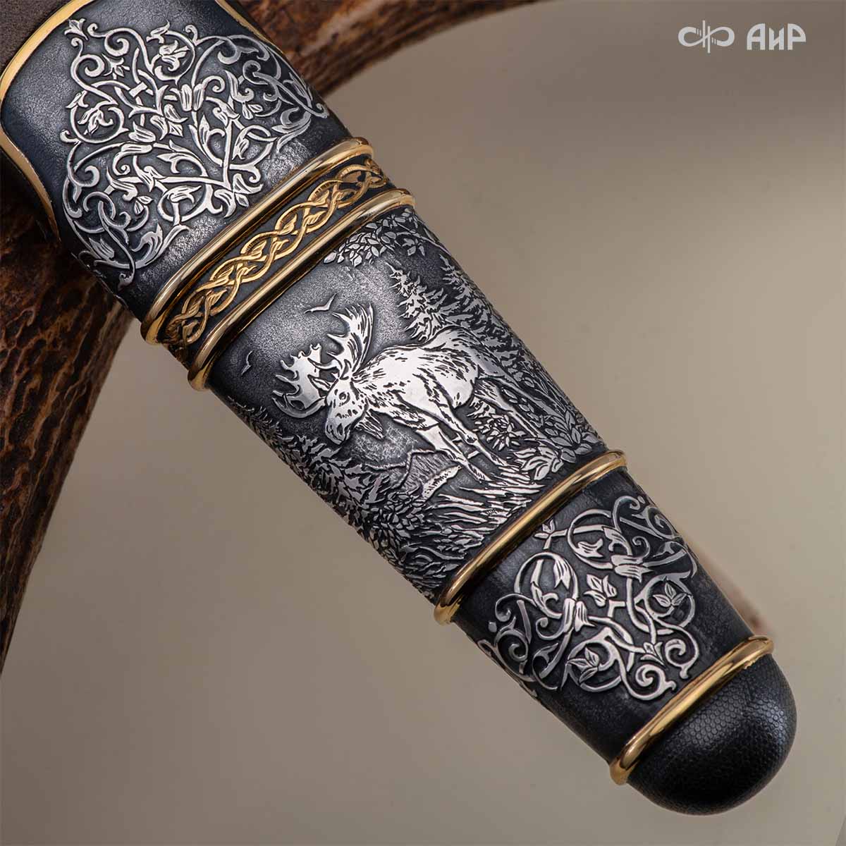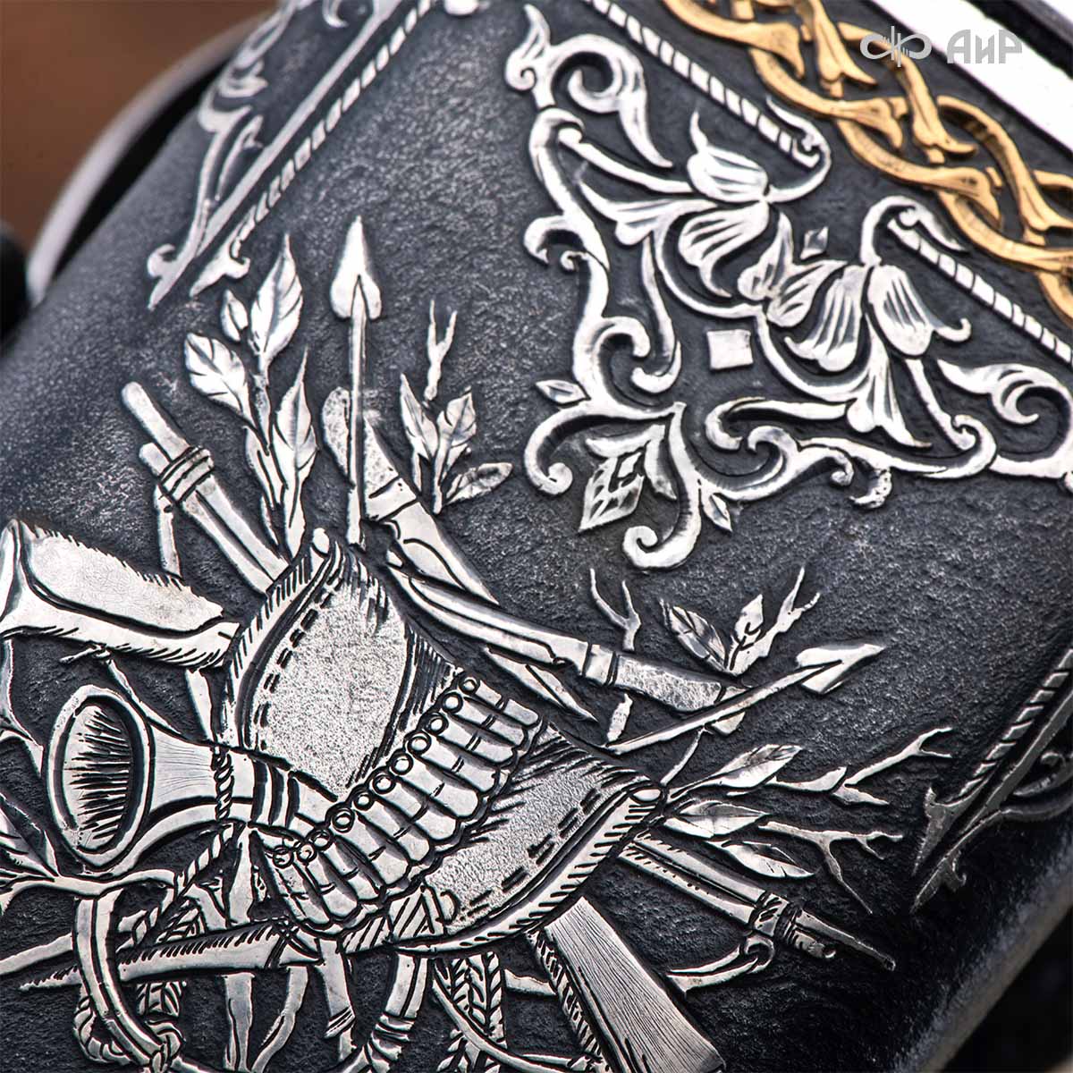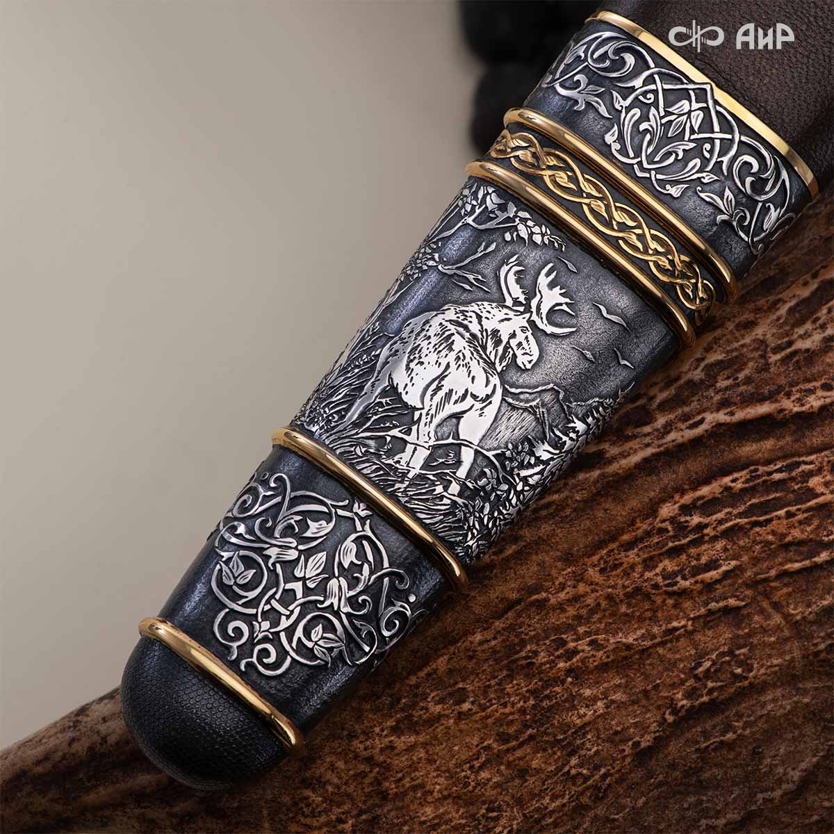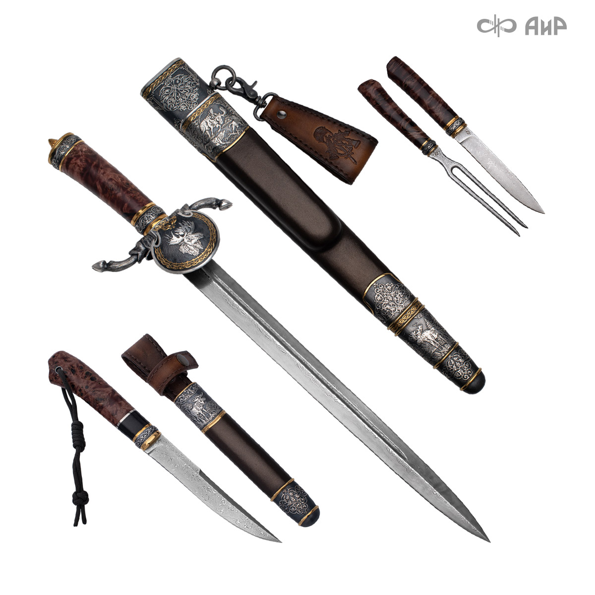 Оружейники и художники Компании «АиР», авторы современной версии хиршфангера, создали изделие в духе европейских традиций, с применением техники златоустовской гравюры на металле. Свое название – «Великаны леса» охотничий гарнитур получил по двум причинам: 1) на щитке хиршфангера изображен гордый лось в ореоле из орнамента – как главный трофей лесной охоты, 2) металлические детали ножен хиршфангера и Финского ножа украшены природными пейзажами с лосями.
