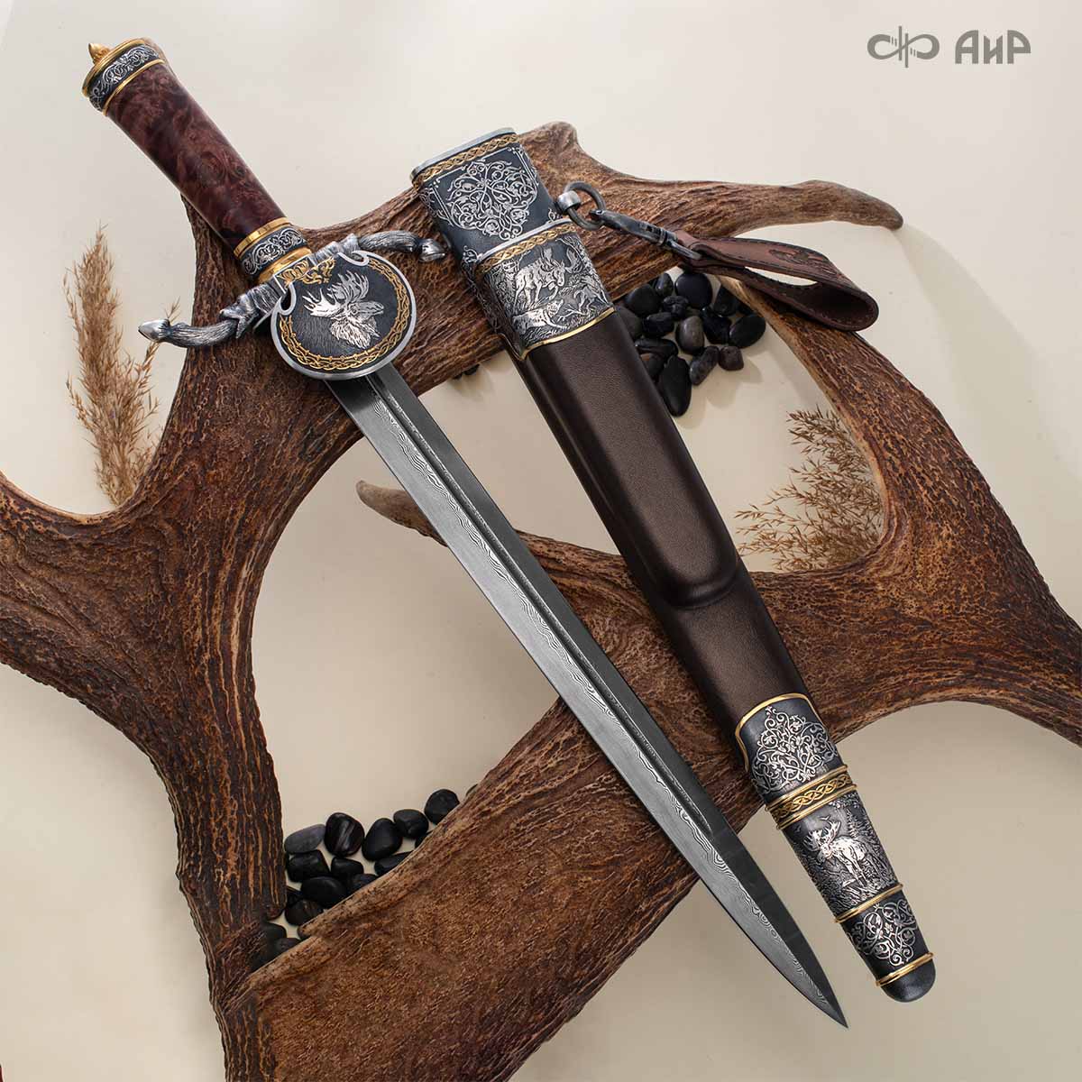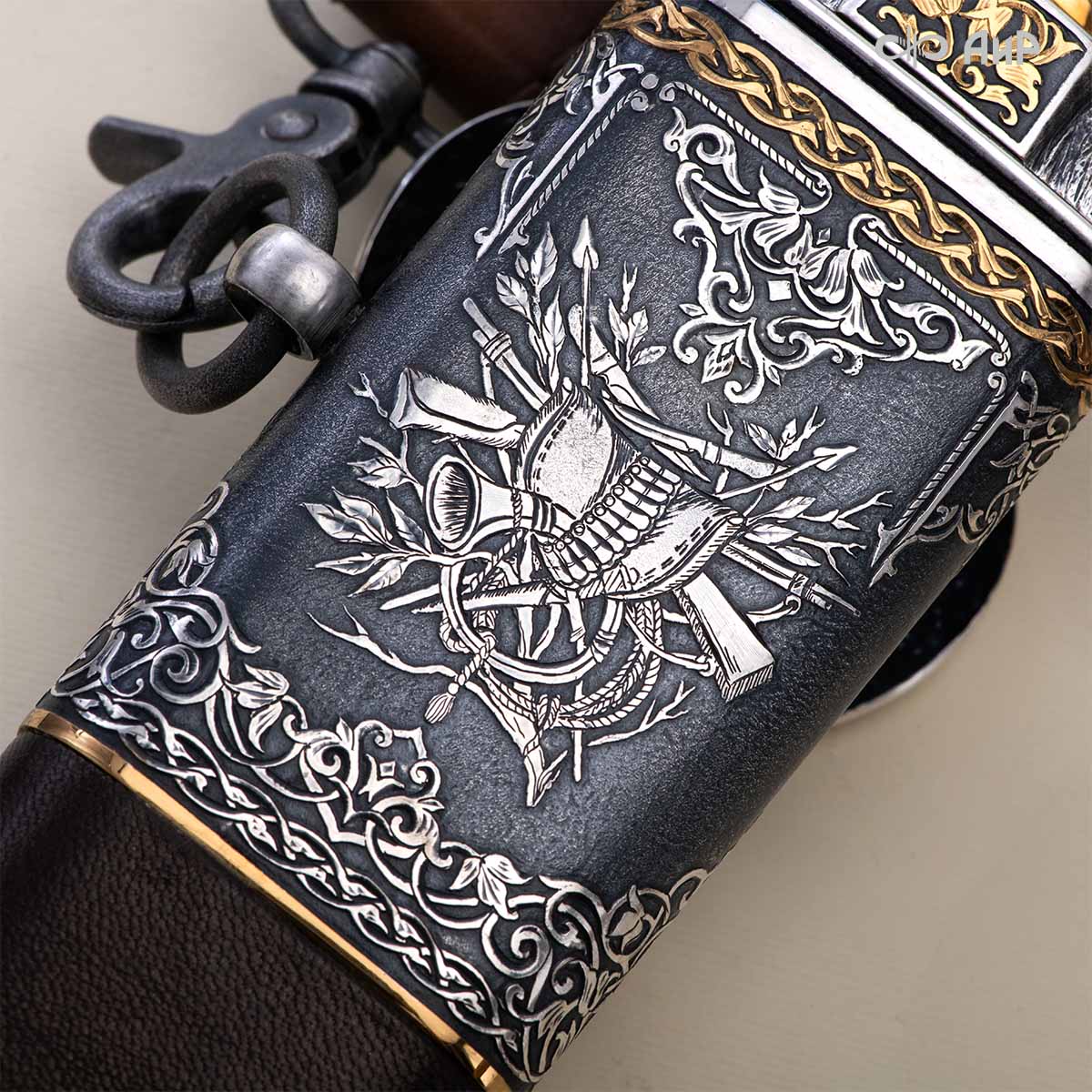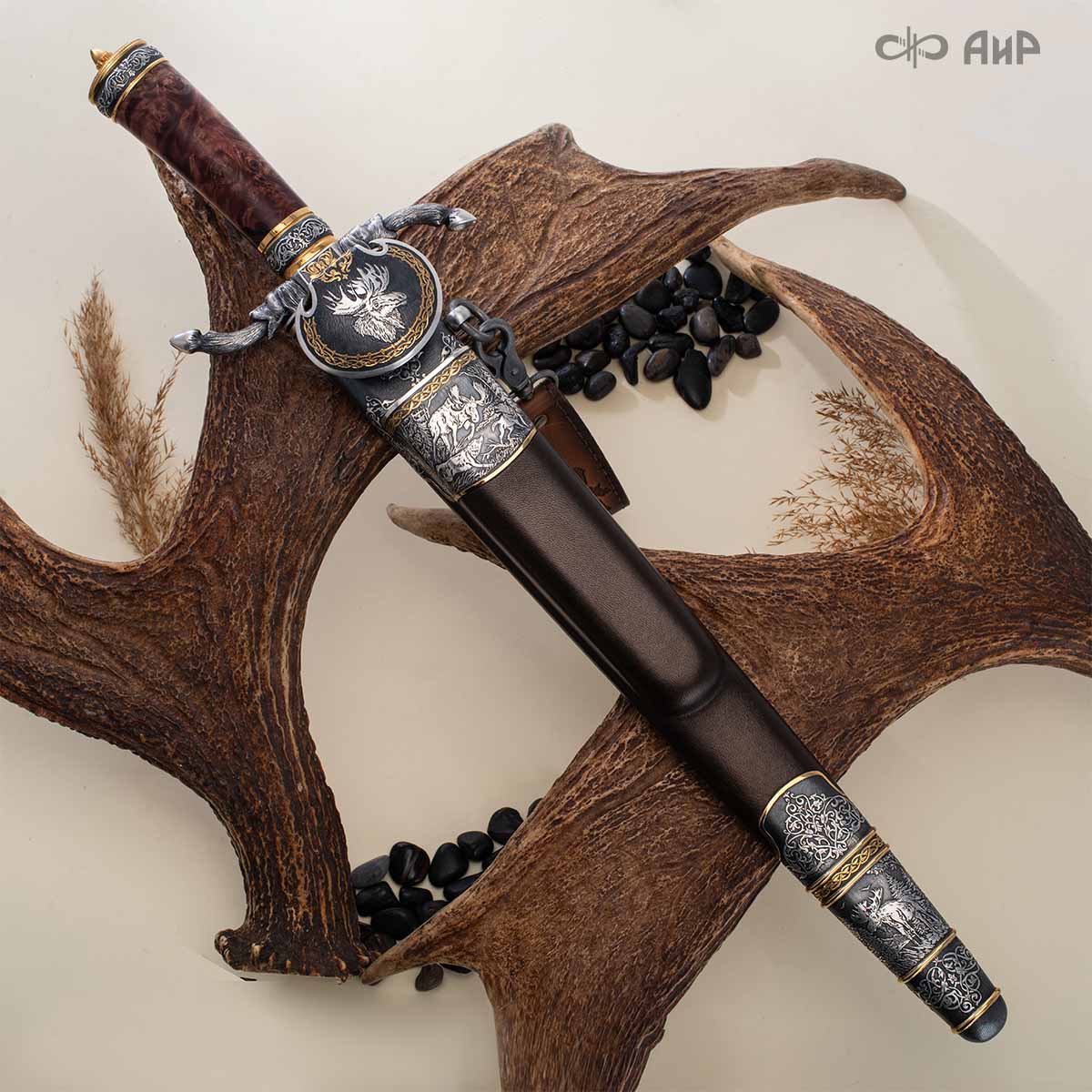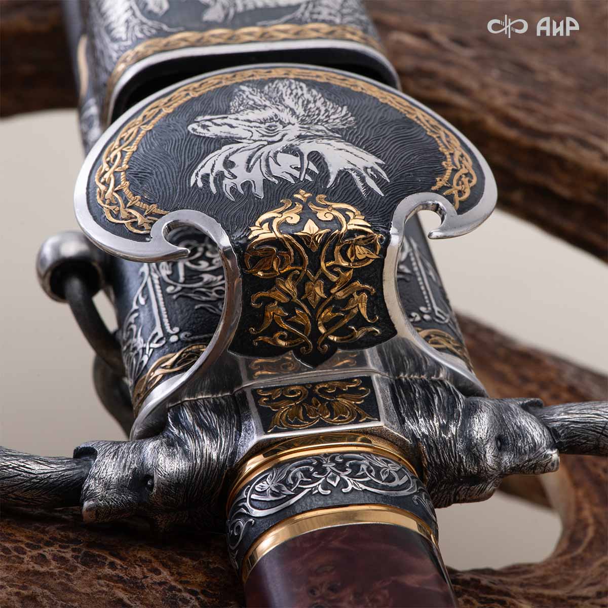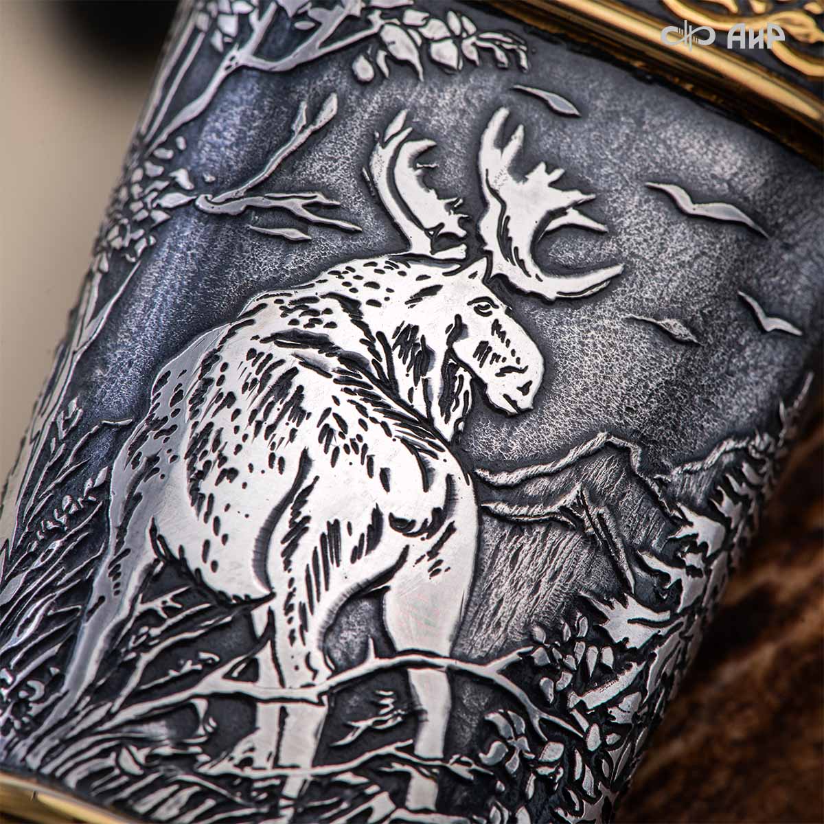 Оружейники и художники Компании «АиР», авторы современной версии хиршфангера, создали изделие в духе европейских традиций, с применением техники златоустовской гравюры на металле. Свое название – «Великаны леса» охотничий гарнитур получил по двум причинам: 1) на щитке хиршфангера изображен гордый лось в ореоле из орнамента – как главный трофей лесной охоты, 2) металлические детали ножен хиршфангера и Финского ножа украшены природными пейзажами с лосями.