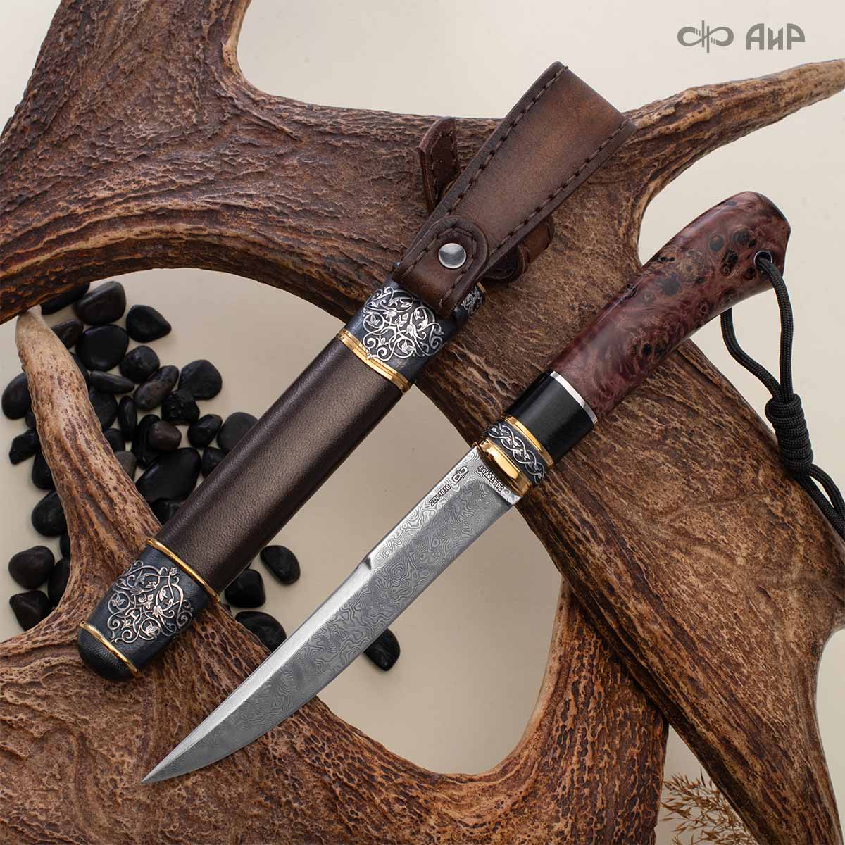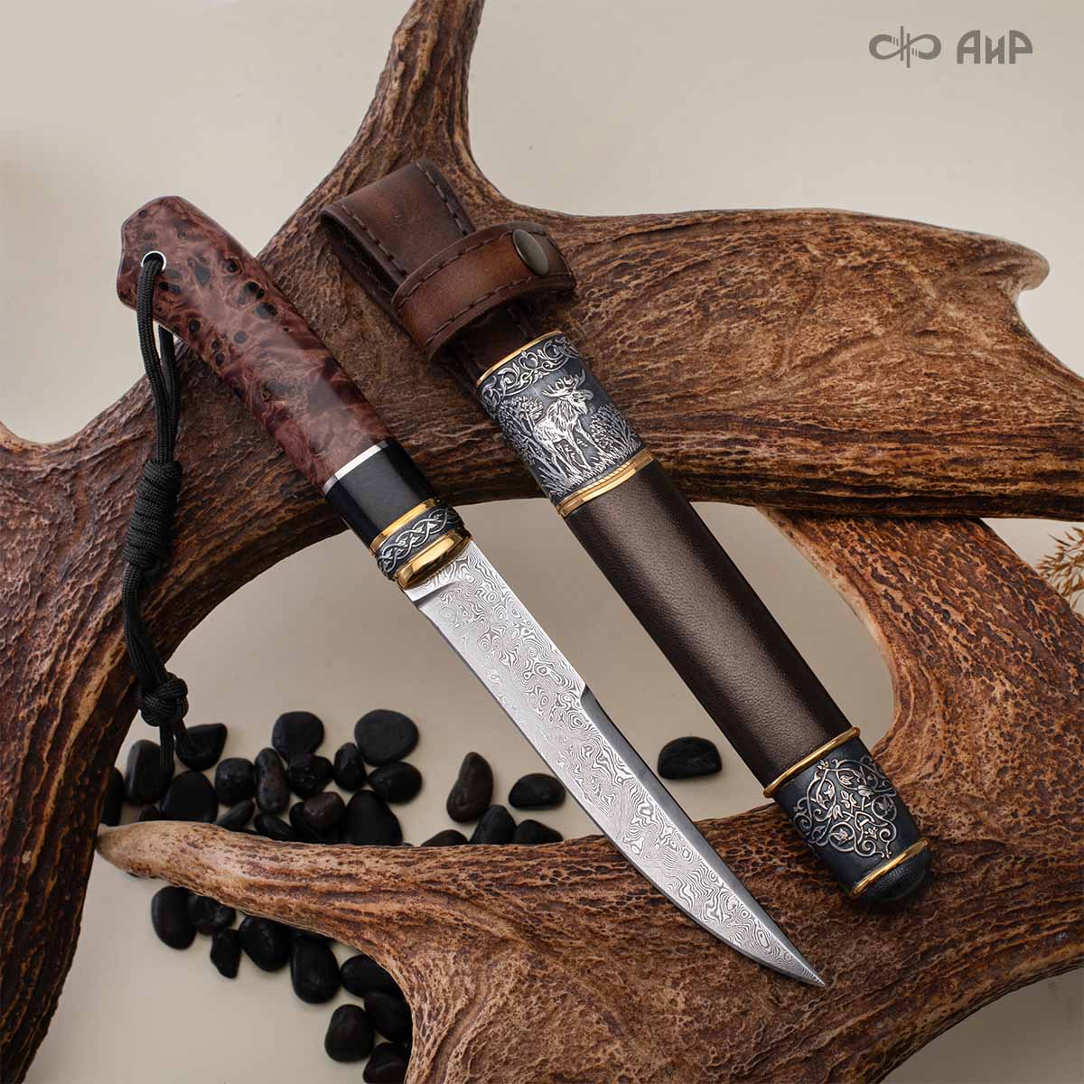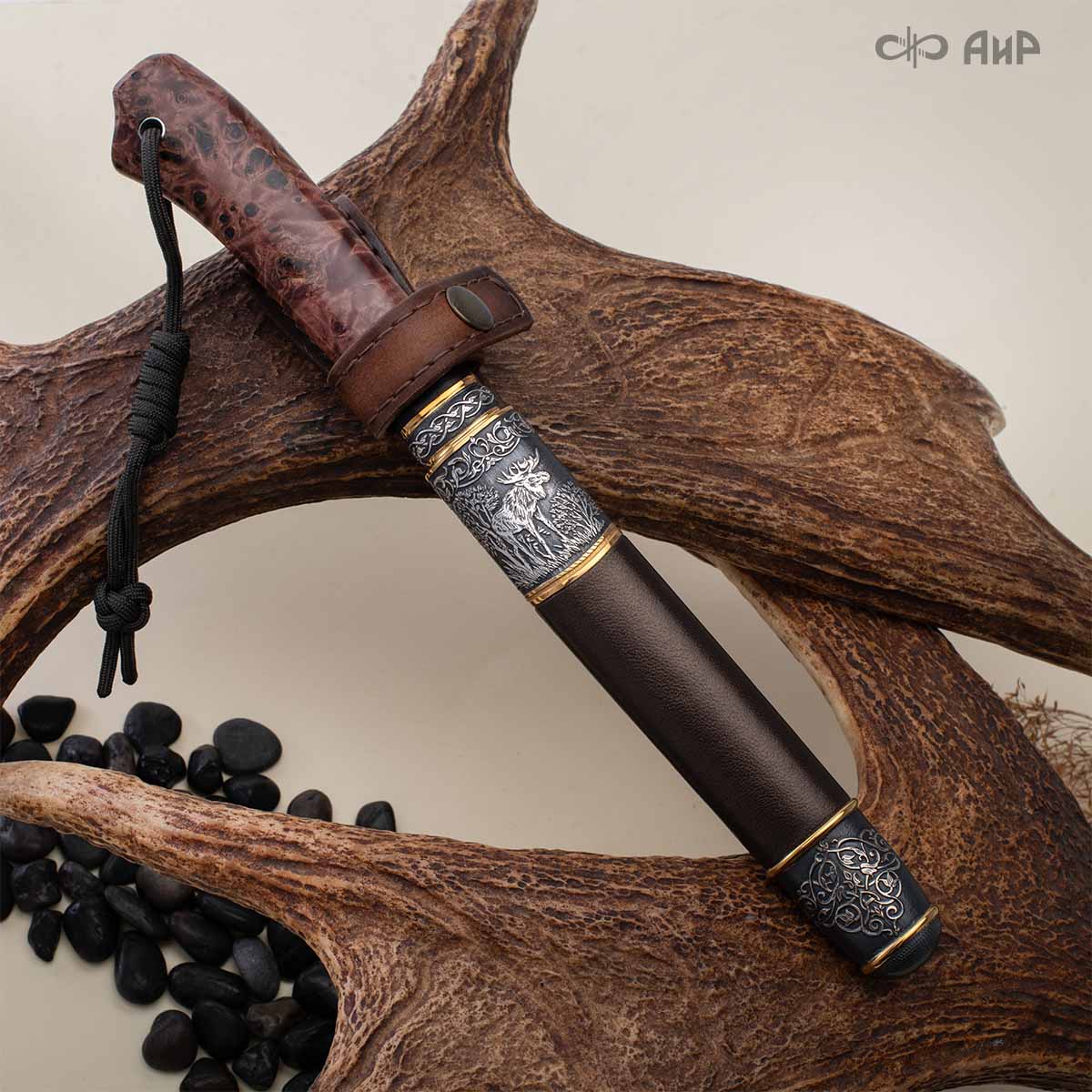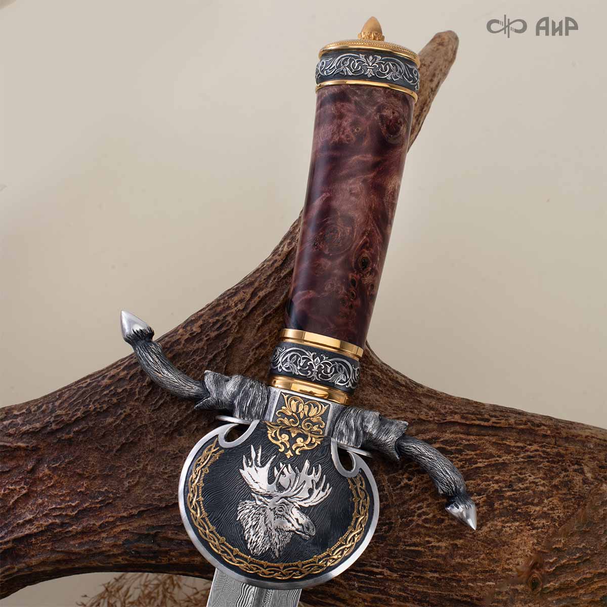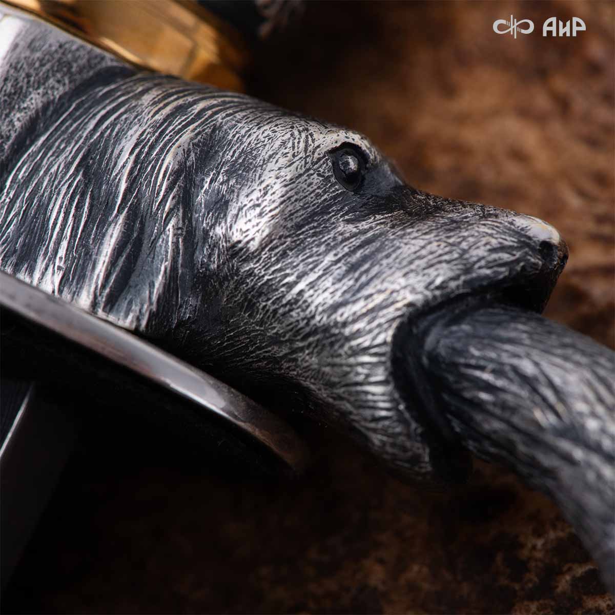 Оружейники и художники Компании «АиР», авторы современной версии хиршфангера, создали изделие в духе европейских традиций, с применением техники златоустовской гравюры на металле. Свое название – «Великаны леса» охотничий гарнитур получил по двум причинам: 1) на щитке хиршфангера изображен гордый лось в ореоле из орнамента – как главный трофей лесной охоты, 2) металлические детали ножен хиршфангера и Финского ножа украшены природными пейзажами с лосями.