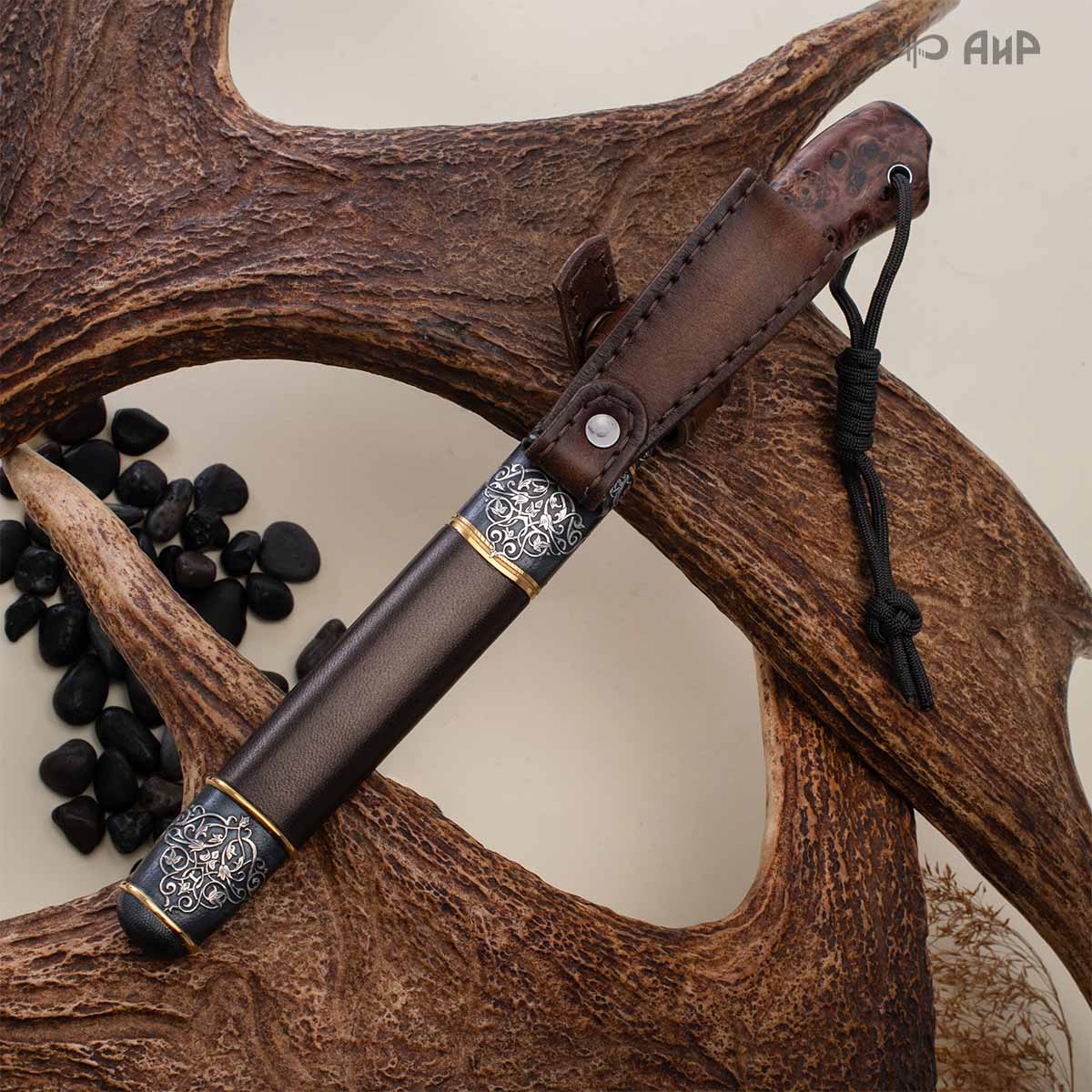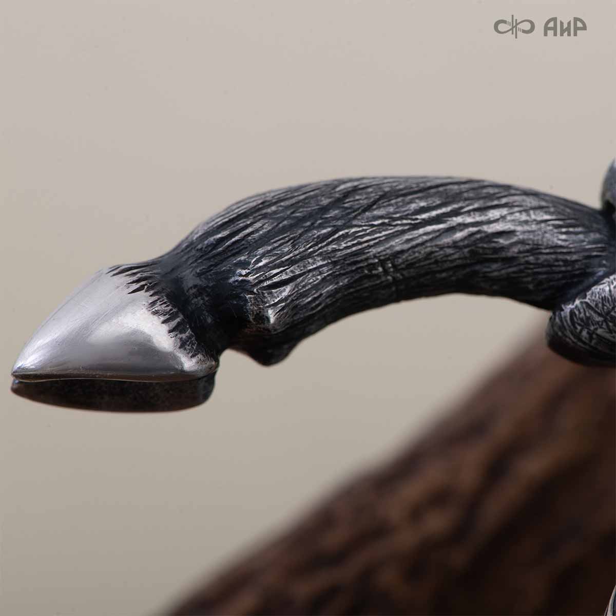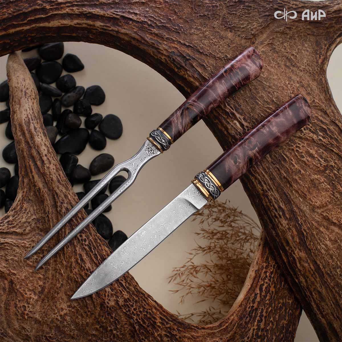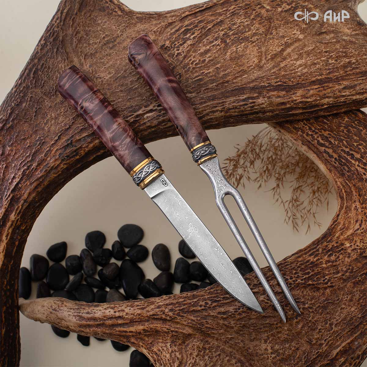 Оружейники и художники Компании «АиР», авторы современной версии хиршфангера, создали изделие в духе европейских традиций, с применением техники златоустовской гравюры на металле. Свое название – «Великаны леса» охотничий гарнитур получил по двум причинам: 1) на щитке хиршфангера изображен гордый лось в ореоле из орнамента – как главный трофей лесной охоты, 2) металлические детали ножен хиршфангера и Финского ножа украшены природными пейзажами с лосями.