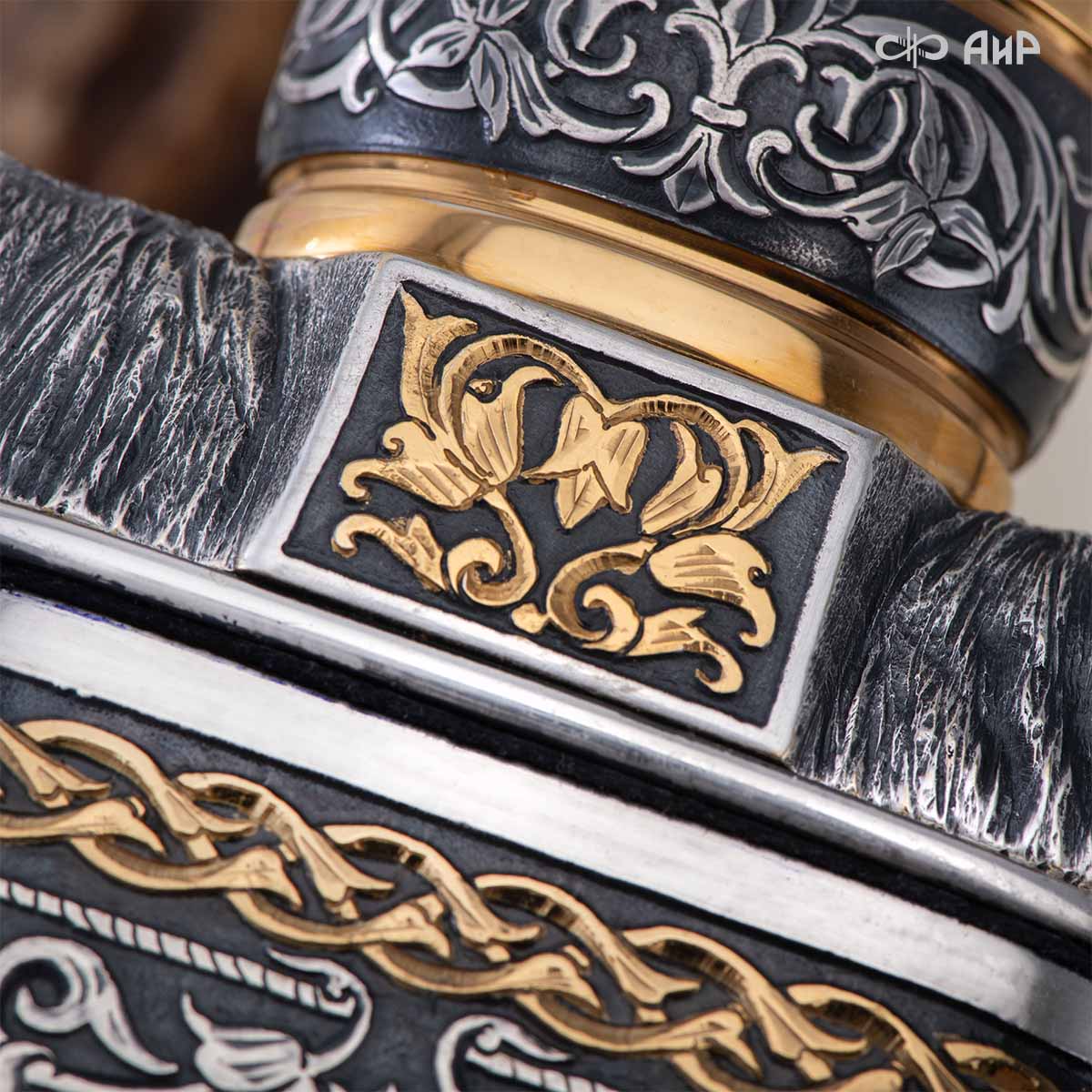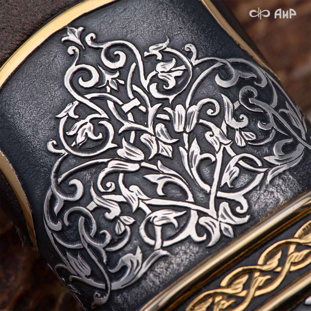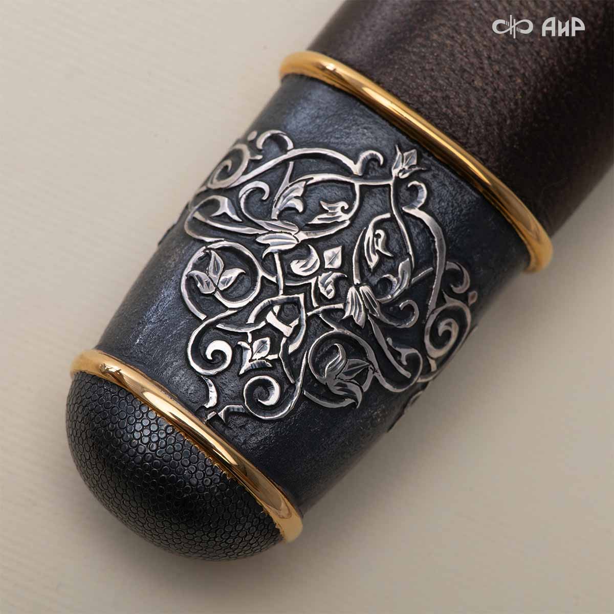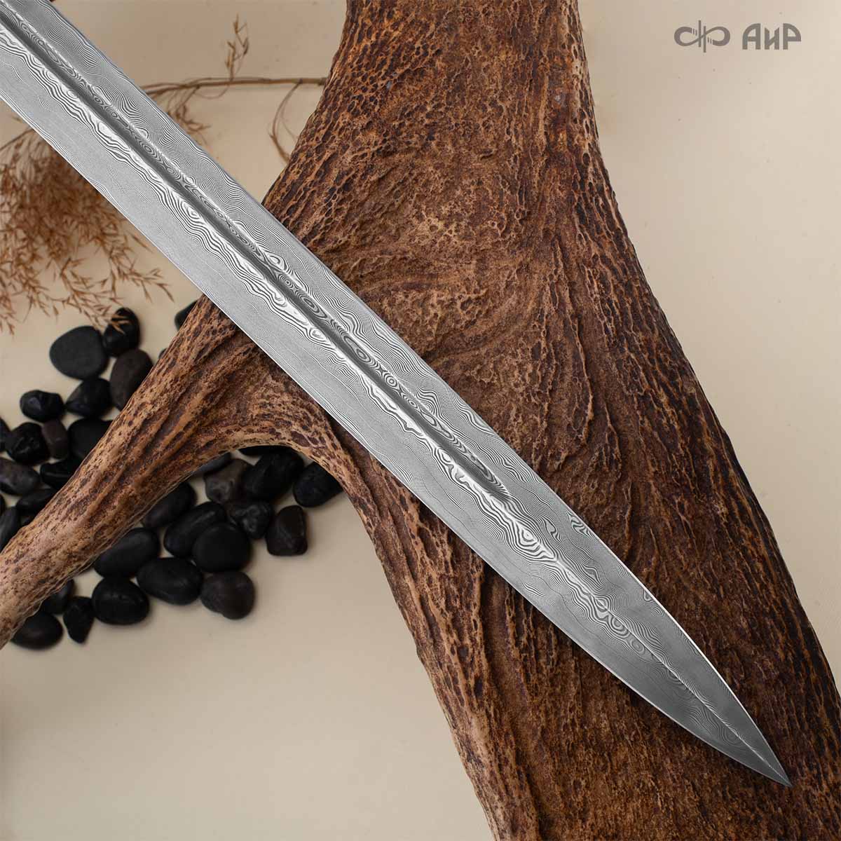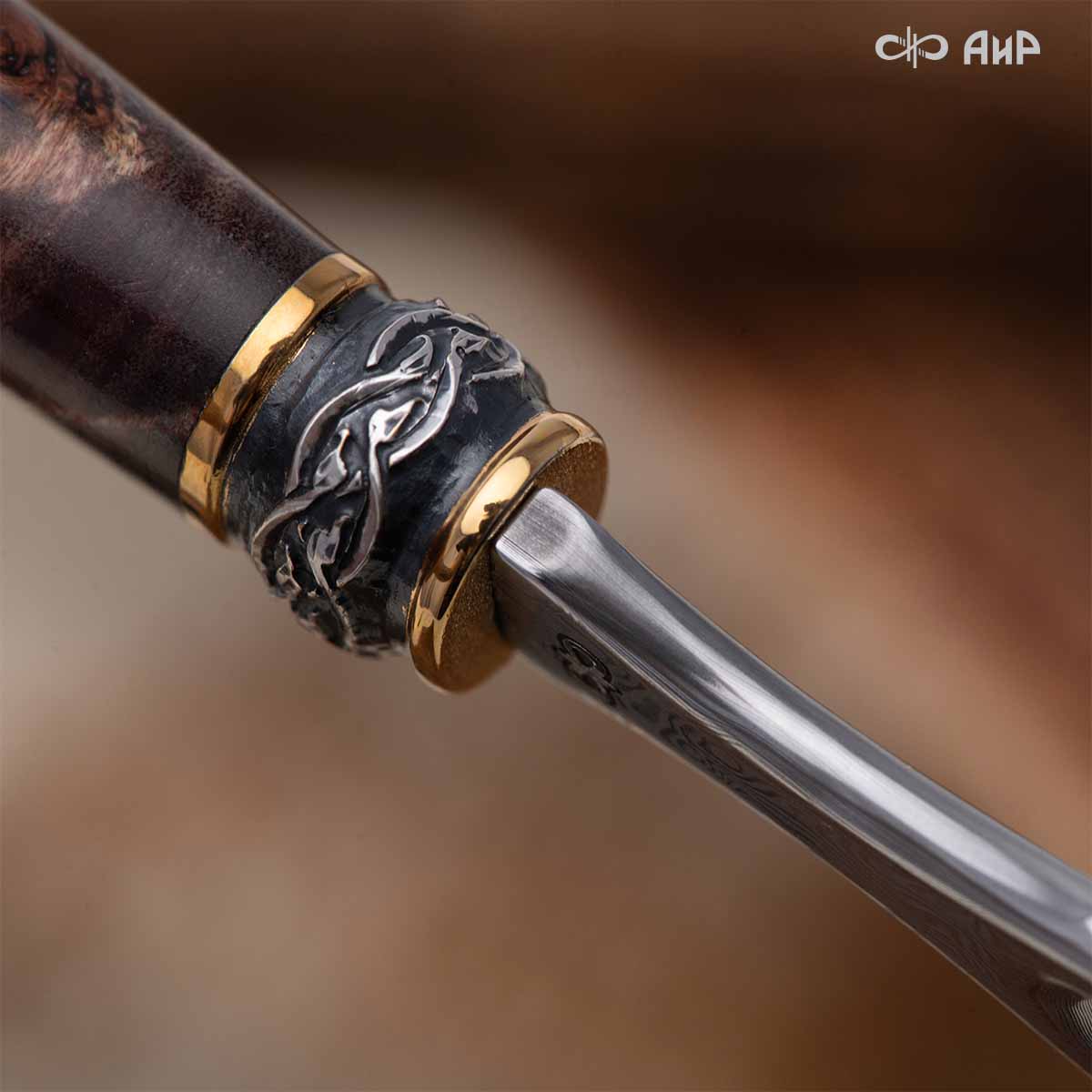 Оружейники и художники Компании «АиР», авторы современной версии хиршфангера, создали изделие в духе европейских традиций, с применением техники златоустовской гравюры на металле. Свое название – «Великаны леса» охотничий гарнитур получил по двум причинам: 1) на щитке хиршфангера изображен гордый лось в ореоле из орнамента – как главный трофей лесной охоты, 2) металлические детали ножен хиршфангера и Финского ножа украшены природными пейзажами с лосями.