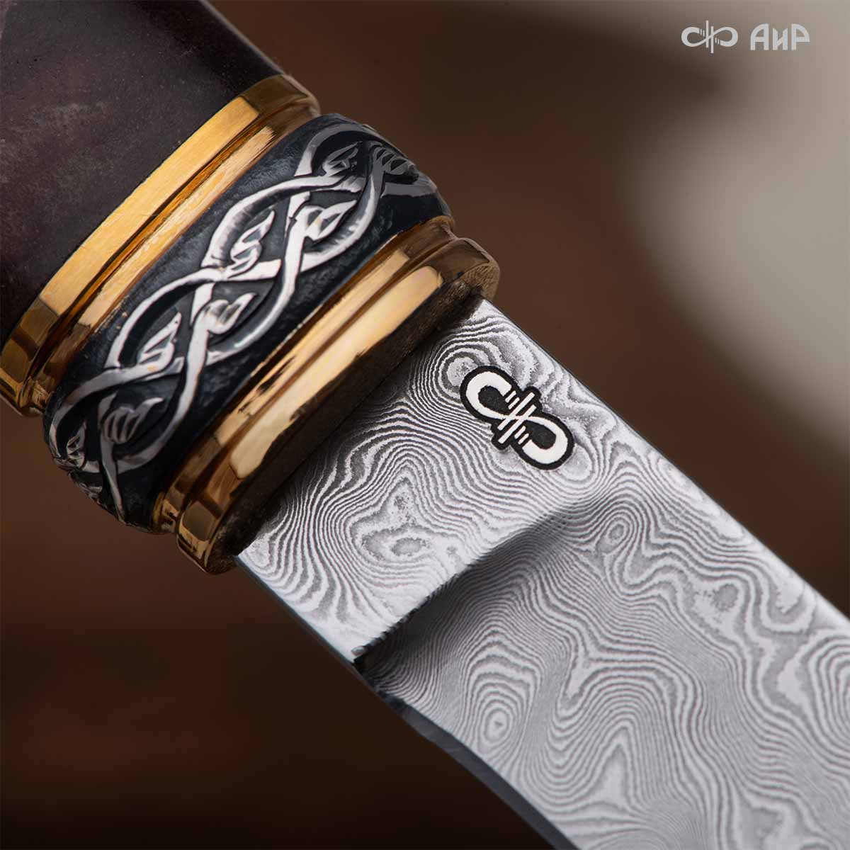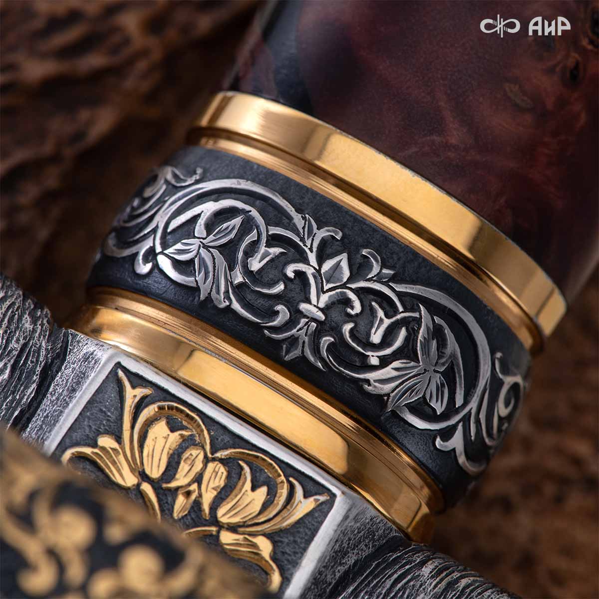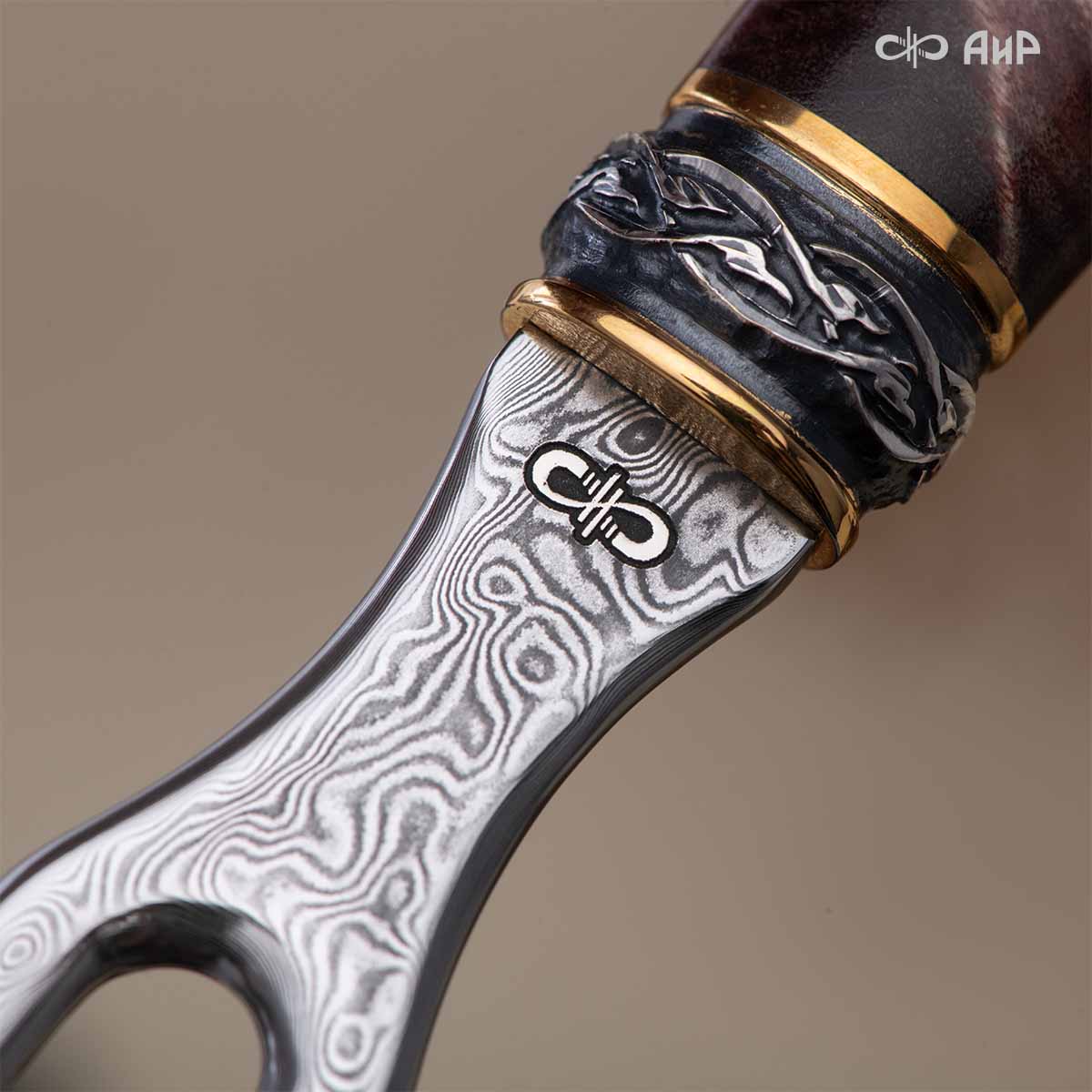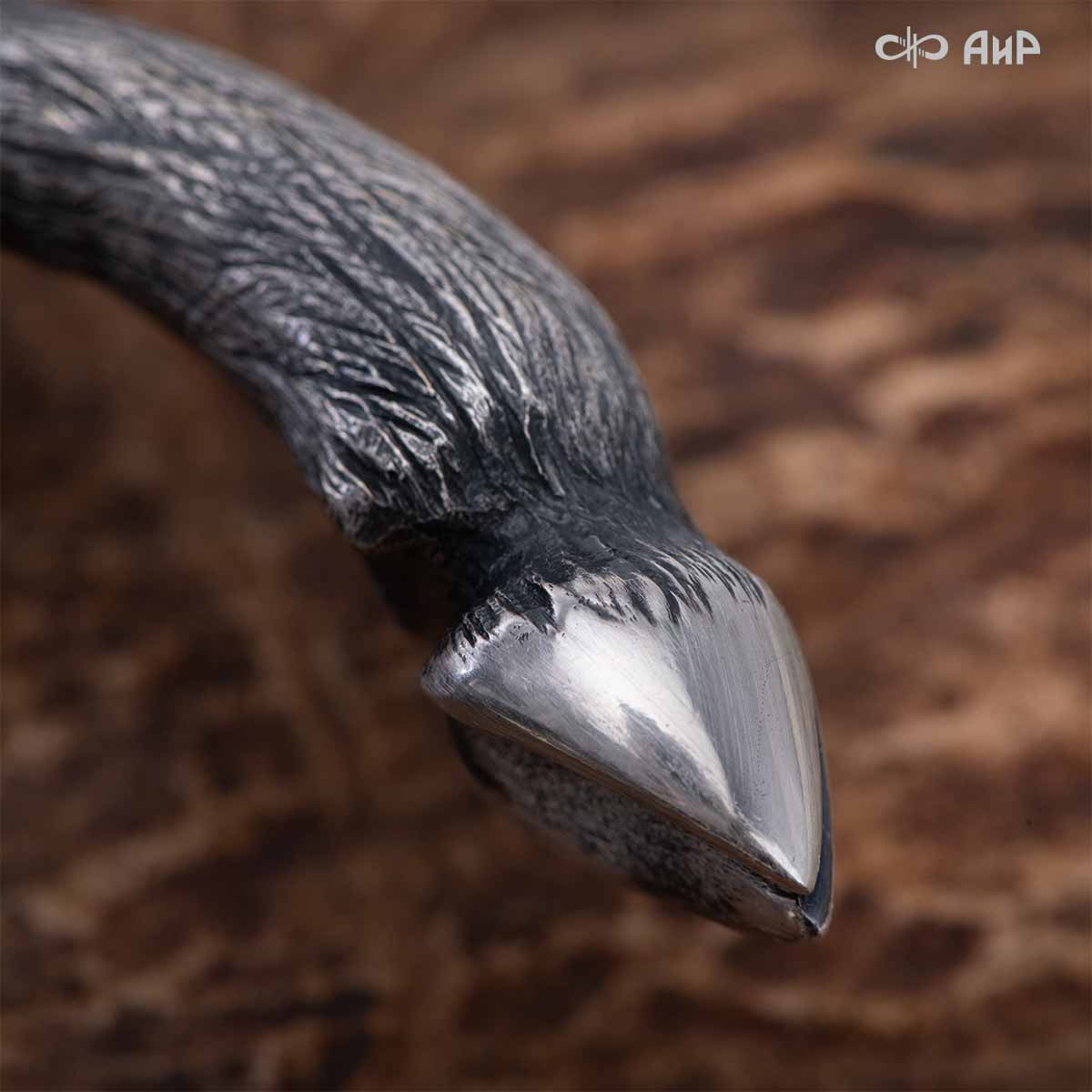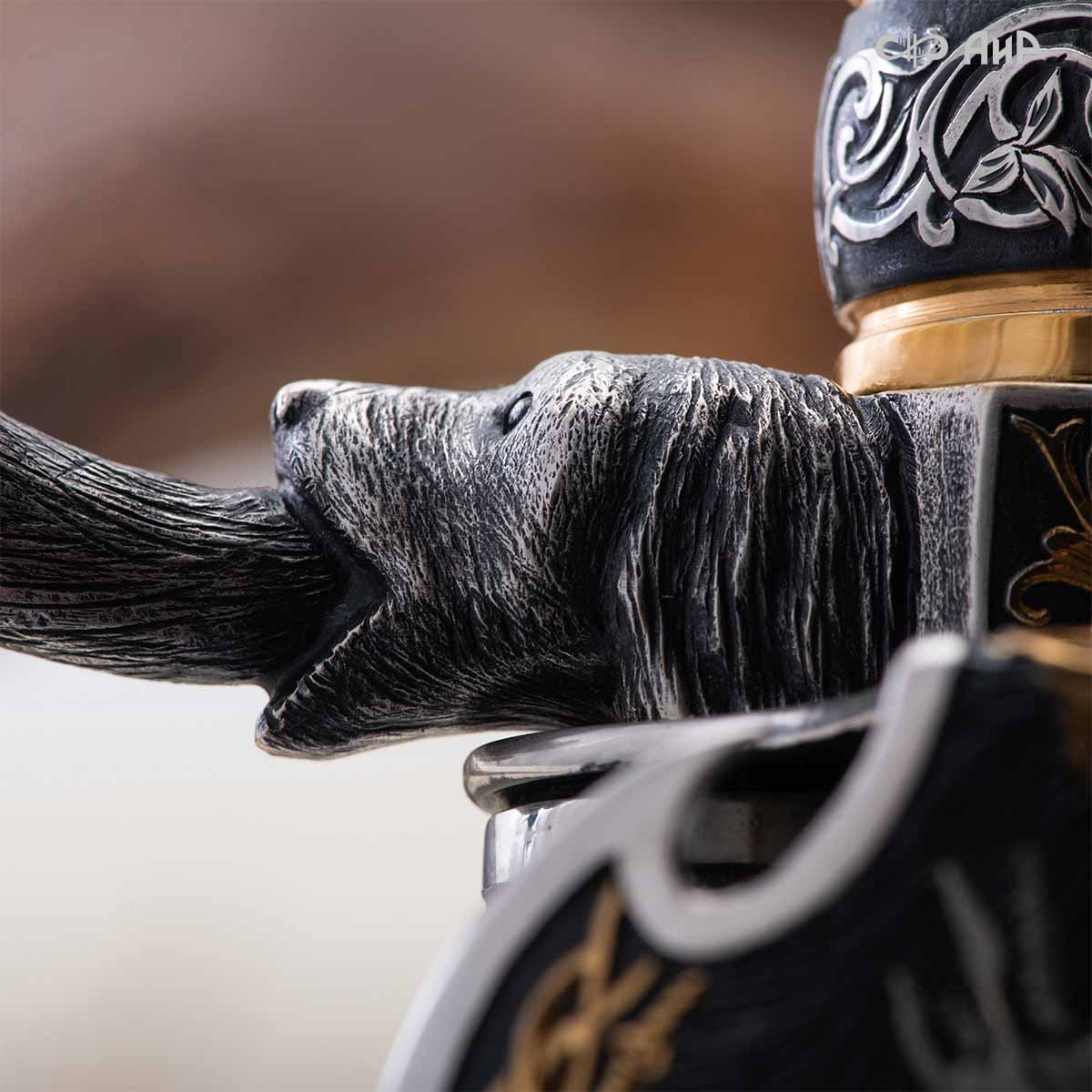 Оружейники и художники Компании «АиР», авторы современной версии хиршфангера, создали изделие в духе европейских традиций, с применением техники златоустовской гравюры на металле. Свое название – «Великаны леса» охотничий гарнитур получил по двум причинам: 1) на щитке хиршфангера изображен гордый лось в ореоле из орнамента – как главный трофей лесной охоты, 2) металлические детали ножен хиршфангера и Финского ножа украшены природными пейзажами с лосями.