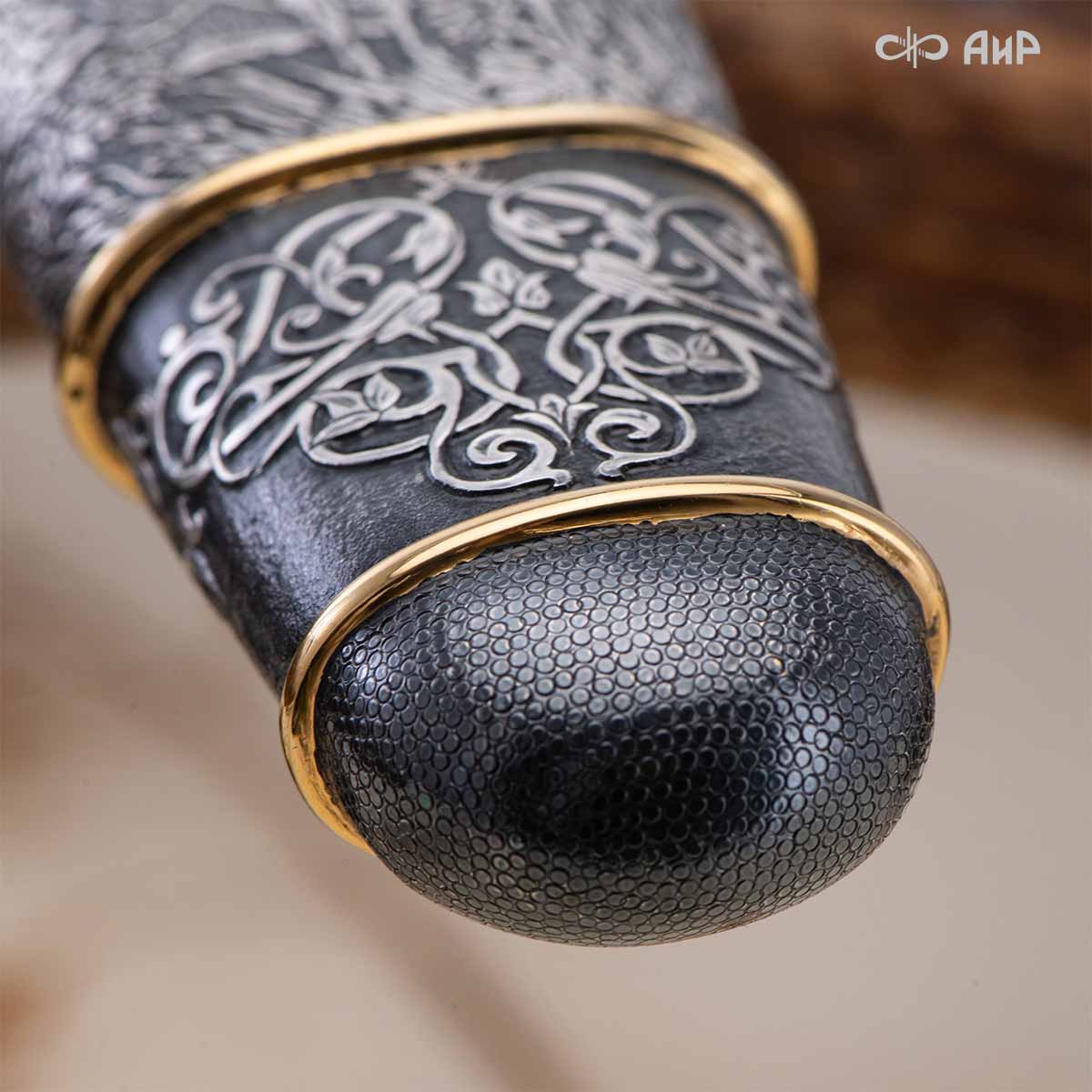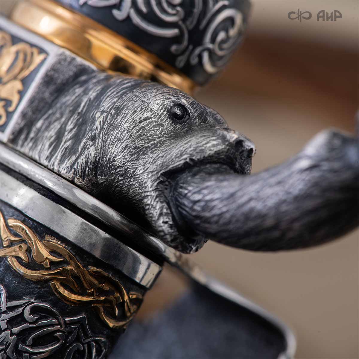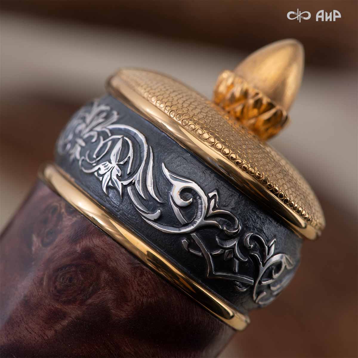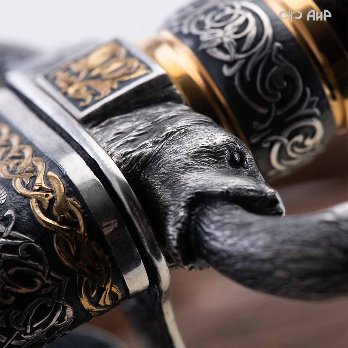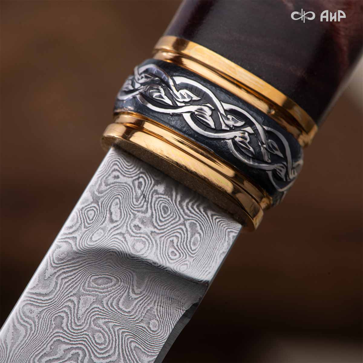 Оружейники и художники Компании «АиР», авторы современной версии хиршфангера, создали изделие в духе европейских традиций, с применением техники златоустовской гравюры на металле. Свое название – «Великаны леса» охотничий гарнитур получил по двум причинам: 1) на щитке хиршфангера изображен гордый лось в ореоле из орнамента – как главный трофей лесной охоты, 2) металлические детали ножен хиршфангера и Финского ножа украшены природными пейзажами с лосями.