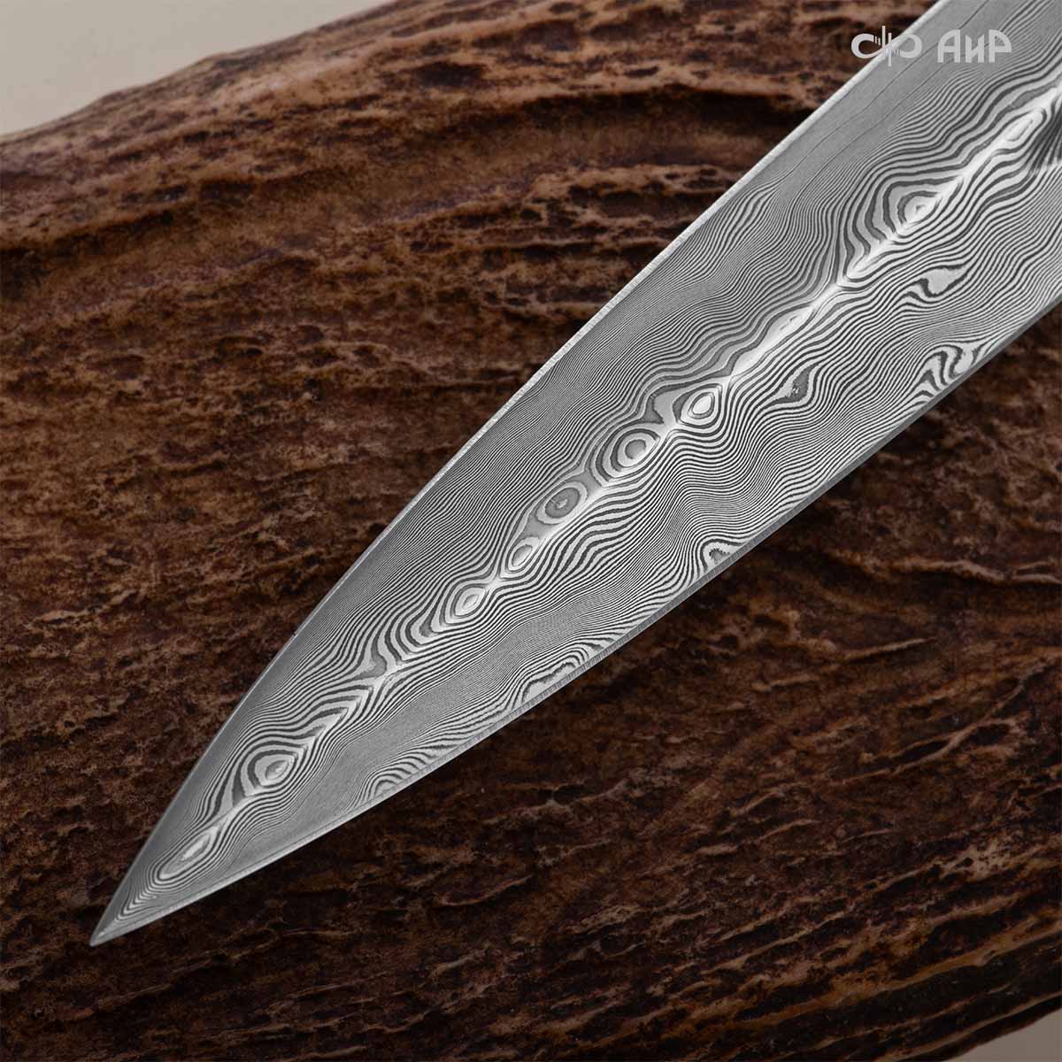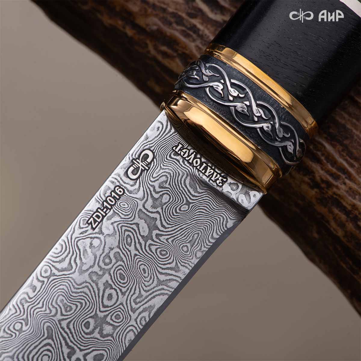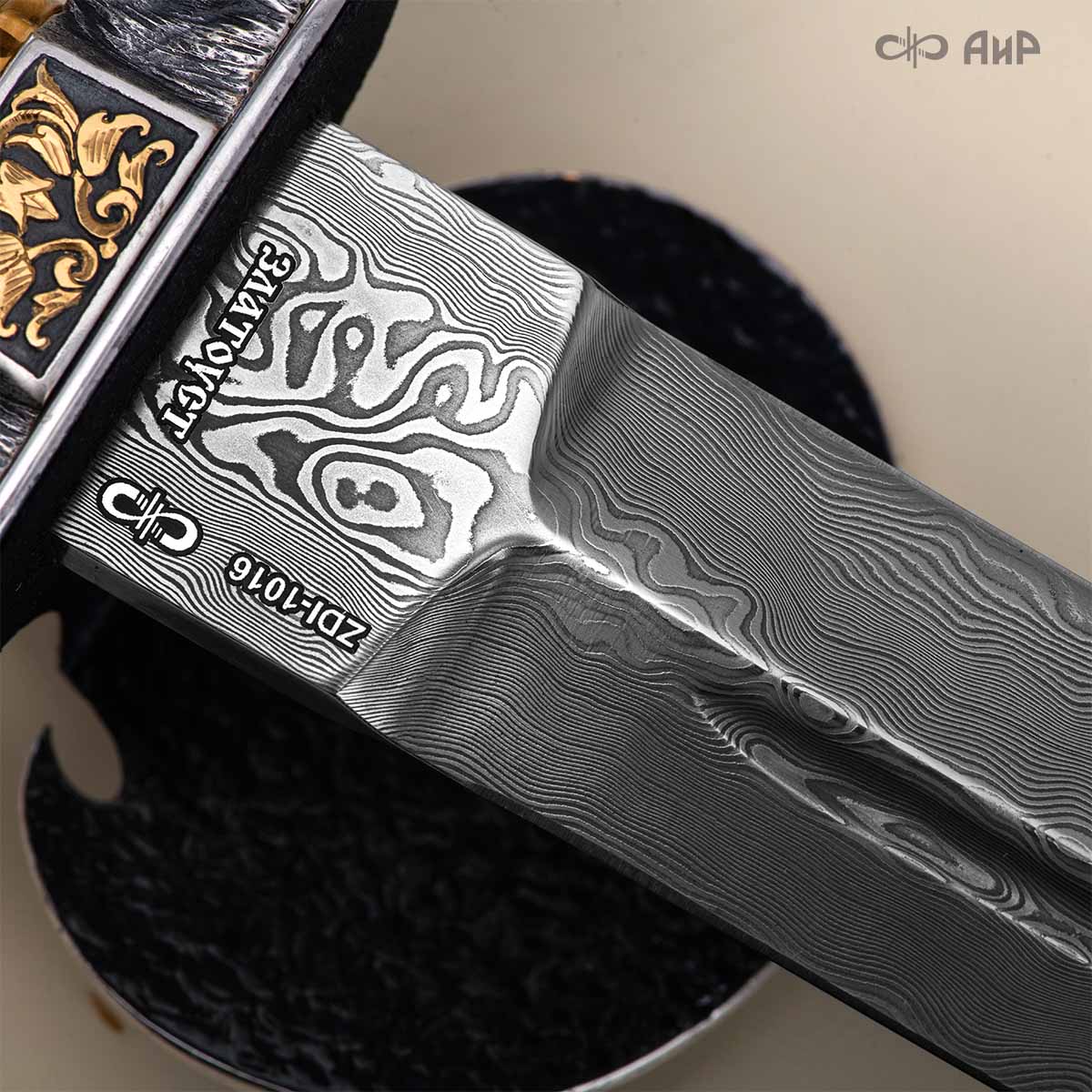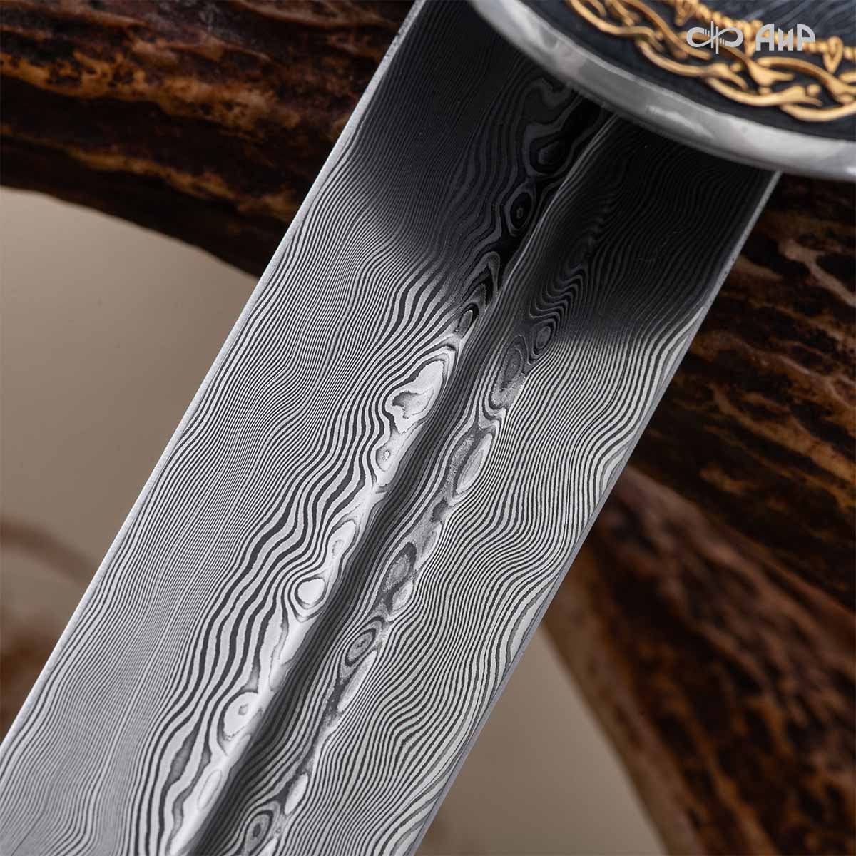 Клинок кинжала «Хиршфангер» изготовлен из атмосферостойкого дамаска ZLADINOX ZDI-1016, узор «дикий». Клинок прямой, однолезвийный, с одним широким долом с обеих сторон, боевой конец двулезвийный. Рукоять изготовлена из стабилизированного капа темно-багрового цвета. Окончания крестовины загнуты в противоположные стороны и выполнены в виде ножек оленя. Под крестовиной располагается декоративный щитик в виде раковины, декорированной в стиле златоустовской гравюры на металле. Отличительная черта охотничьего кинжала ‒ ножны, в которых сделан дополнительный карман для хранения вкладного малого ножа и вилки с клинком из атмосферостойкой дамасской стали ZLADINOX ZDI-1016, узор «дикий». Малый нож и вилка традиционно использовались для разделки дичи или для бытовых нужд герцогов и монархов. Также в гарнитур входит нож «Финский» с клинком из атмосферостойкой дамасской стали ZLADINOX ZDI-1016, узор «дикий» и комбинированными ножнами.