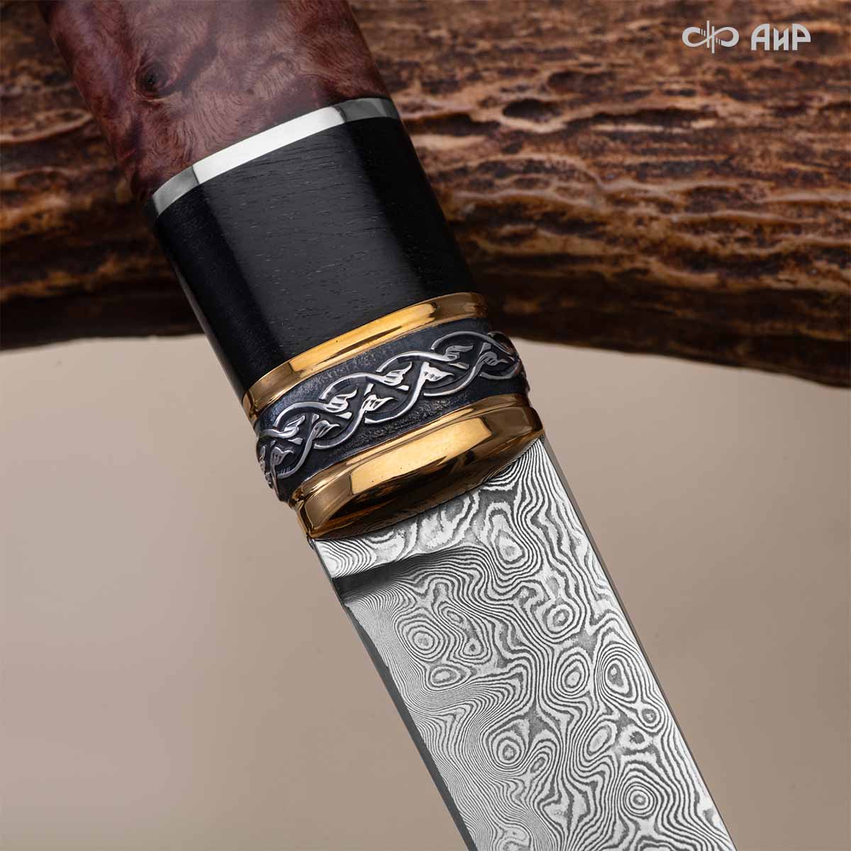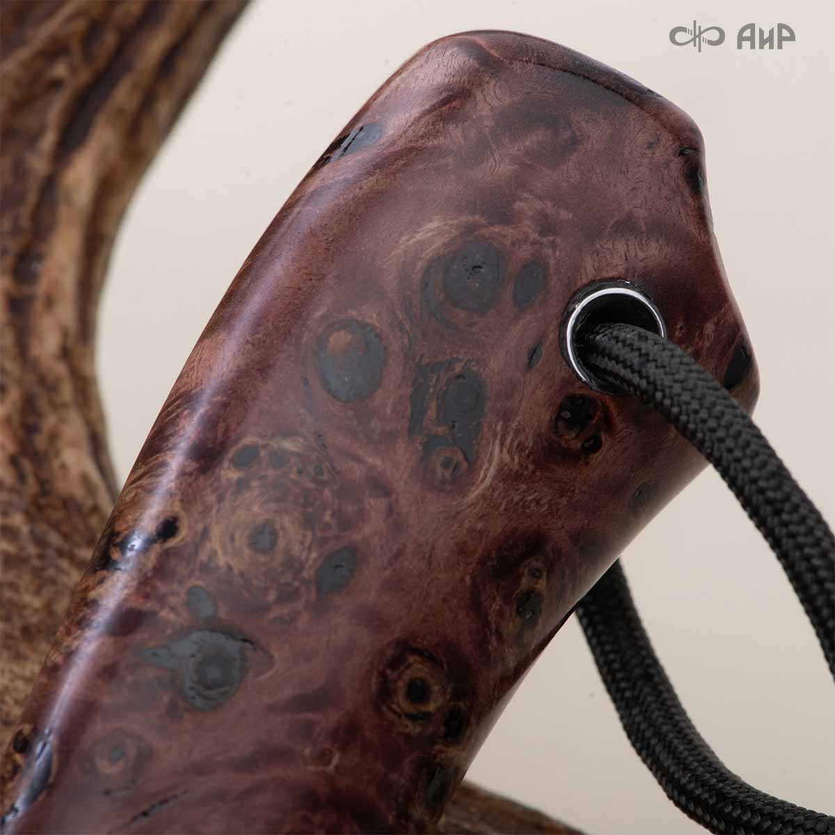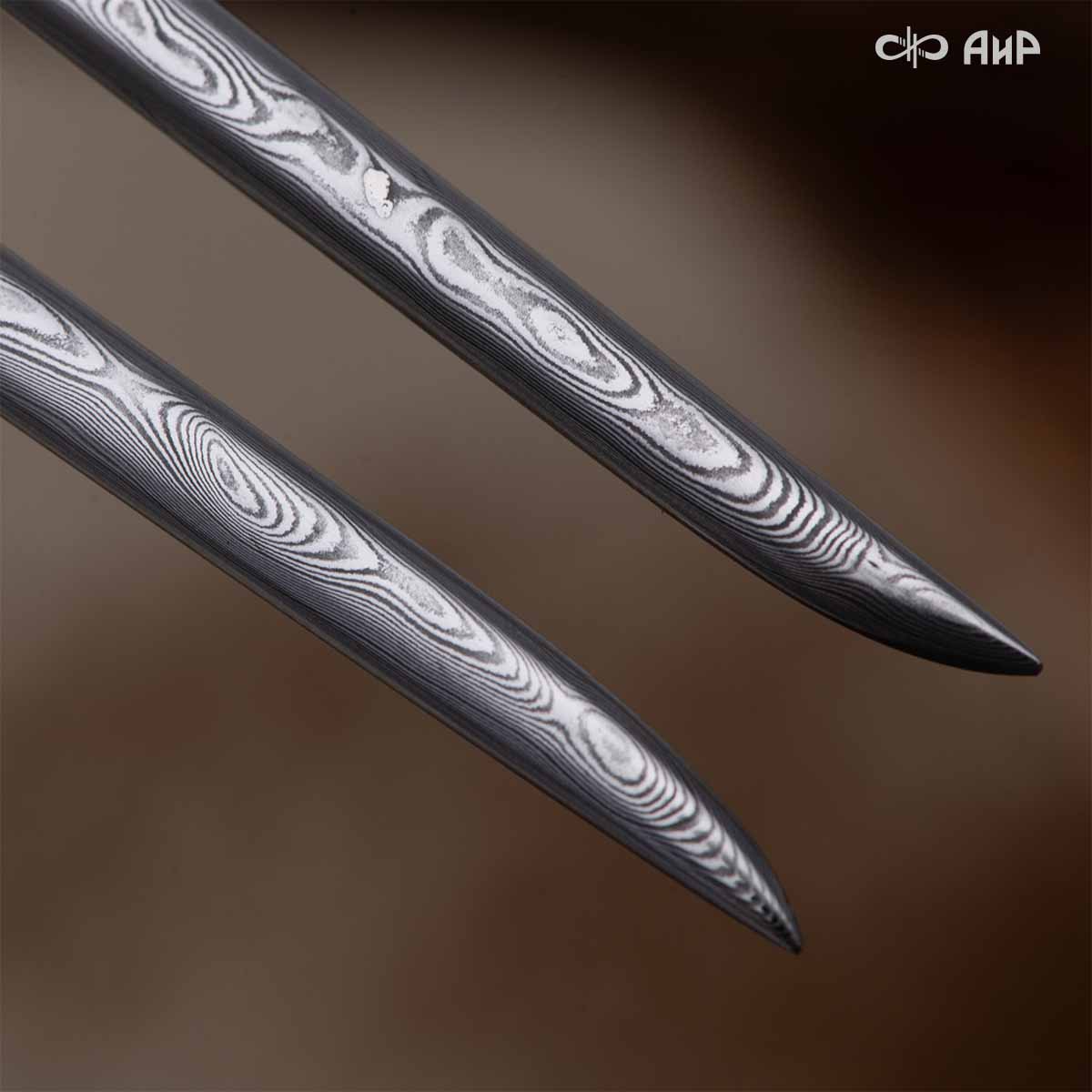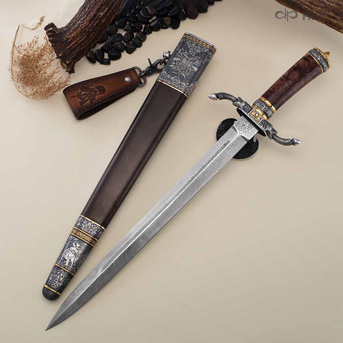 Клинок кинжала «Хиршфангер» изготовлен из атмосферостойкого дамаска ZLADINOX ZDI-1016, узор «дикий». Клинок прямой, однолезвийный, с одним широким долом с обеих сторон, боевой конец двулезвийный. Рукоять изготовлена из стабилизированного капа темно-багрового цвета. Окончания крестовины загнуты в противоположные стороны и выполнены в виде ножек оленя. Под крестовиной располагается декоративный щитик в виде раковины, декорированной в стиле златоустовской гравюры на металле. Отличительная черта охотничьего кинжала ‒ ножны, в которых сделан дополнительный карман для хранения вкладного малого ножа и вилки с клинком из атмосферостойкой дамасской стали ZLADINOX ZDI-1016, узор «дикий». Малый нож и вилка традиционно использовались для разделки дичи или для бытовых нужд герцогов и монархов. Также в гарнитур входит нож «Финский» с клинком из атмосферостойкой дамасской стали ZLADINOX ZDI-1016, узор «дикий» и комбинированными ножнами.
