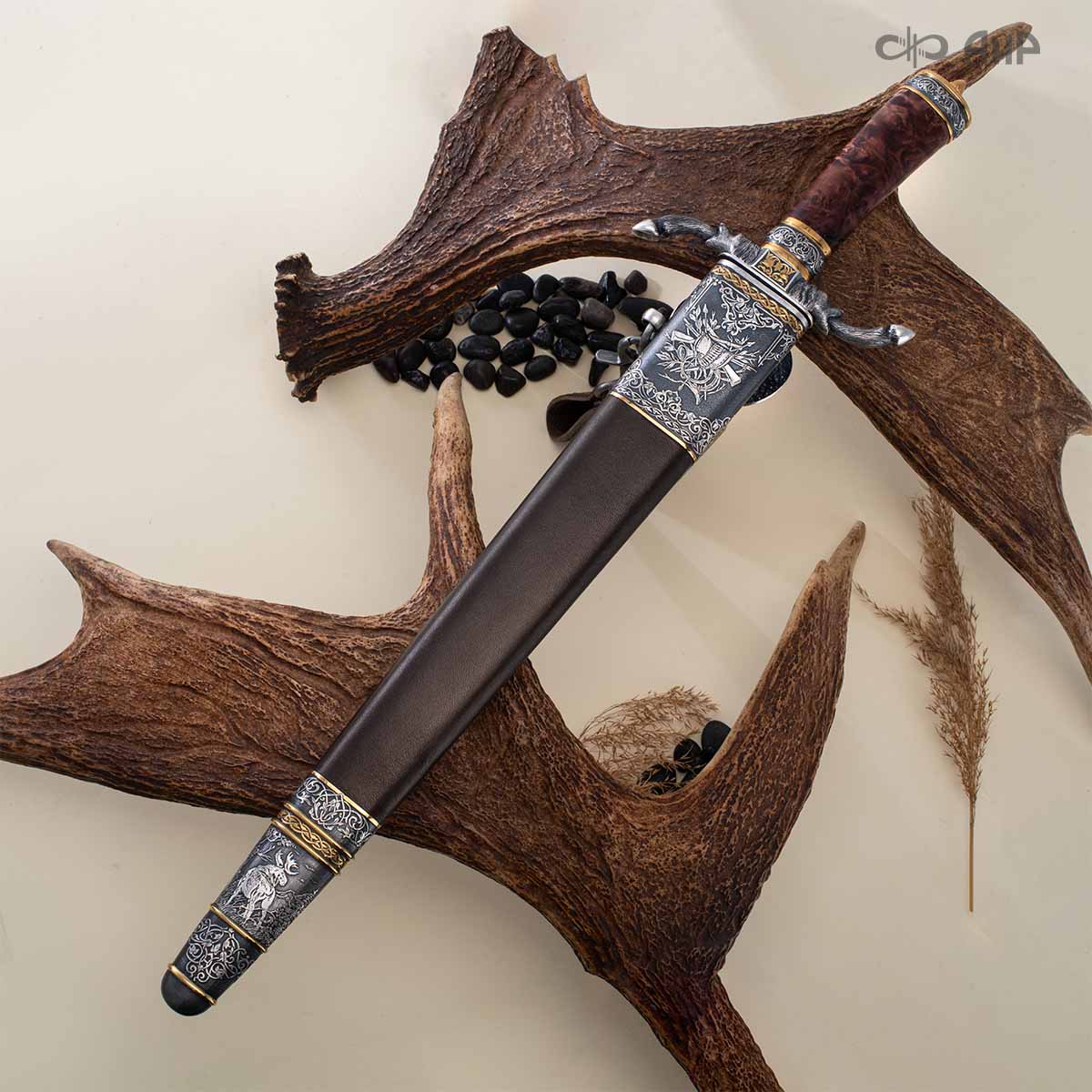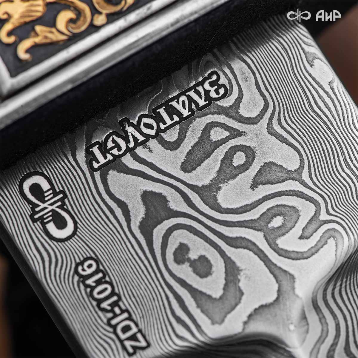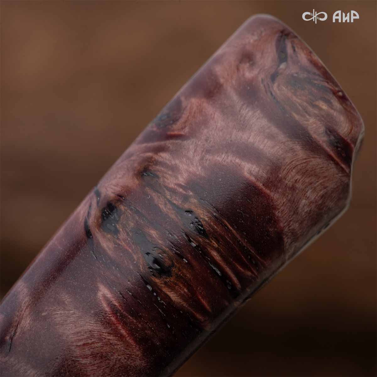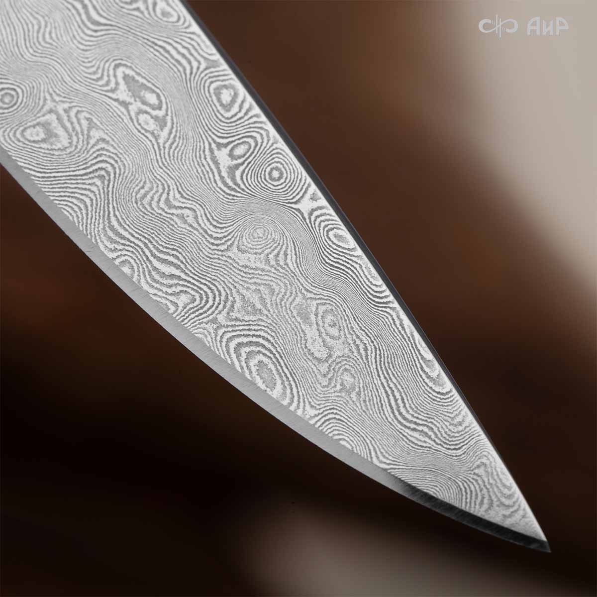 Клинок кинжала «Хиршфангер» изготовлен из атмосферостойкого дамаска ZLADINOX ZDI-1016, узор «дикий». Клинок прямой, однолезвийный, с одним широким долом с обеих сторон, боевой конец двулезвийный. Рукоять изготовлена из стабилизированного капа темно-багрового цвета. Окончания крестовины загнуты в противоположные стороны и выполнены в виде ножек оленя. Под крестовиной располагается декоративный щитик в виде раковины, декорированной в стиле златоустовской гравюры на металле. Отличительная черта охотничьего кинжала ‒ ножны, в которых сделан дополнительный карман для хранения вкладного малого ножа и вилки с клинком из атмосферостойкой дамасской стали ZLADINOX ZDI-1016, узор «дикий». Малый нож и вилка традиционно использовались для разделки дичи или для бытовых нужд герцогов и монархов. Также в гарнитур входит нож «Финский» с клинком из атмосферостойкой дамасской стали ZLADINOX ZDI-1016, узор «дикий» и комбинированными ножнами.