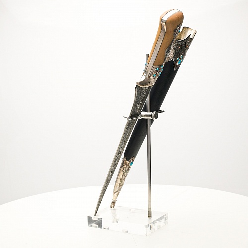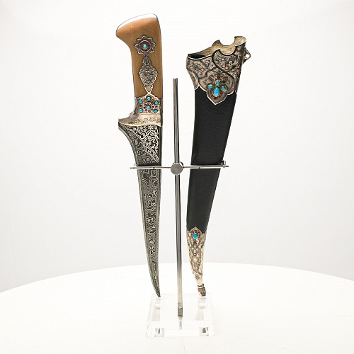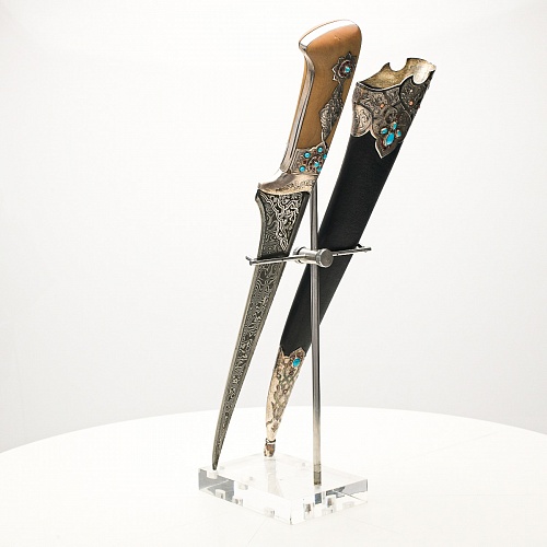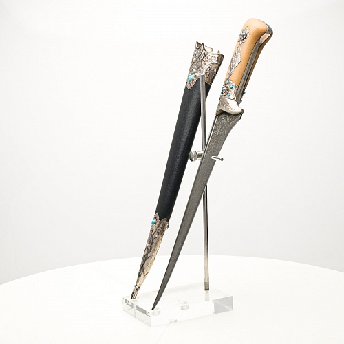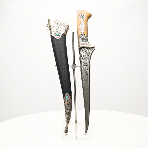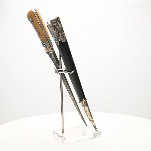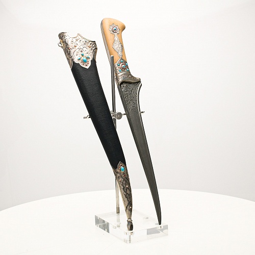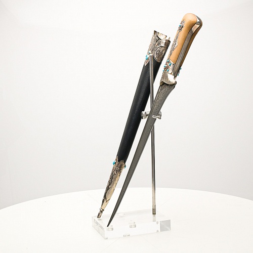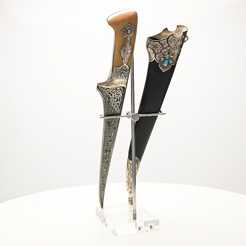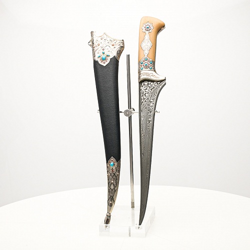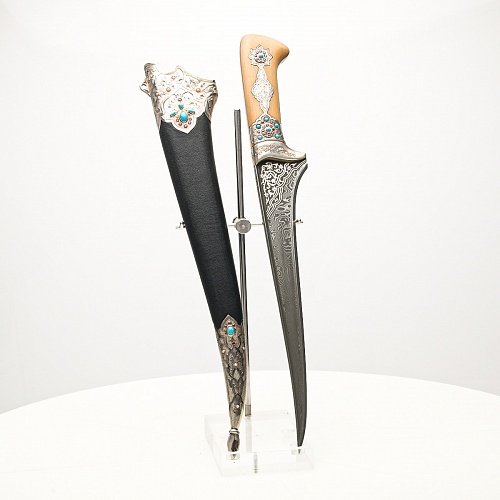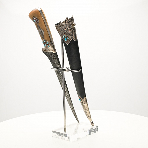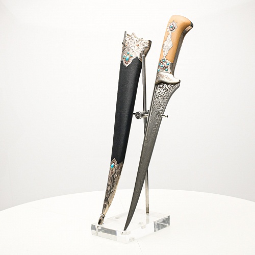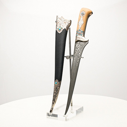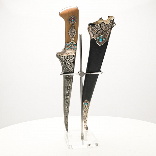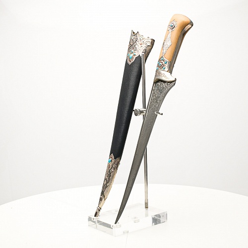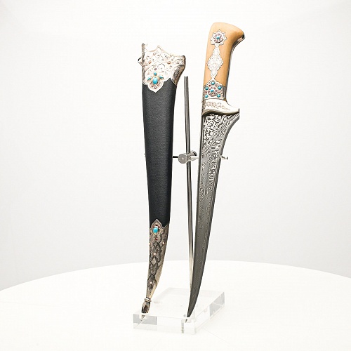 В качестве украшения ножен и рукояти использовались бирюза и кораллы, гранаты и серебро. Драгоценные камни прекрасно сочетаются со светлым деревом и узорчатой сталью.