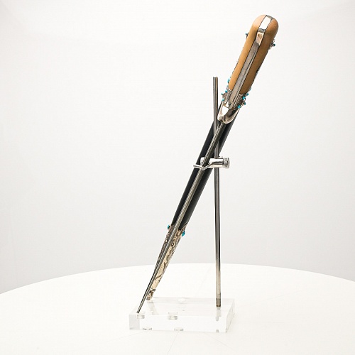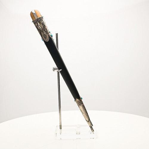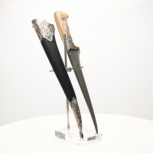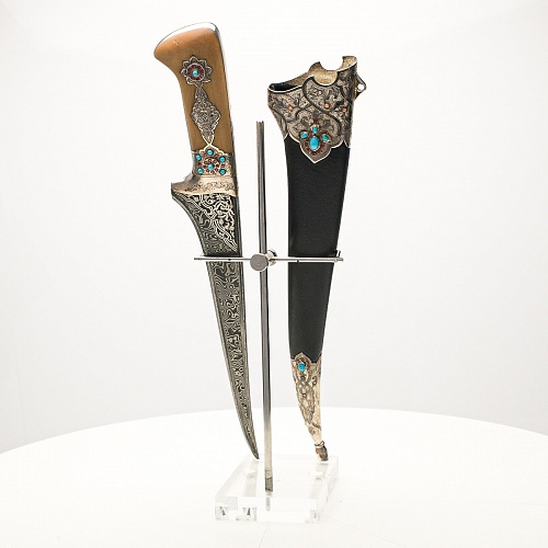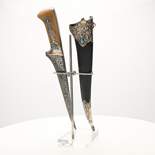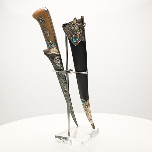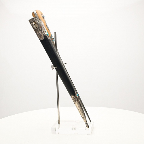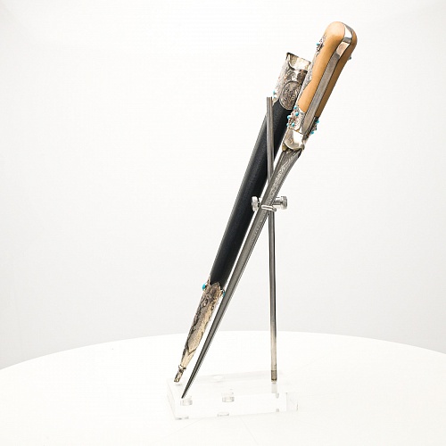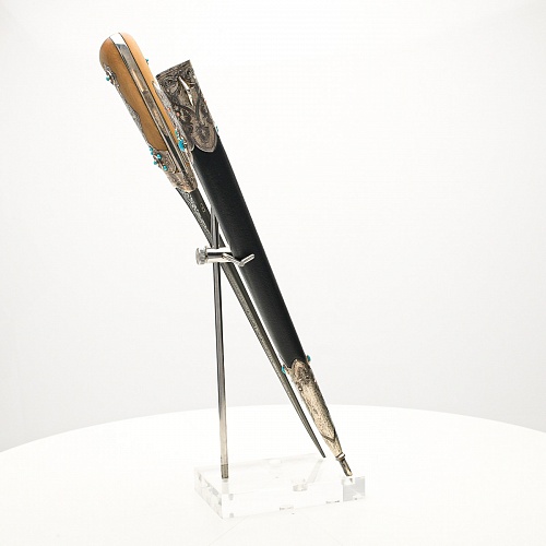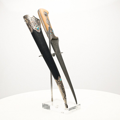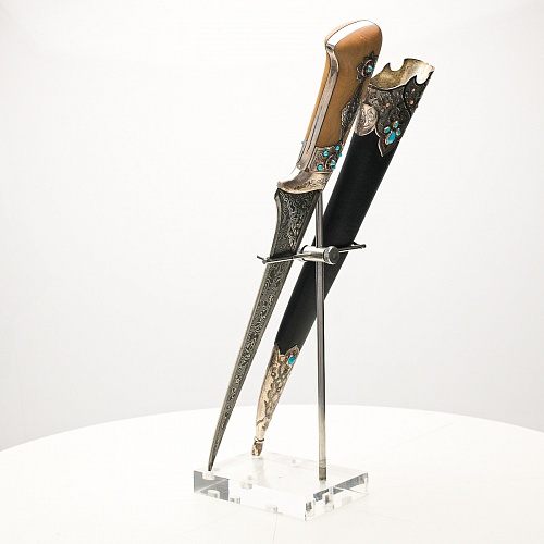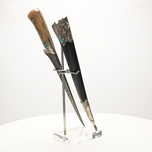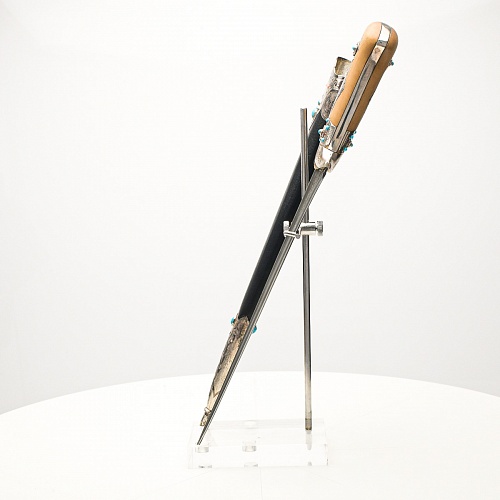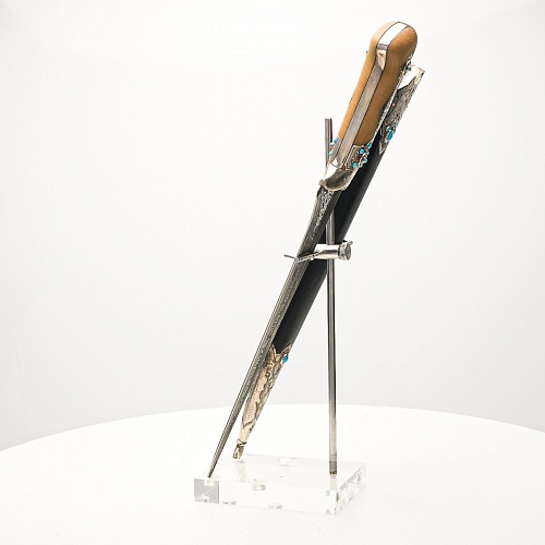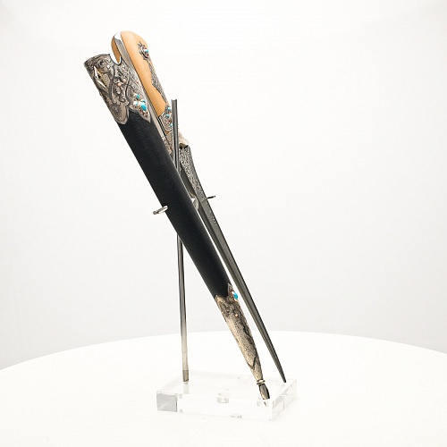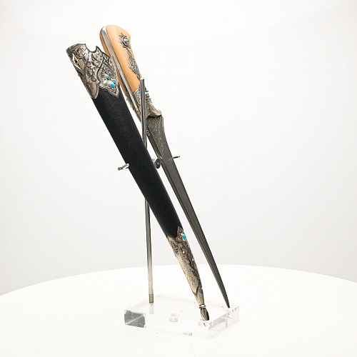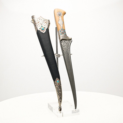 В качестве украшения ножен и рукояти использовались бирюза и кораллы, гранаты и серебро. Драгоценные камни прекрасно сочетаются со светлым деревом и узорчатой сталью.