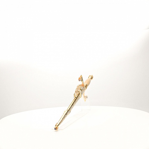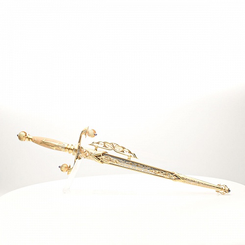 Ножны декорированы обтекающими стильными орнаментами, а привычные кольца для крепления заменены просечной накладкой. Перламутровый натуральный жемчуг в трех цветах очень органично украшает всю композицию.