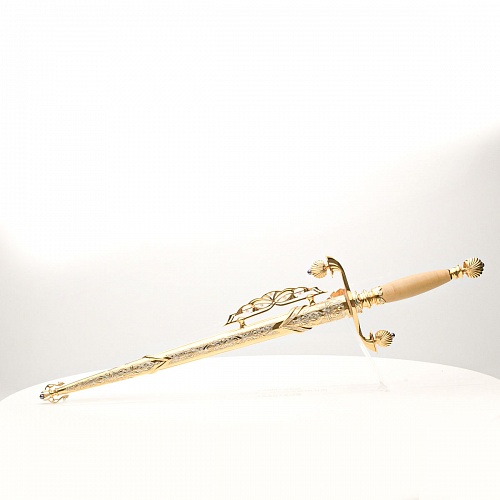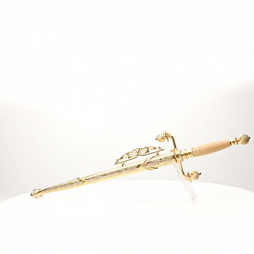 Рукоятка кортика изготовлена из самшита, на него наложены украшения в виде чаек и парусов. Пластичные по форме навершие и гарда украшены потрясающими элементами в виде полуоткрытых створок жемчужных раковин. Кортик выглядит оригинальным за счет того, даже в собранном виде, его клинок все же виден сквозь просечные ножны.
