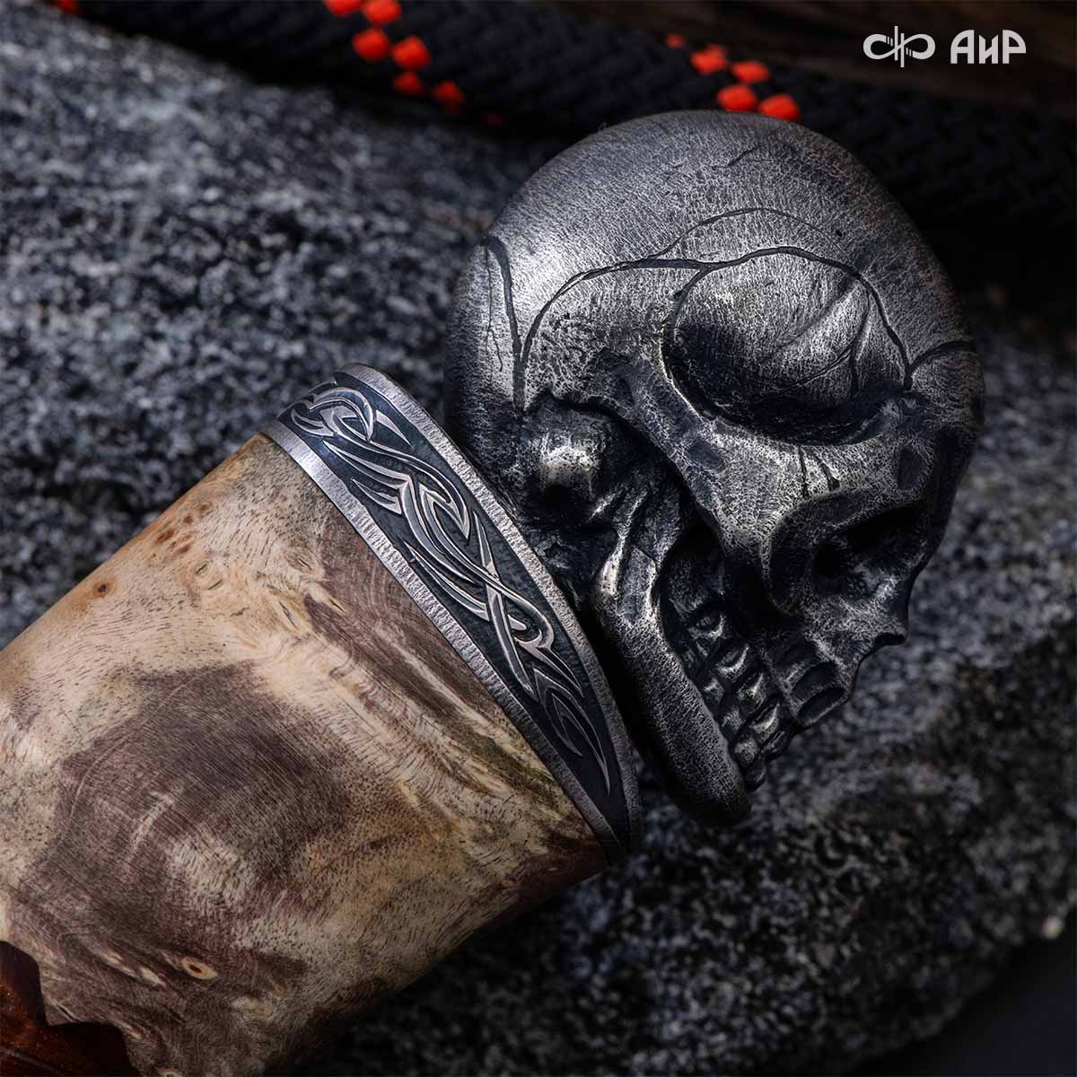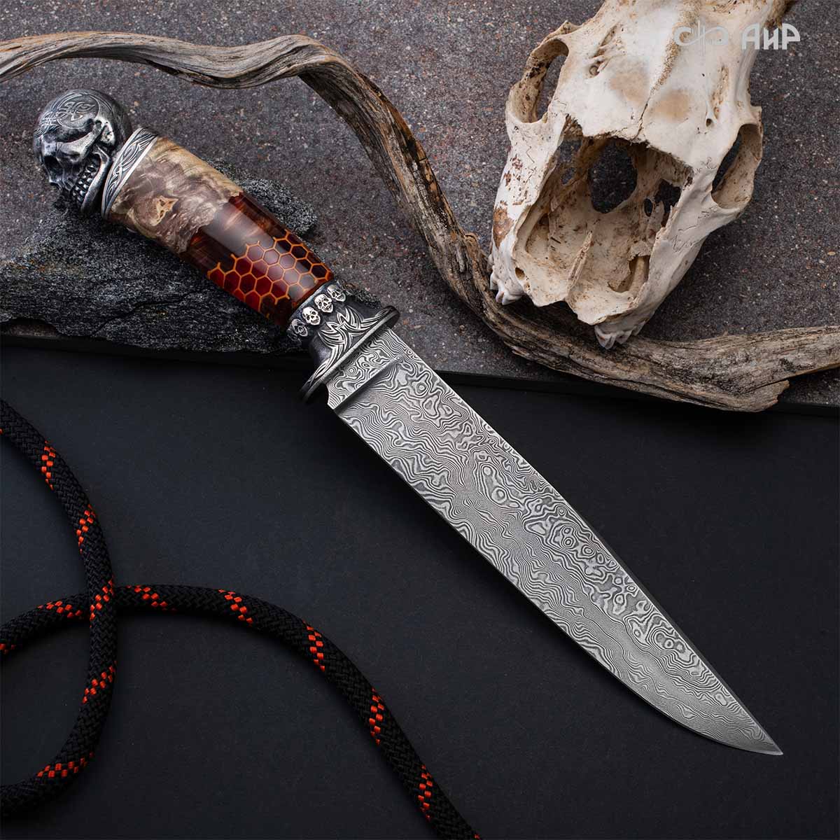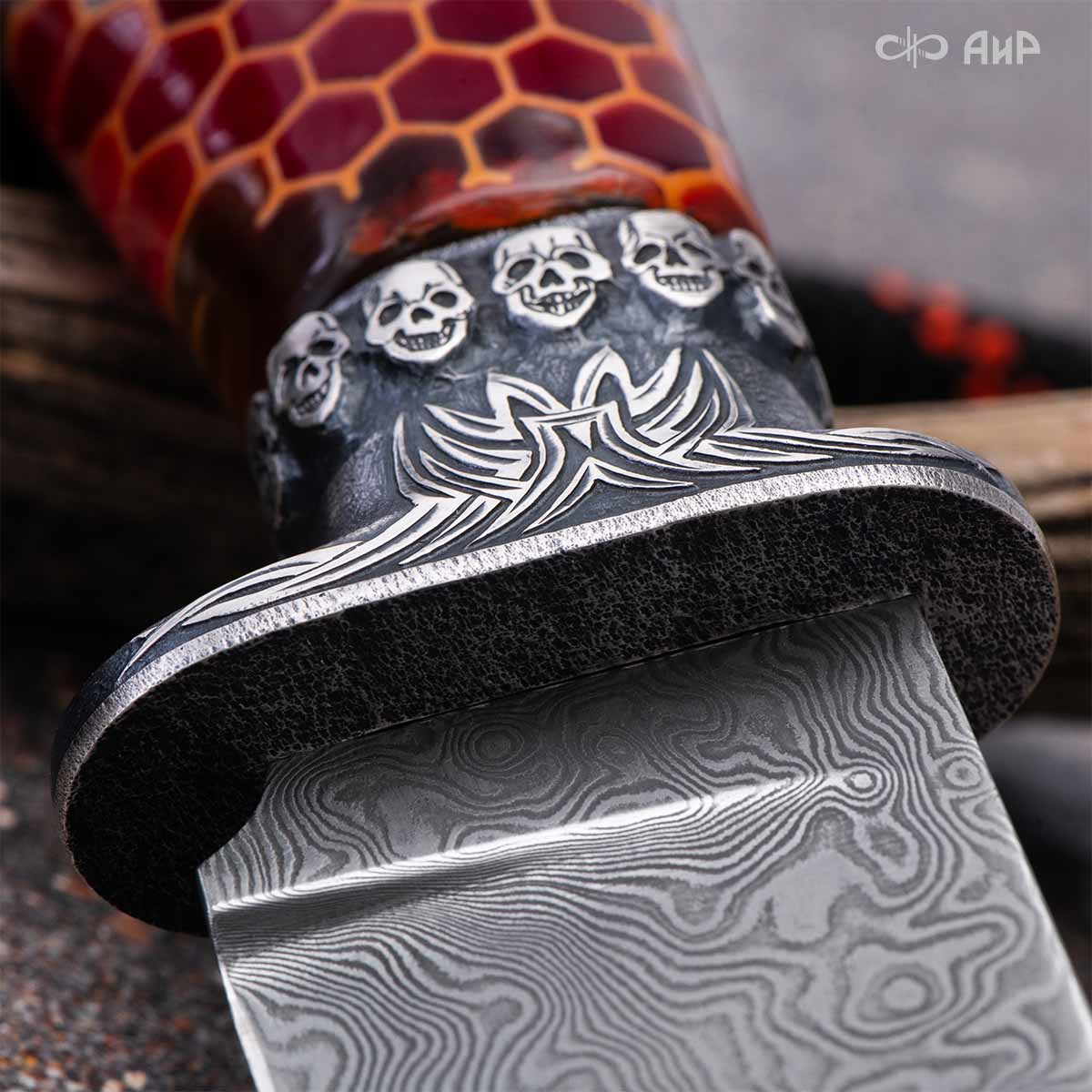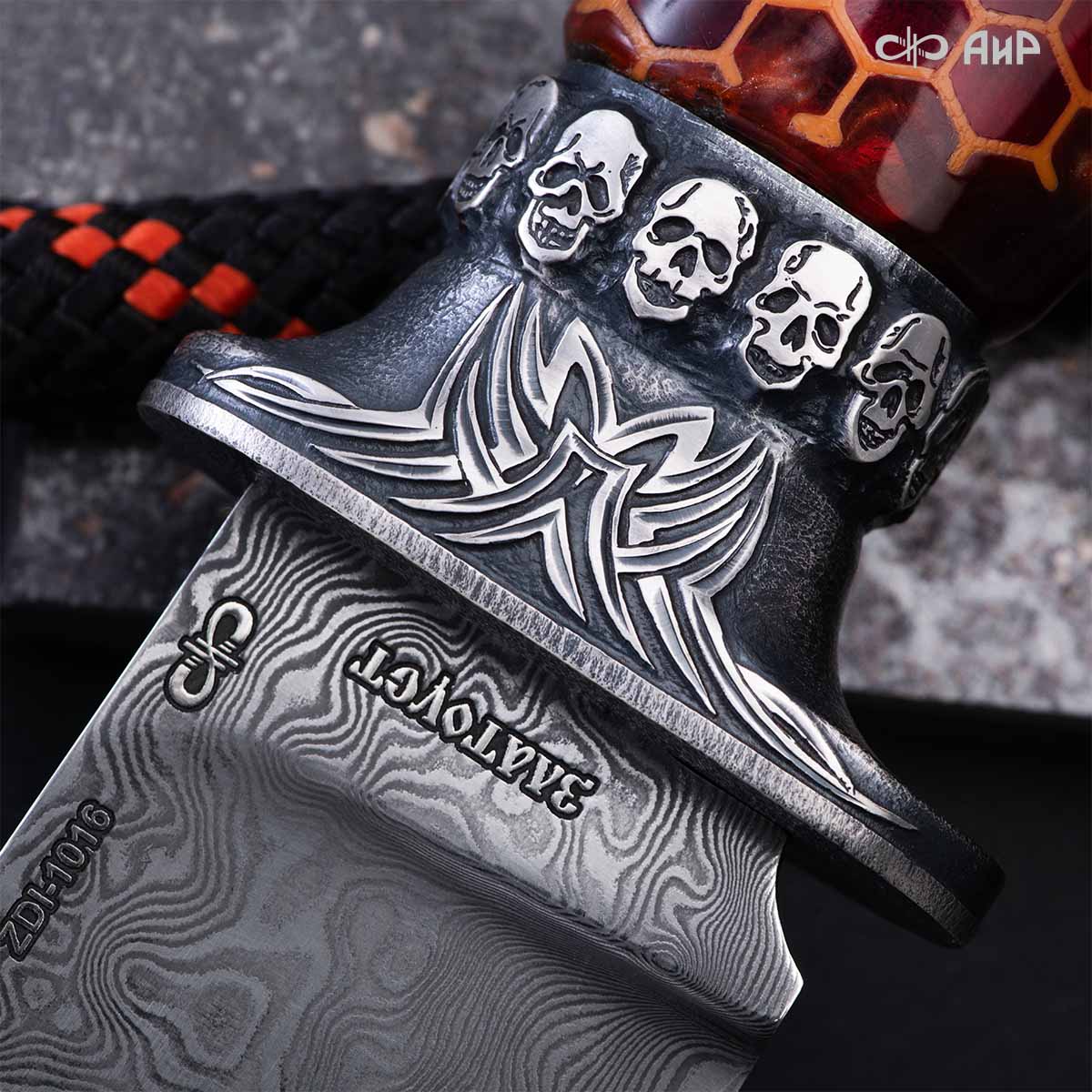 Авторский нож с брутальным клинком из дамасской стали ZLADINOX ZDI-1016, рукоятью из композита с сотами и харизматичным навершием наверняка высоко оценят люди, понимающие истинную символику "мертвой головы". Кастомная заточка.