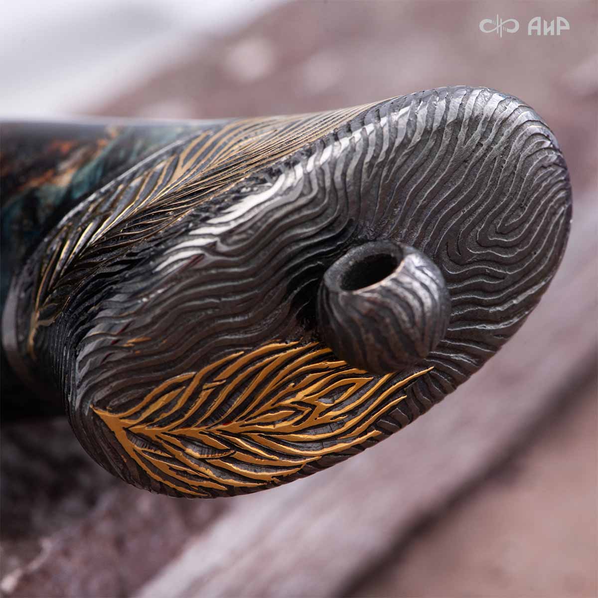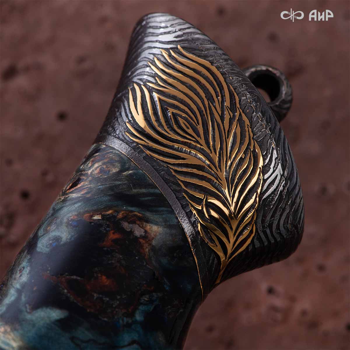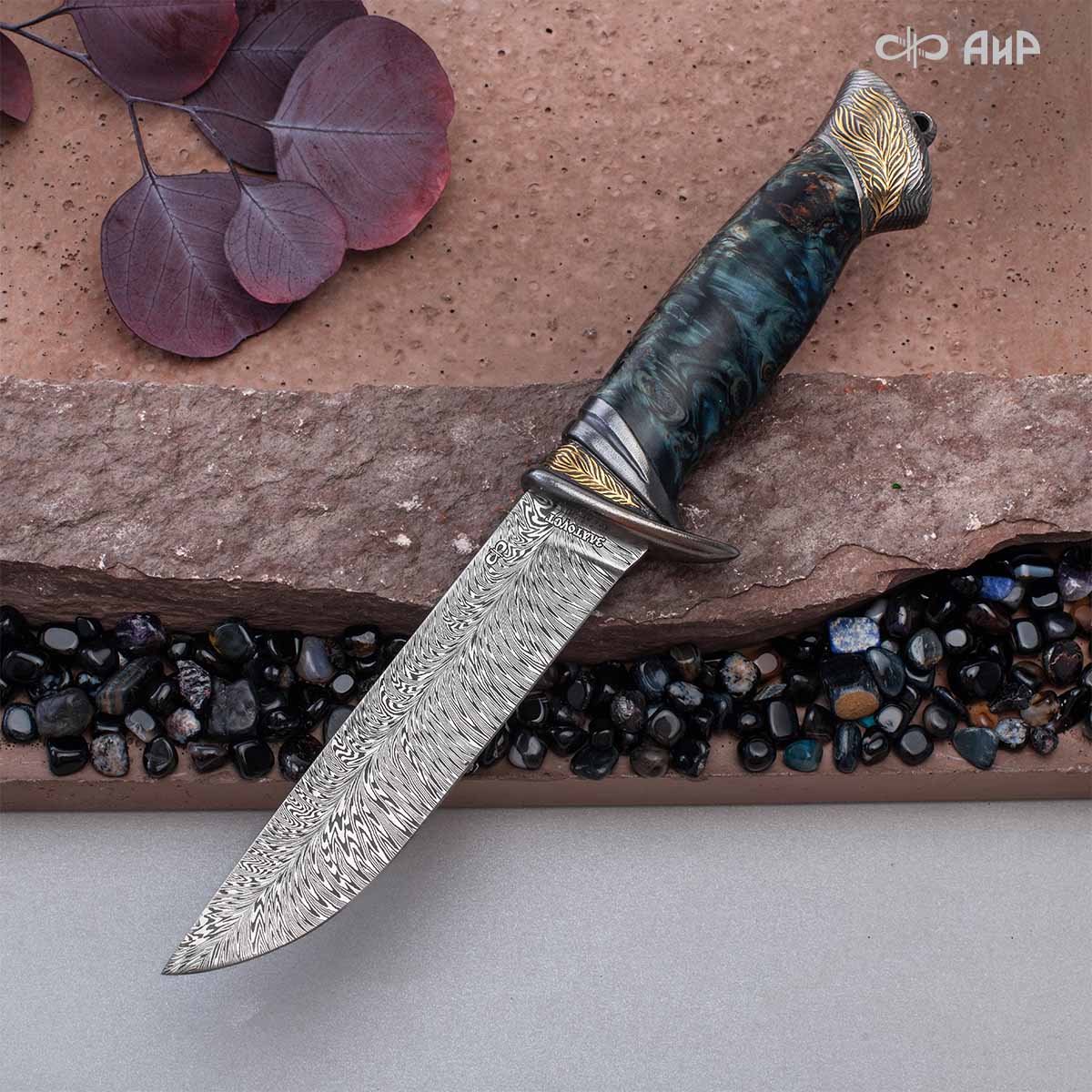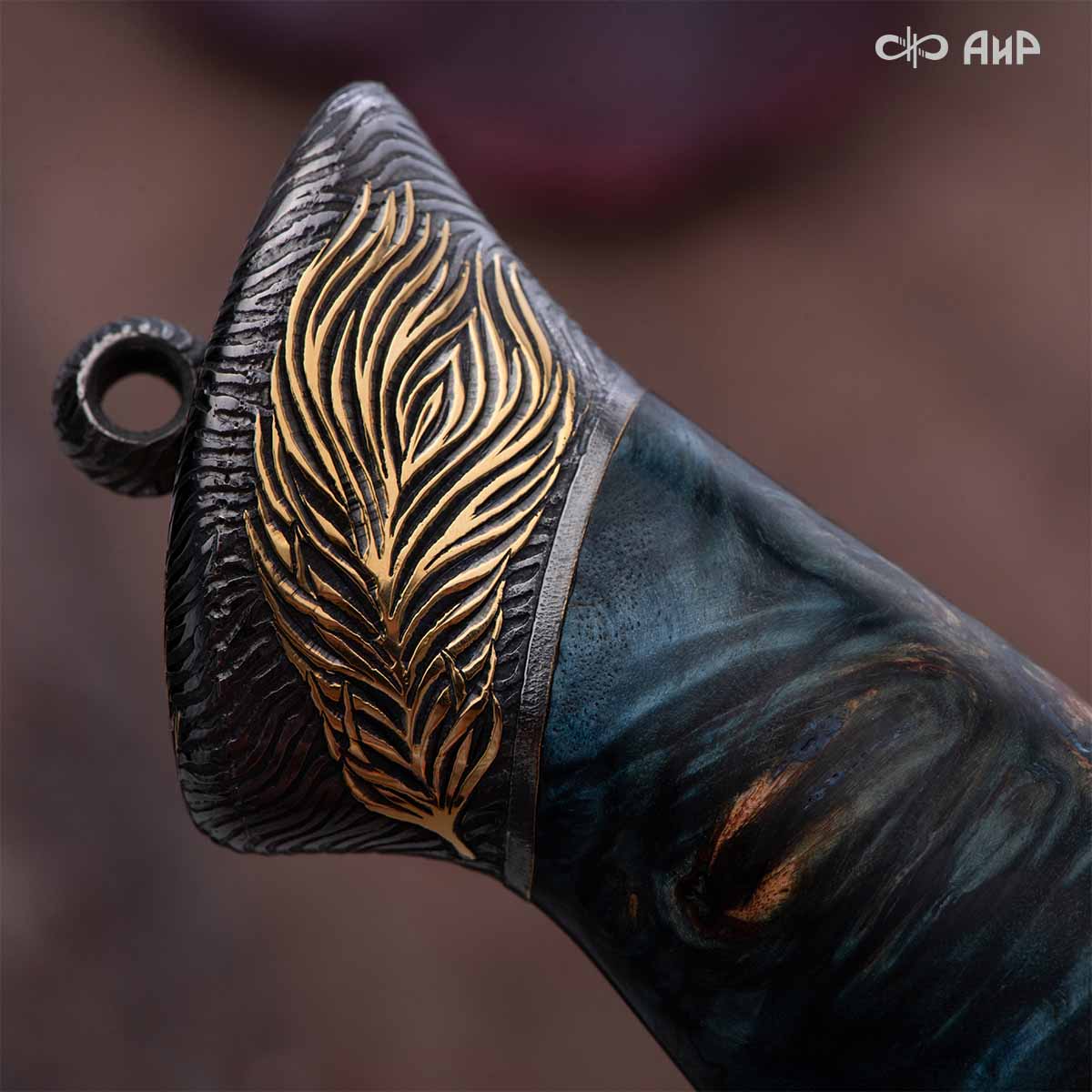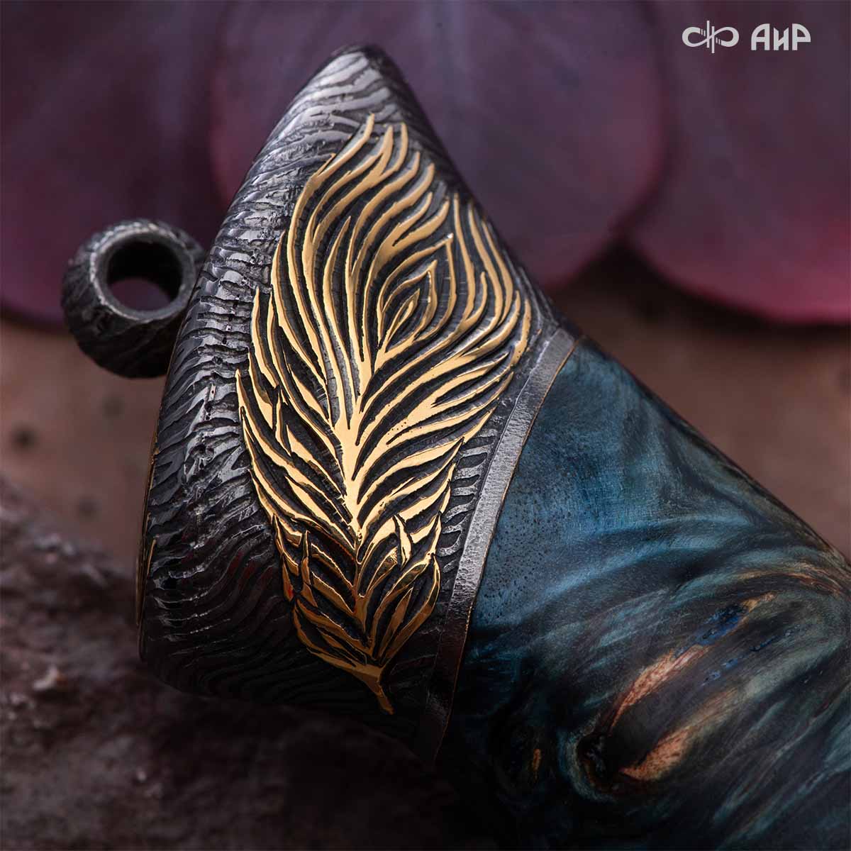 Прекрасный клинок из дамасской стали ZDI-1016 с узором "перо" и фактурная древесина стабилизированной карельской березы навеяли художнику Надежде Парфентьевой образ священного павлина. Красотой этого ножа можно любоваться столь же долго, как и раскрытым веерообразным хвостом павлина.