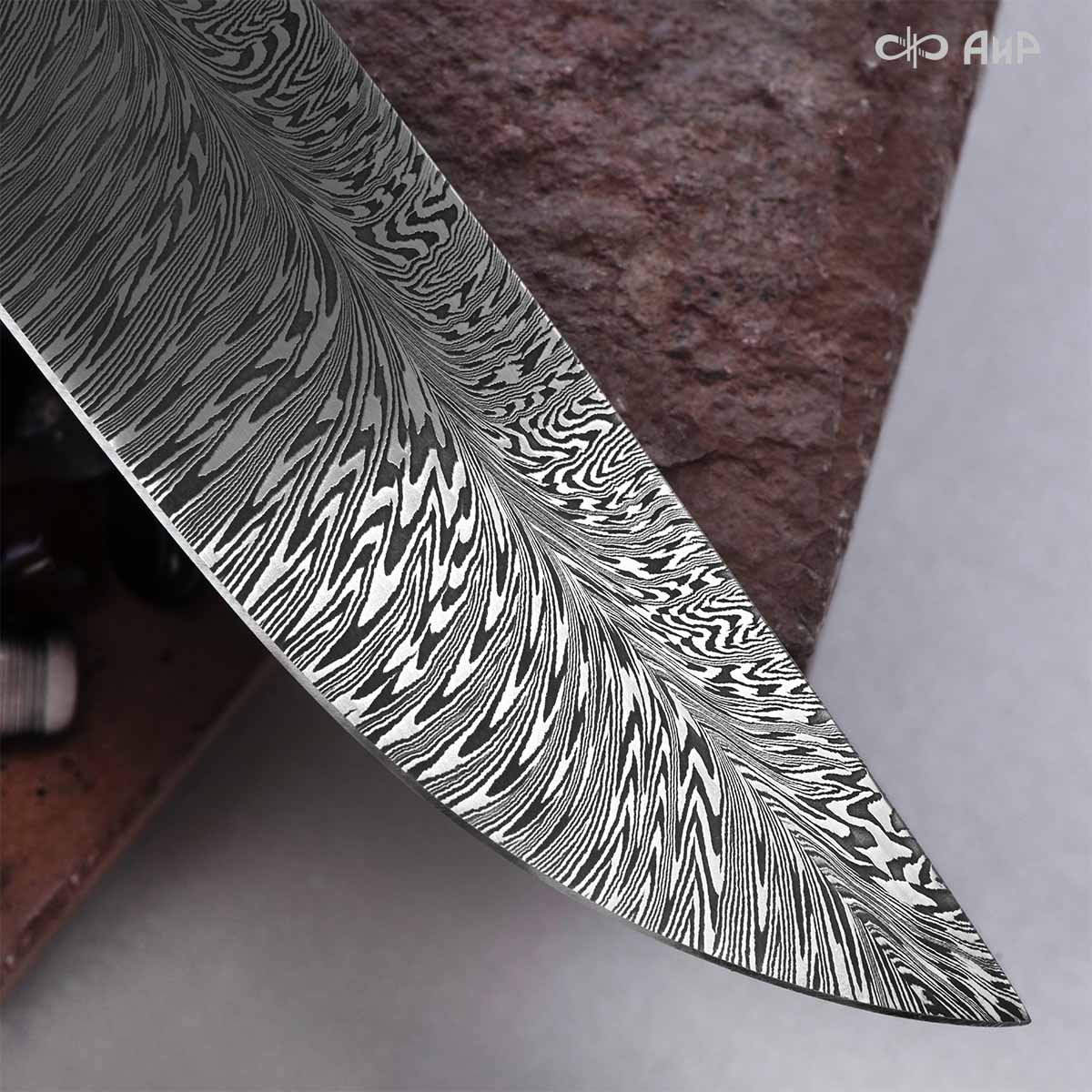 Авторский нож с красивым клинком из дамасской стали ZDI-1016 (узор "перо") посвящен образу павлина, который встречается во многих мифах и видах мирового художественного искусства. Кастомная заточка, авторские кожаные ножны.