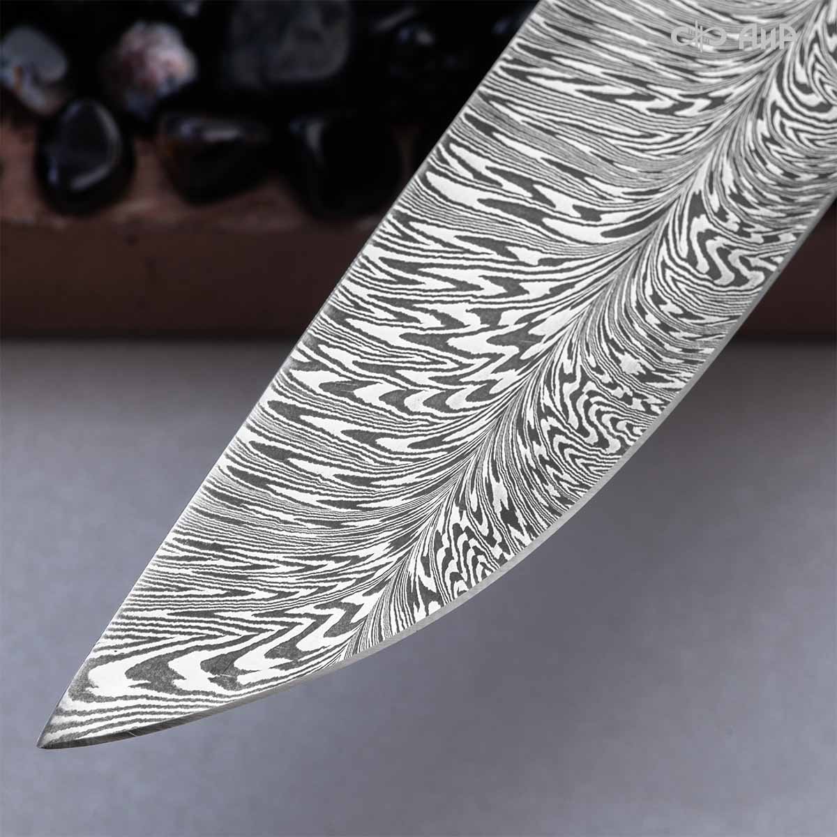Авторский нож с красивым клинком из дамасской стали ZDI-1016 (узор "перо") посвящен образу павлина, который встречается во многих мифах и видах мирового художественного искусства. Кастомная заточка, авторские кожаные ножны.