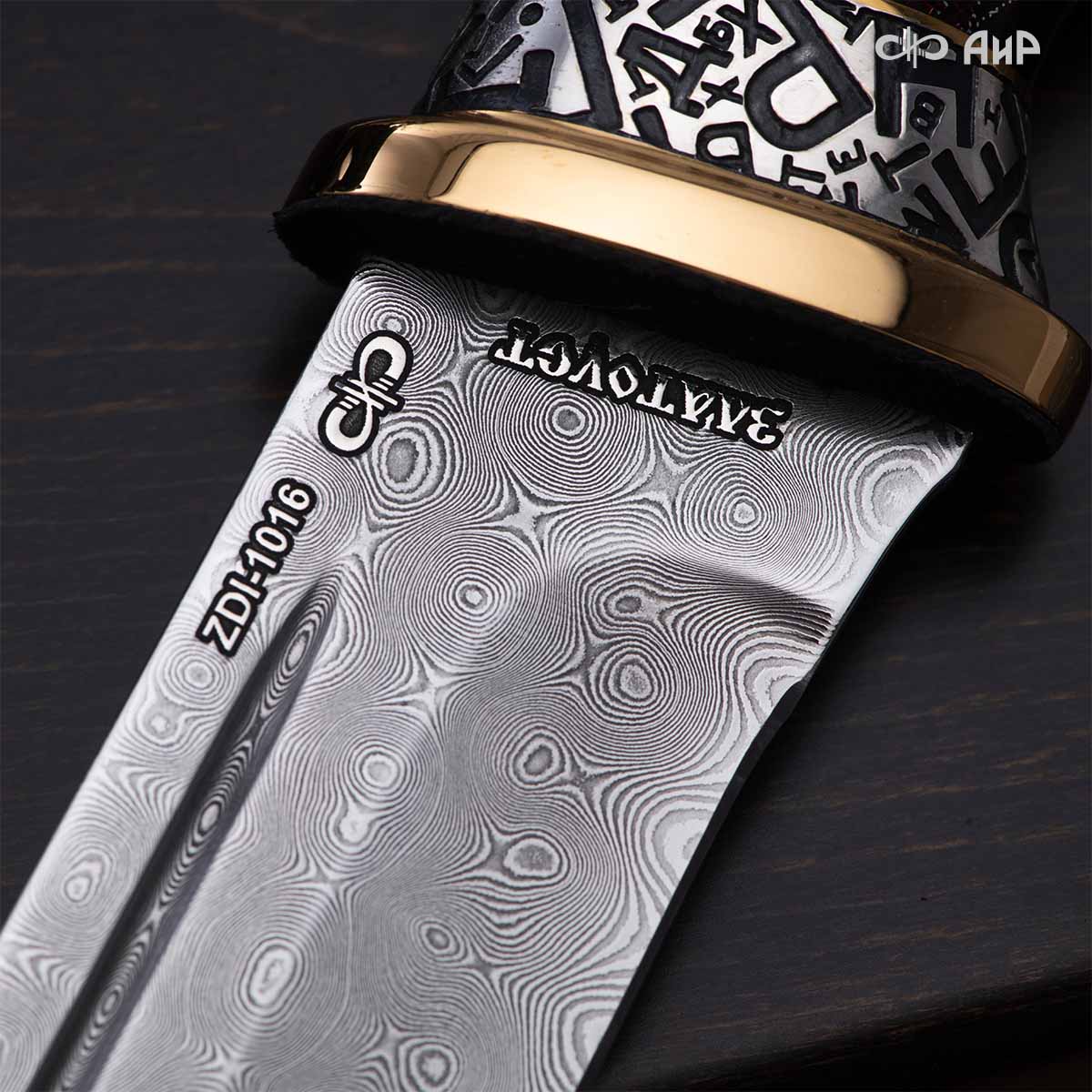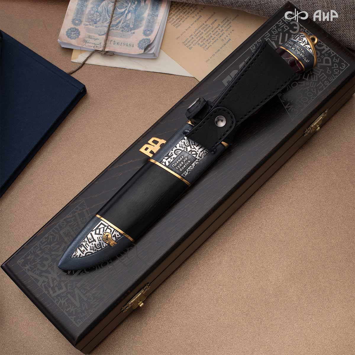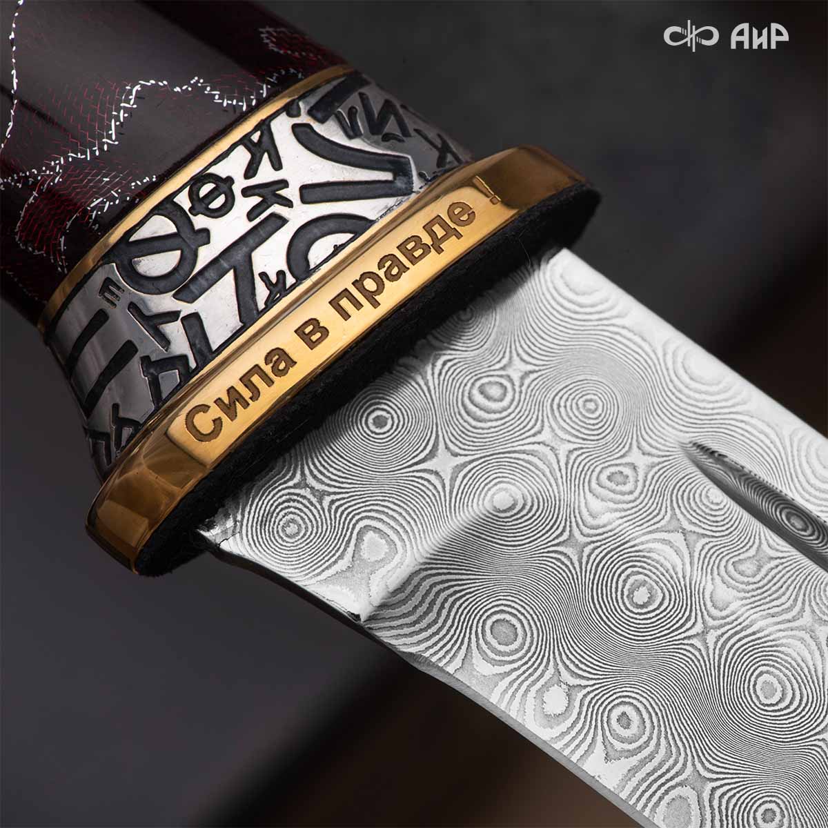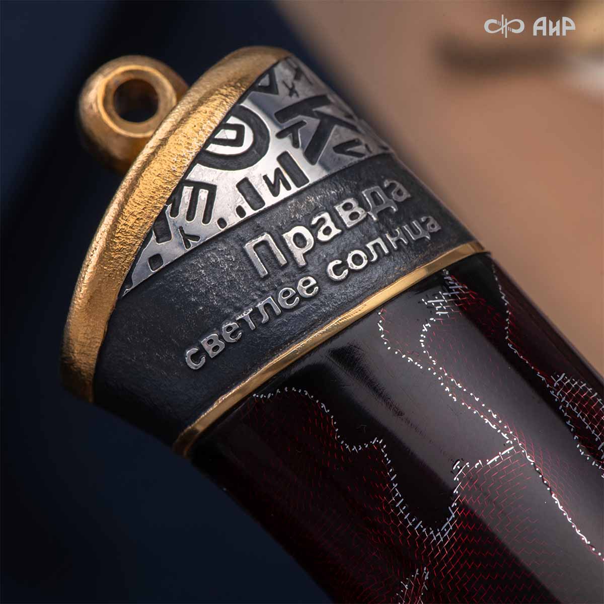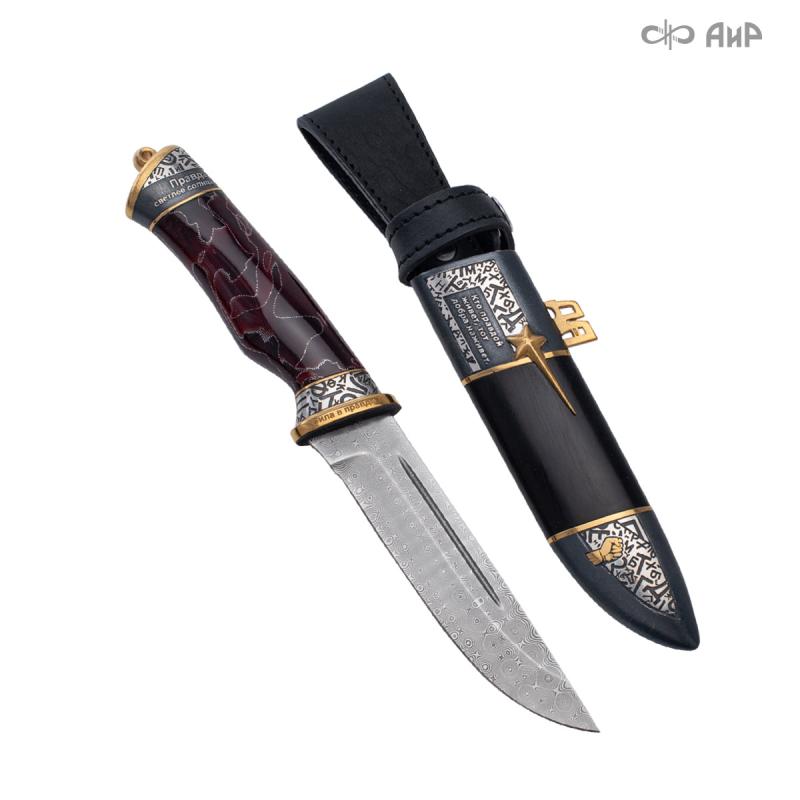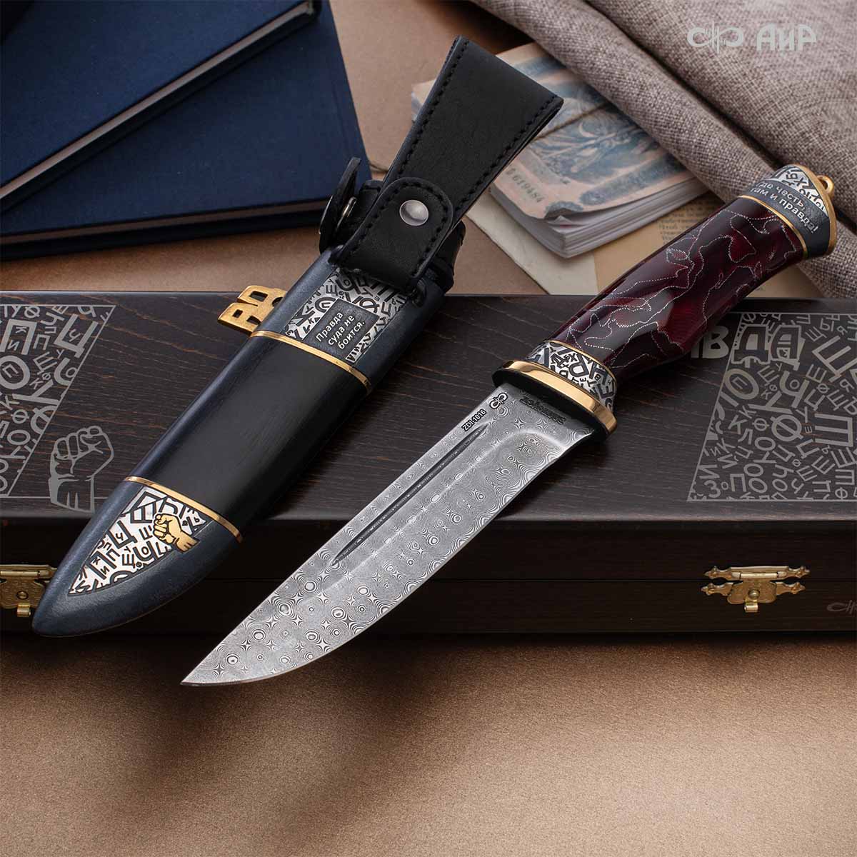 Авторский нож "Правда" с рукоятью из композита с алюминиевой микросеткой (узор "волны", цвет красный), с клинком из дамасской стали ZLADINOX и ножнами, оформленными в газетном стиле шрифтами советской эпохи.